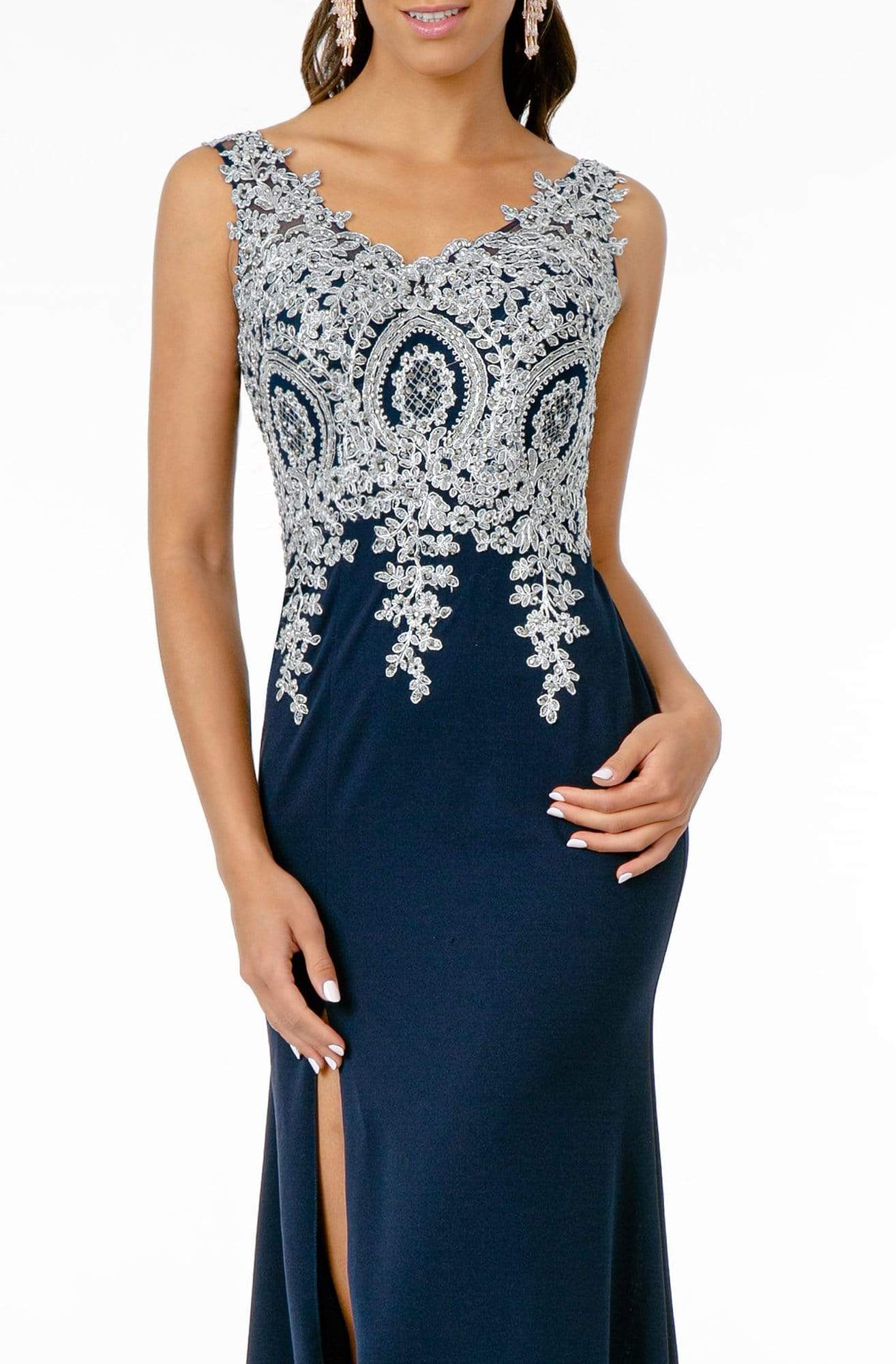 | Details: | Jersey, Sleeveless, Lace Appliqued Bodice, High Slit, V-Open Back, Back Zipper Closure, Full Length Hem |