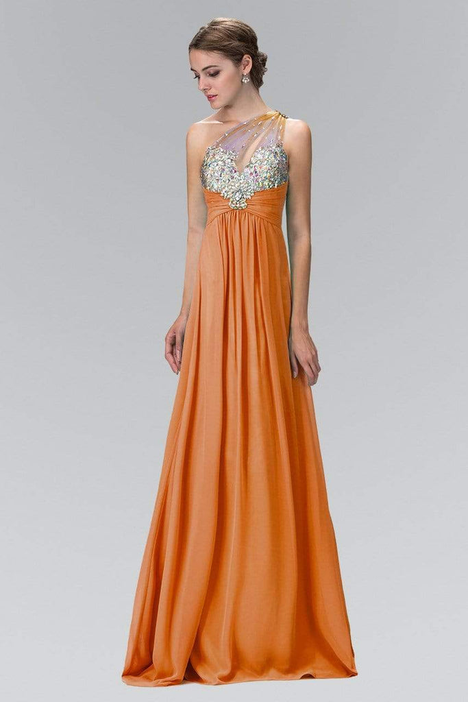 Look absolutely iridescent at every occasion in this highly-ornate Elizabeth K GL1138 creation. Showing off a stunning display of crystal-crusted bodice with a sheer pleated one-shoulder strap, this stylish piece flaunts an asymmetrical illusion over a sweetheart neckline and a semi-open back. Ornamented with a cinched band accented with a medallion detail, the A-Line skirt flows languidly down to a full-length hem and a sweep train. Steal everyone's heart every single time in this gorgeous Elizabeth K masterpiece. Model is wearing the Ivory and Tiffany colors.