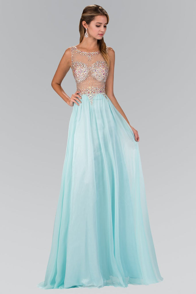 Gather up a cluster of admiring stares on the red carpet in this lavishly shimmering Elizabeth K GL2093 creation. Featuring a sheer bodice with clusters of crystals concentrating on the neckline, waist and bust, this iridescent piece shows a bateau illusion over a sweetheart neckline and an ornate mesh full back. Bordered with inverted scalloped trims, the flowing A-line skirt pleats stunningly down to cover the feet. Shine with pure boldness in this stunningly glistening Elizabeth K masterpiece.