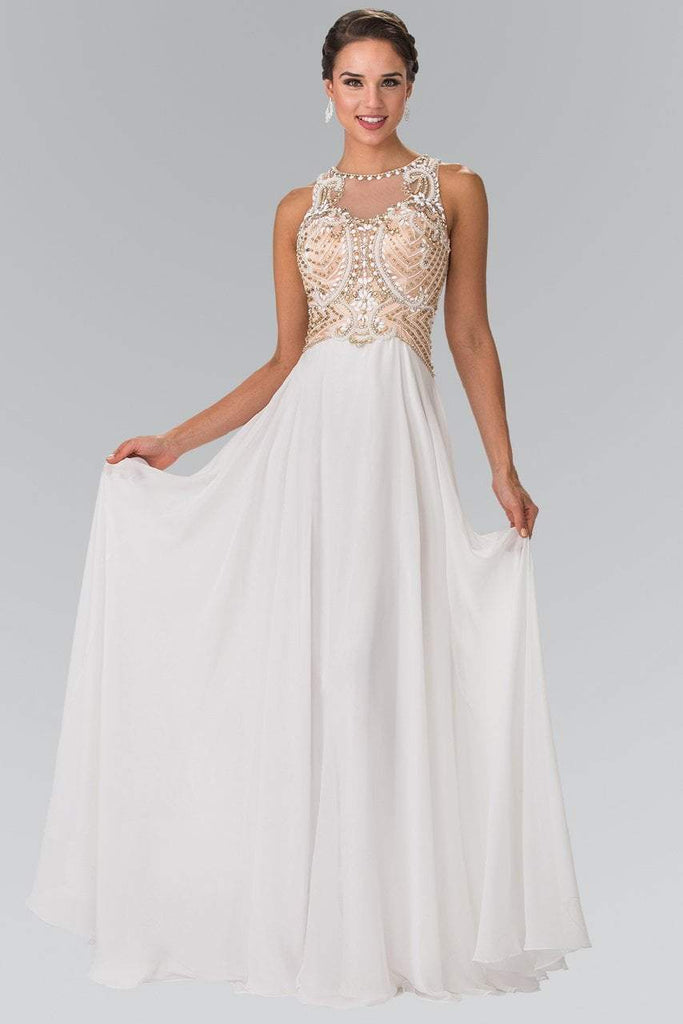Get ready for everyone to stop and stare when you show up in this evening dress by Elizabeth K GL2295. This lovely long gown features a high neck, mesh open back, and A-Line skirt. Elegantly intricate beading adorns the whole front champagne colored bodice and sprinkles designs on the back. Another great creation by Elizabeth K.