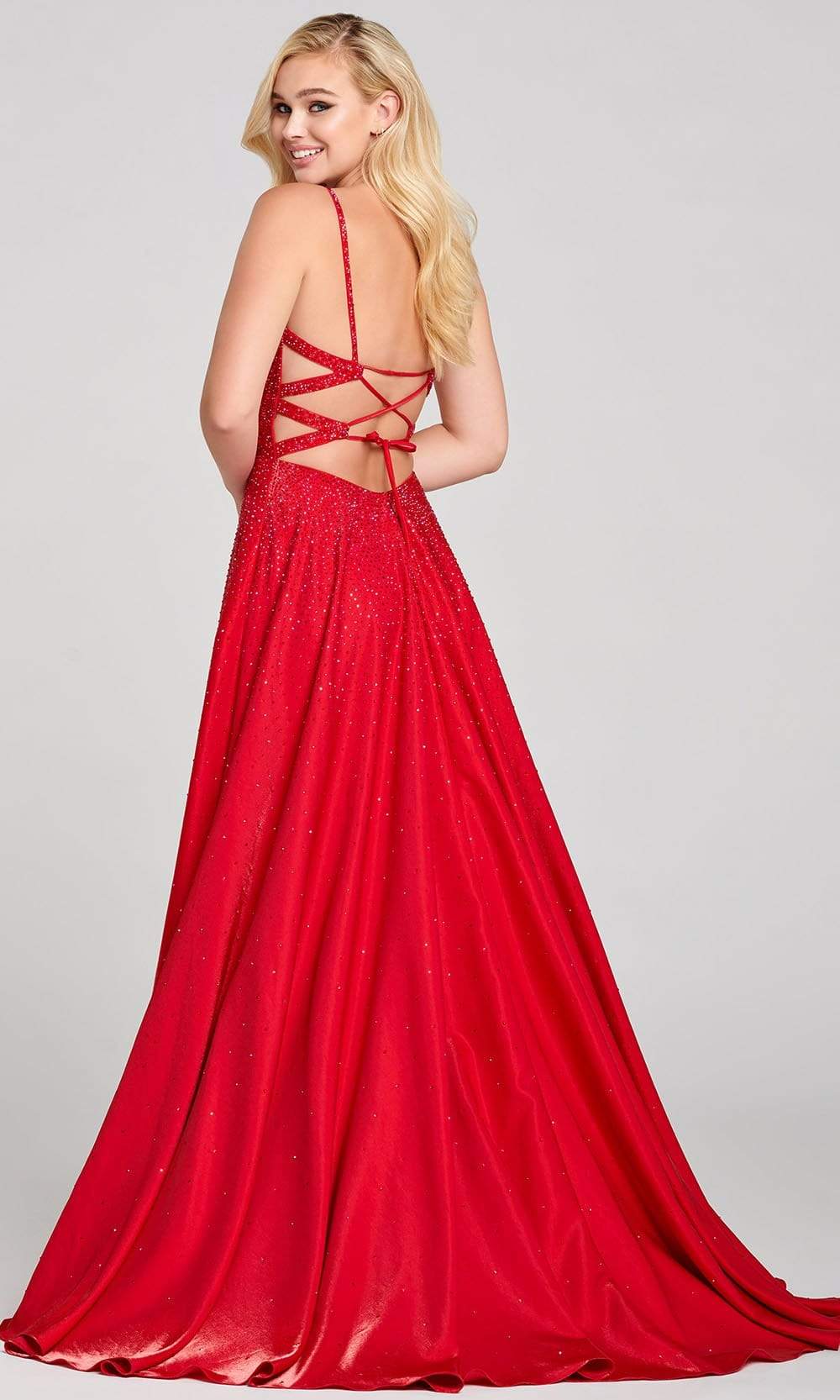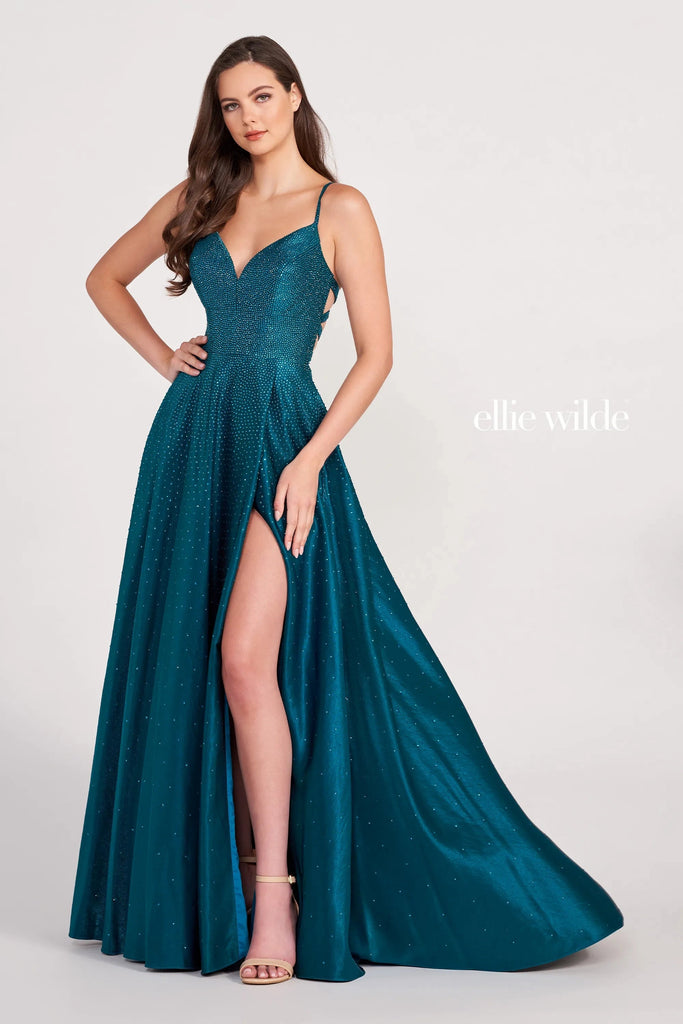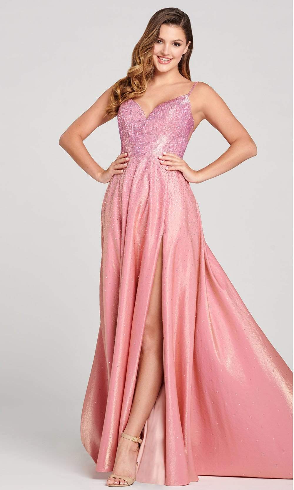 Sparkle for the special occasion in this ultra-glamorous masterpiece by Mon Cheri EW121001. This luxurious satin gown is lavishly embedded with crystal stone accents featured with a sleeveless, seam sculpted fitted bodice showcasing a sweetheart neckline held by slender shoulder straps. The back of the gown flaunts an open style with multiple strap detail. The vibrant skirt opens in a voluminous A-line silhouette with a thigh-high leg slit for added allure . This Mon Cheri gown gives you an intricate look that will last a lifetime.