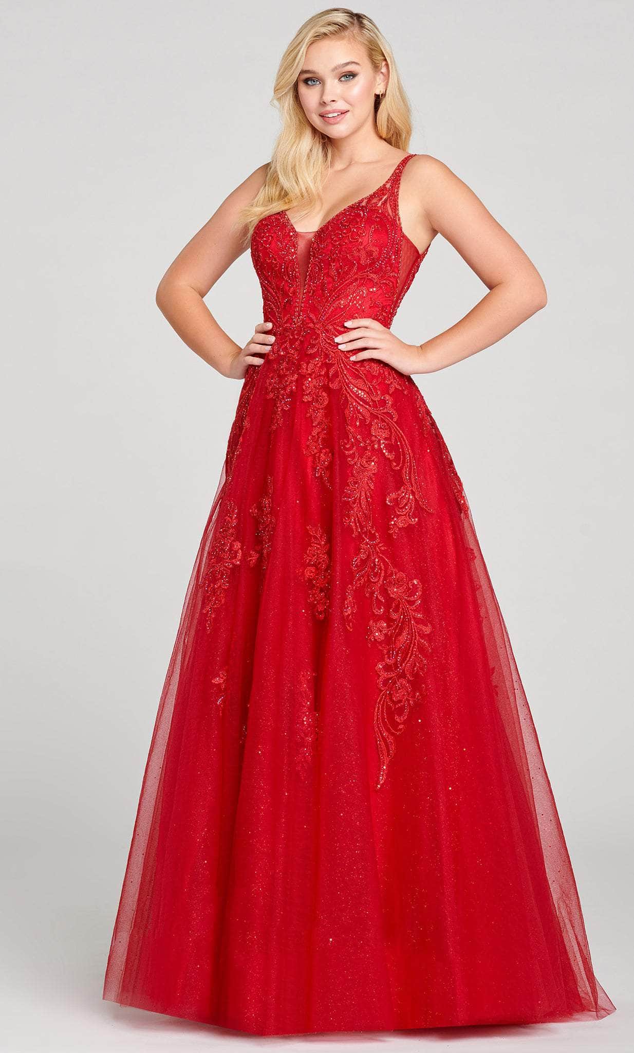 Portray a vision of loveliness in this classy piece by Ellie Wilde EW121003. Exhibiting a lace applique and beadwork embellishment, this glitter tulle gown is sure to have all eyes on you. It flaunts a plunging v-neckline with a sultry sheer panel at the bust and both sides of the midriff. A low scoop cut highlights the back which shows a glimpse of skin and is fastened by a zipper closure. The skirt flourishes an A-line silhouette in a full length hem. Flatter your finest assets as you enthrall the crowd in this Ellie Wilde EW121003 creation. Model is wearing the Ruby color.