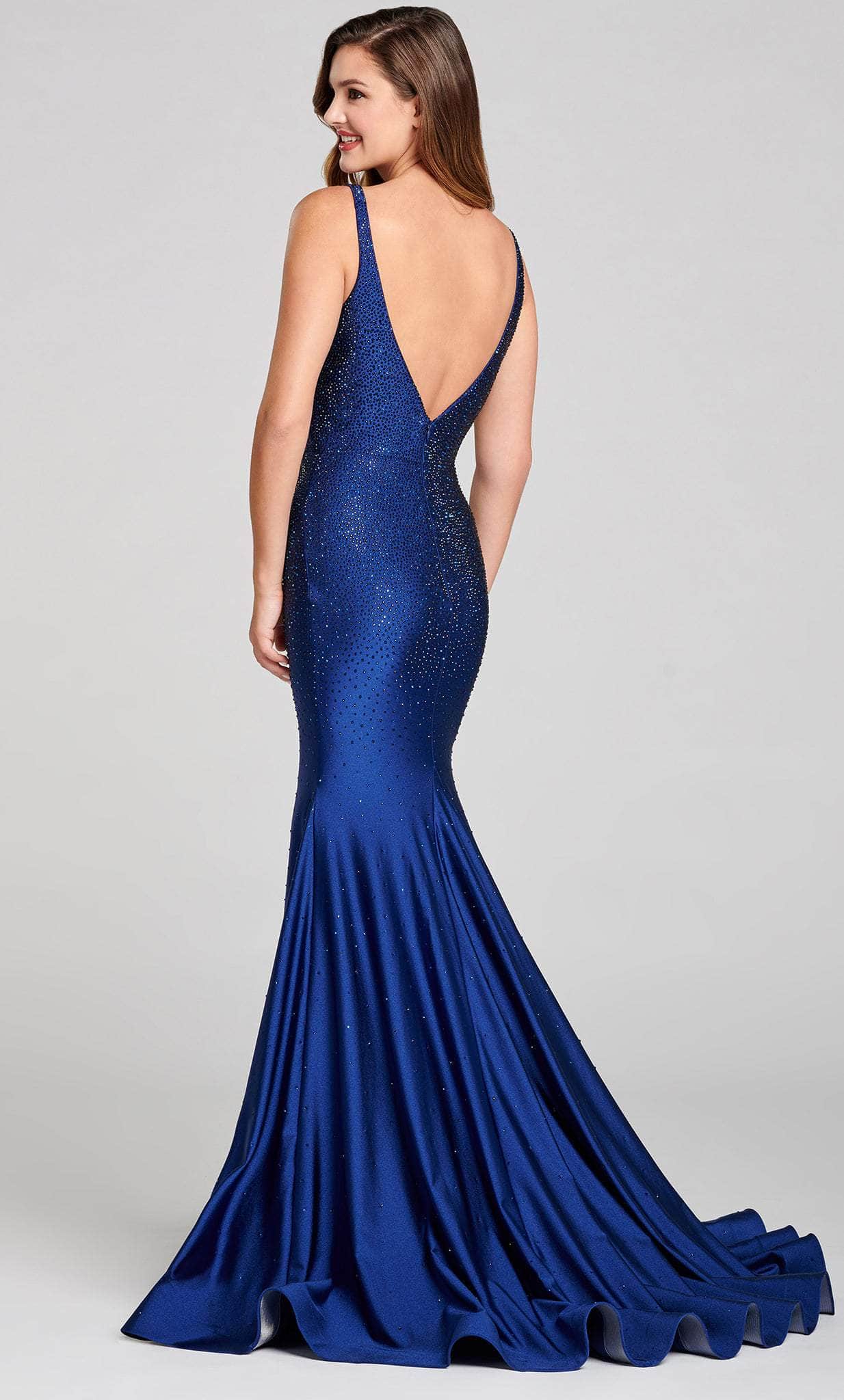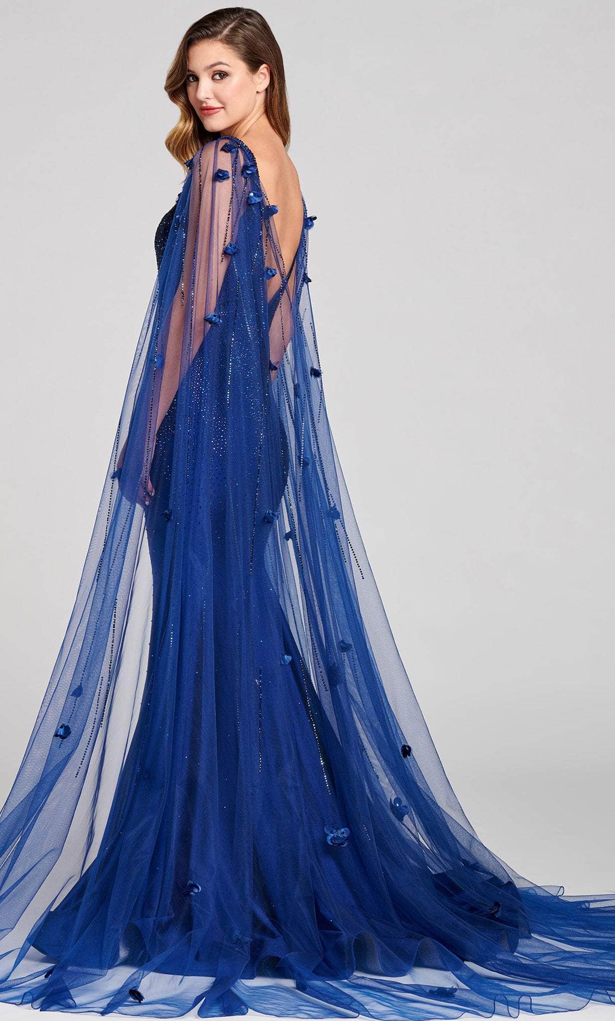 Take in the glitz as you stroll through this masterpiece by Ellie Wilde EW121007. This dress has a V-neck and back and is made out of a unique stretch jersey fabric with sparkling stones all over. The dramatic sweep train ends the mermaid skirt in a cascading fashion. Elegant details include a removable floor-length tulle cape with flower appliques. Get ready to steal the show in Ellie Wilde EW121007 beauty. Model is the wearing the Navy Blue color.