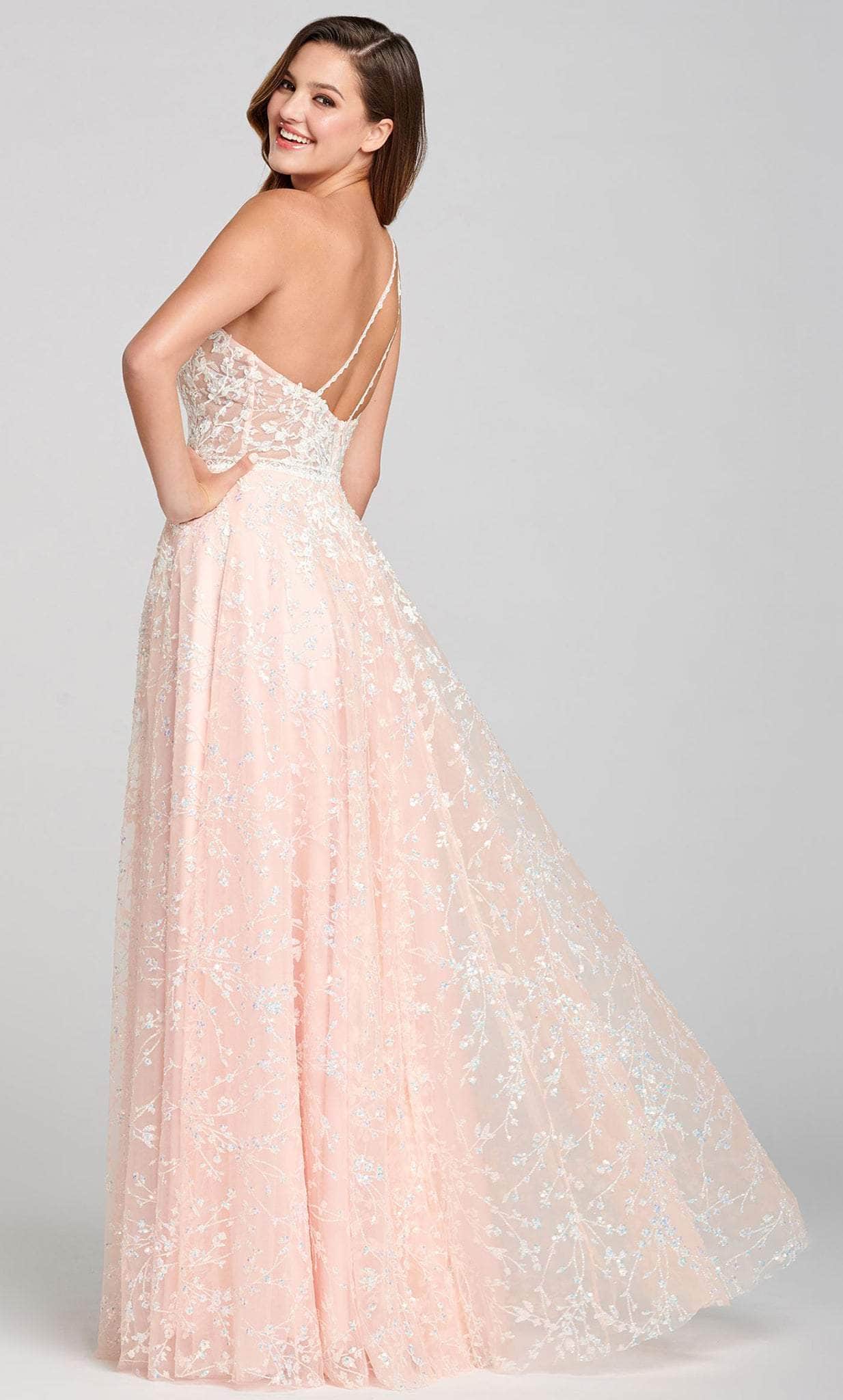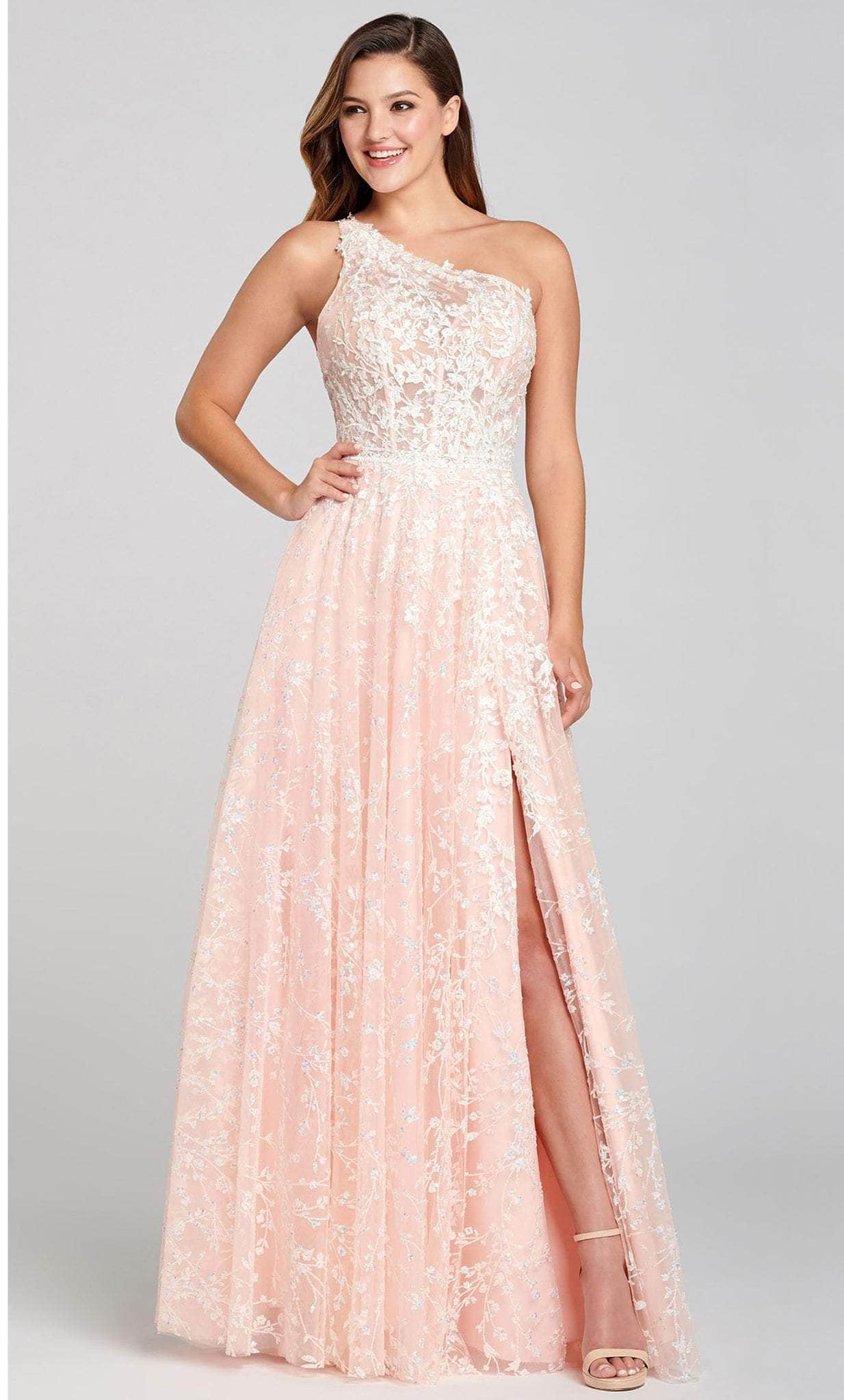 This enchanting Mon Cheri EW121030 is sure to make you the center of everyones attention. Opening with a stunning one-shoulder neckline, this one-of-a -kind sleeveless gown is set to impress in a flattering A-line silhouette. The dress is styled with delicate french lace, casting sheer floral patterns from head to toe. The fitted bodice has a boned corset-style bodice, while the skirt shows a flash of skin with a high front sit. Show off your gentler side with this lovely evening gown by Mon Cheri EW121030 Model is wearing Pink Sand color.