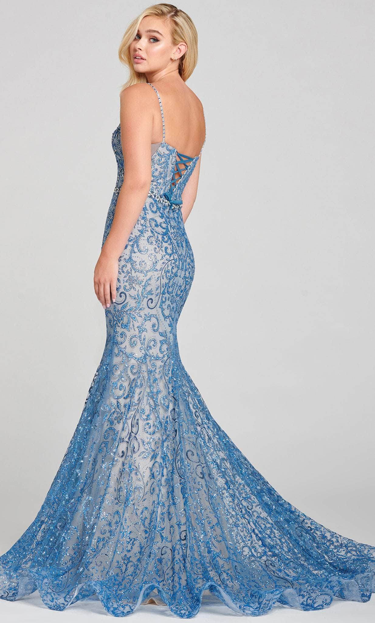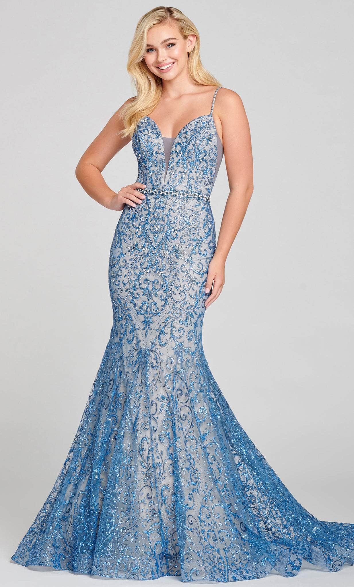 You are sure to be the life of the party when you are wearing this dazzling Mon Cheri EW121045. If you are looking for that figure flattering evening gown, this stunning sleeveless mermaid gown is the one for you! Starting with sleek shoulder straps dotted with rhinestones, this dress opens with a plunging sweetheart neckline with a mesh inset. A crystalline band of beadwork encircles the waist, while the fabulously glittered skirt hugs the hips. A stunning network of glitter filigrees and rhinestones dance across the silhouette. You will undoubtedly stand out on every occasion with Mon Cheri EW121045 Model is wearing Ocean/Nude color.