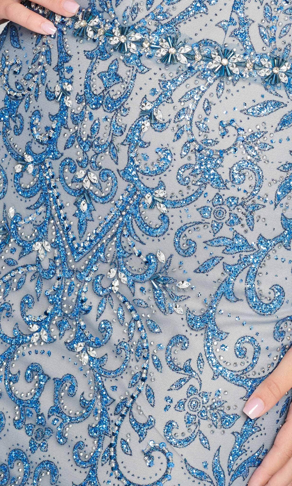 | Fabric: | Cracked Ice, Beading, and Stone Accents |