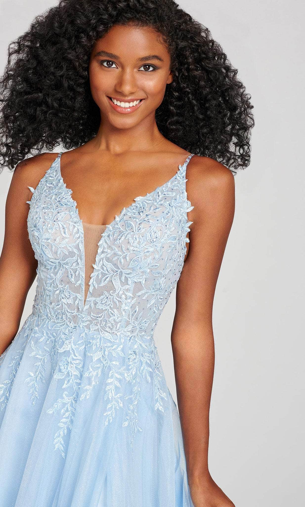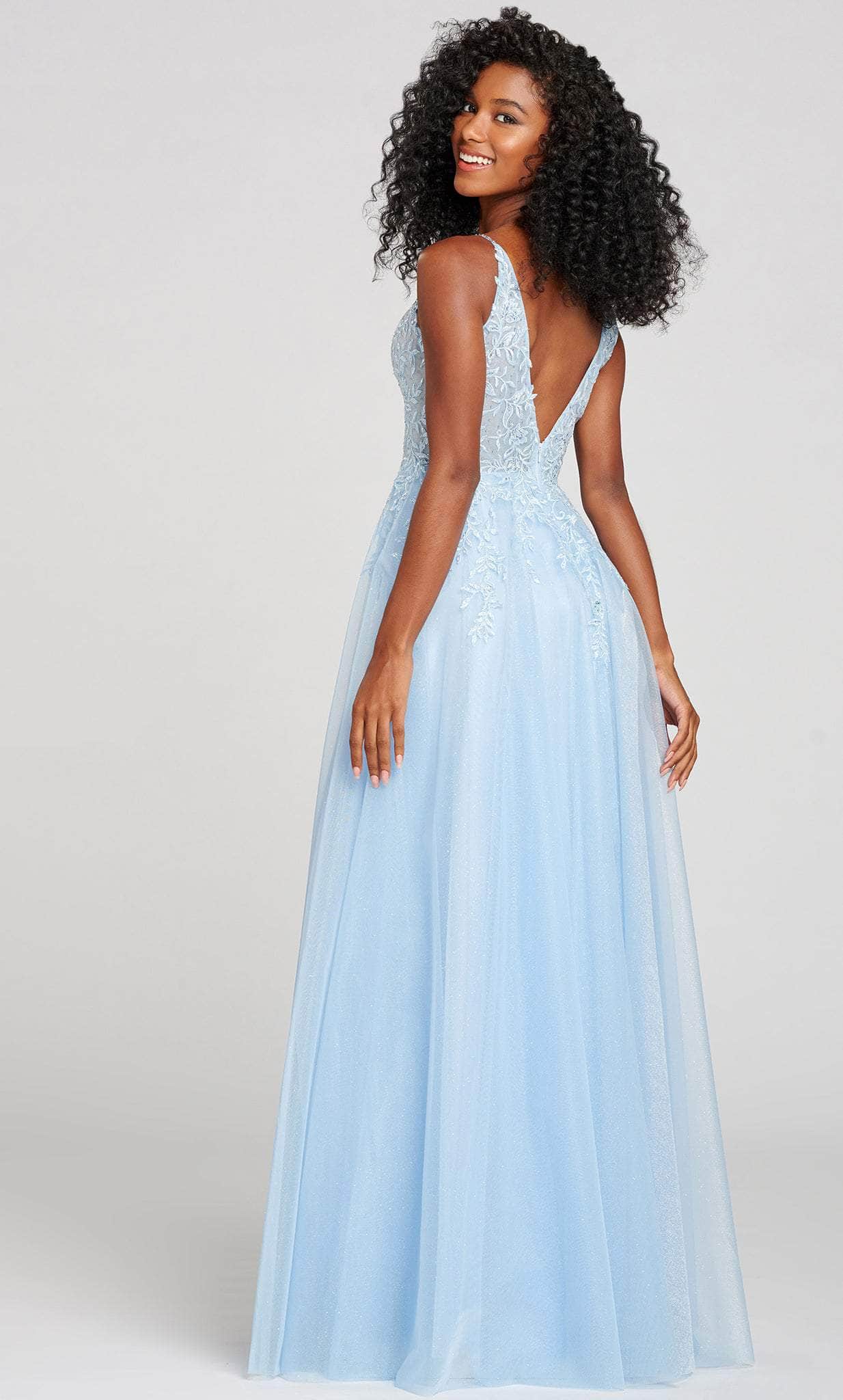 Be strikingly gorgeous in this stunning long evening dress by Ellie Wilde EW121059. This glamorous gown in luxurious glittered tulle showcases floral embroideries and stone accents. This fitted bodice features a deep V-neckline and back, supported by mesh inset for modesty. The dress fits along the natural waist and flares down into a full-length A-line silhouette with a sweeping train and high slit. Everyone will definitely stare at you in this sophisticated Ellie Wilde EW121059 masterpiece. Model is the wearing the Light Blue color.