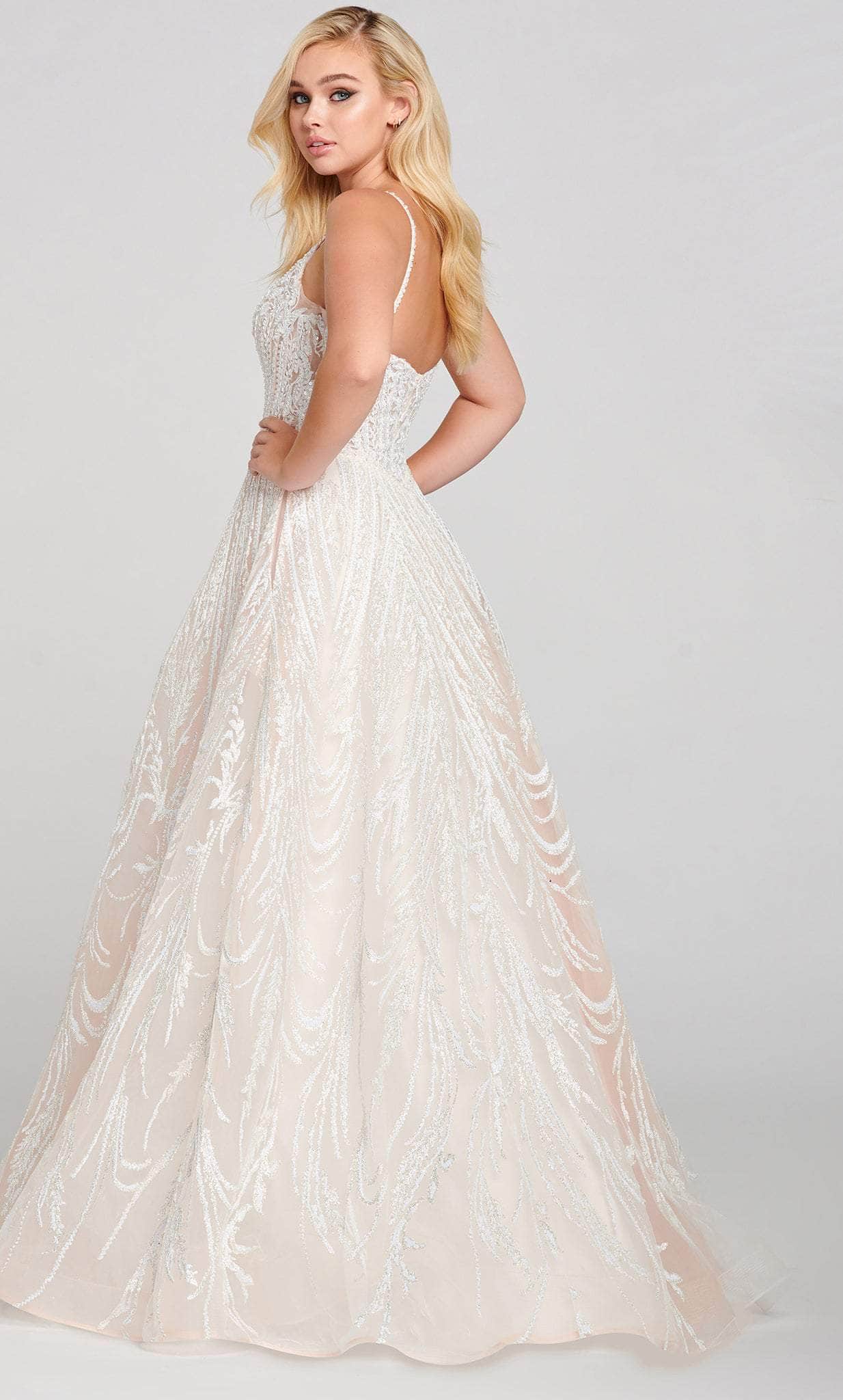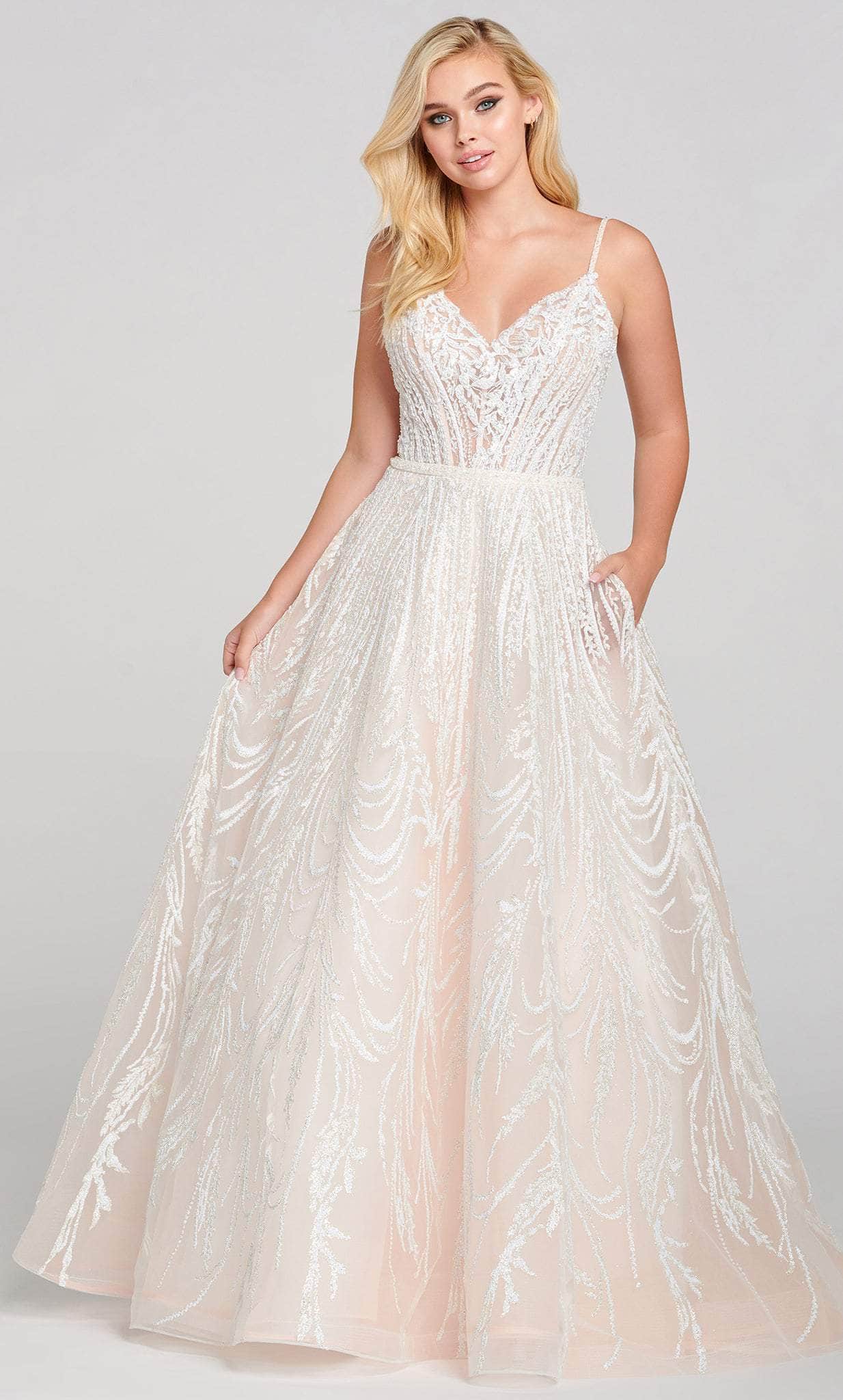 Optimize the attraction of your special day in this Bridal gown by Ellie Wilde EW121061. Tailored on a novelty cracked ice with stunning adornment, this gown offers a plunging V-neckline, supported by slender straps that lead to a mid-open back. Stone and bead accents, and the faux beaded belt at the natural waist add glamour and sparkle. The semi-ballgown skirt cascades to a brush of train, finished with side pocket. Get ready to be the topic of the event in this Ellie Wilde EW121061 masterpiece. Model is the wearing the Frost color.