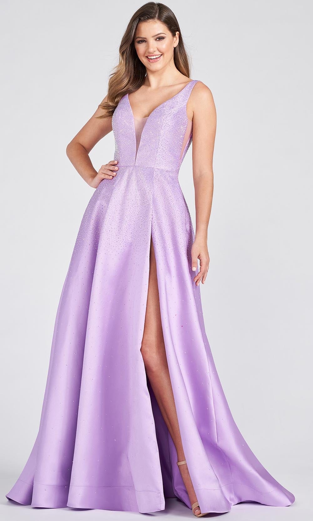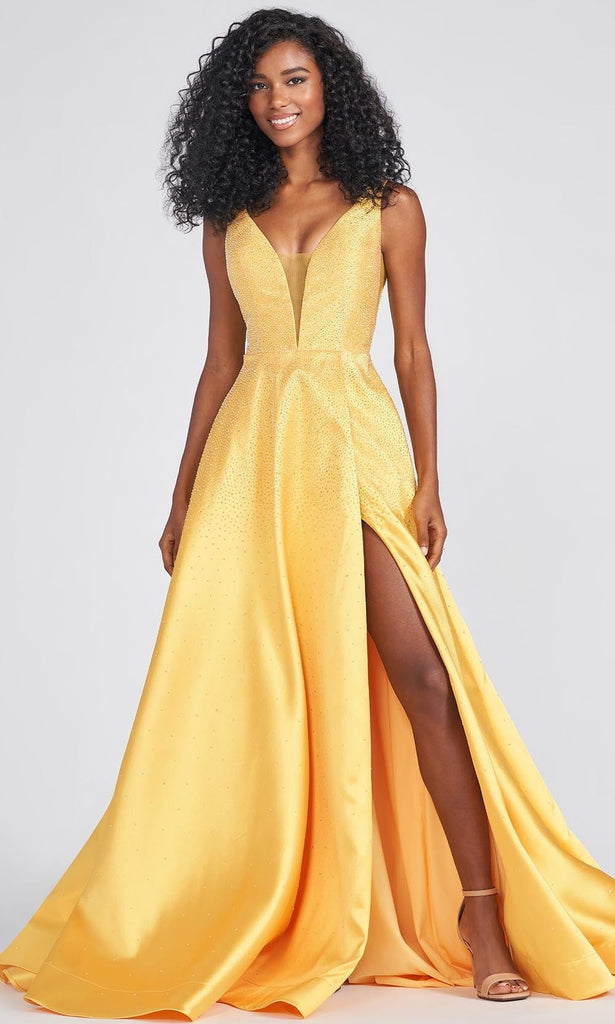 Indulge yourself in an upscale glamour in this Ellie Wilde EW122021 creation. Adorned with heat set stones on a sleek Mikado silhouette, this gown flourishes a plunging v-neckline with a sheer inset. Accented with a deep v-open back and a zipper closure, the A-line skirt traverse to the floor with a slit and train. Evoke a style that will turn heads in this Ellie Wilde masterpiece. Whether your style is modern trendy or timeless classic, Mon Cheri will clothe with poise, elegance and grace for your momentous occasion.