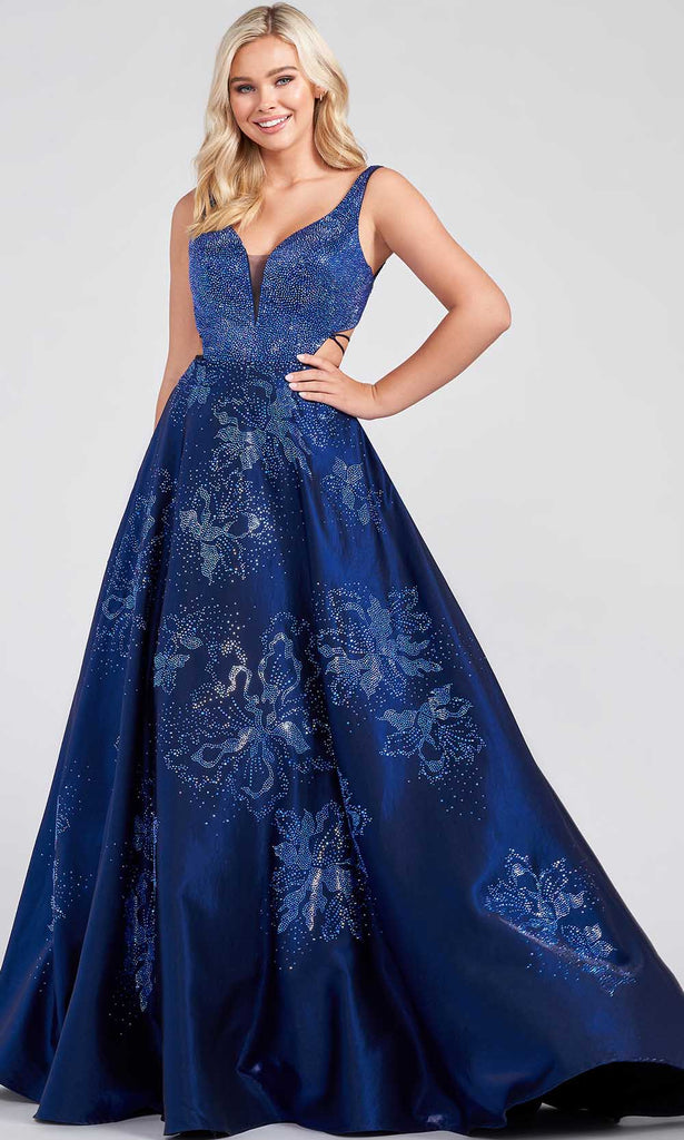 Walk the red carpet in style wearing this stunning Ellie Wilde EW122025 masterpiece. This gown has a sleeveless bodice adorned with rhinestones that creates a floral print pattern. This also features a plunging V neckline, side cutouts and wide shoulder straps. The back is rendered with a lace-up design while the full length A-line skirt flows into a sweep train. Be in the spotlight wearing this extravagant Ellie Wilde creation. Whether your style is modern trendy or timeless classic, Mon Cheri will clothe with poise, elegance and grace for your momentous occasion.