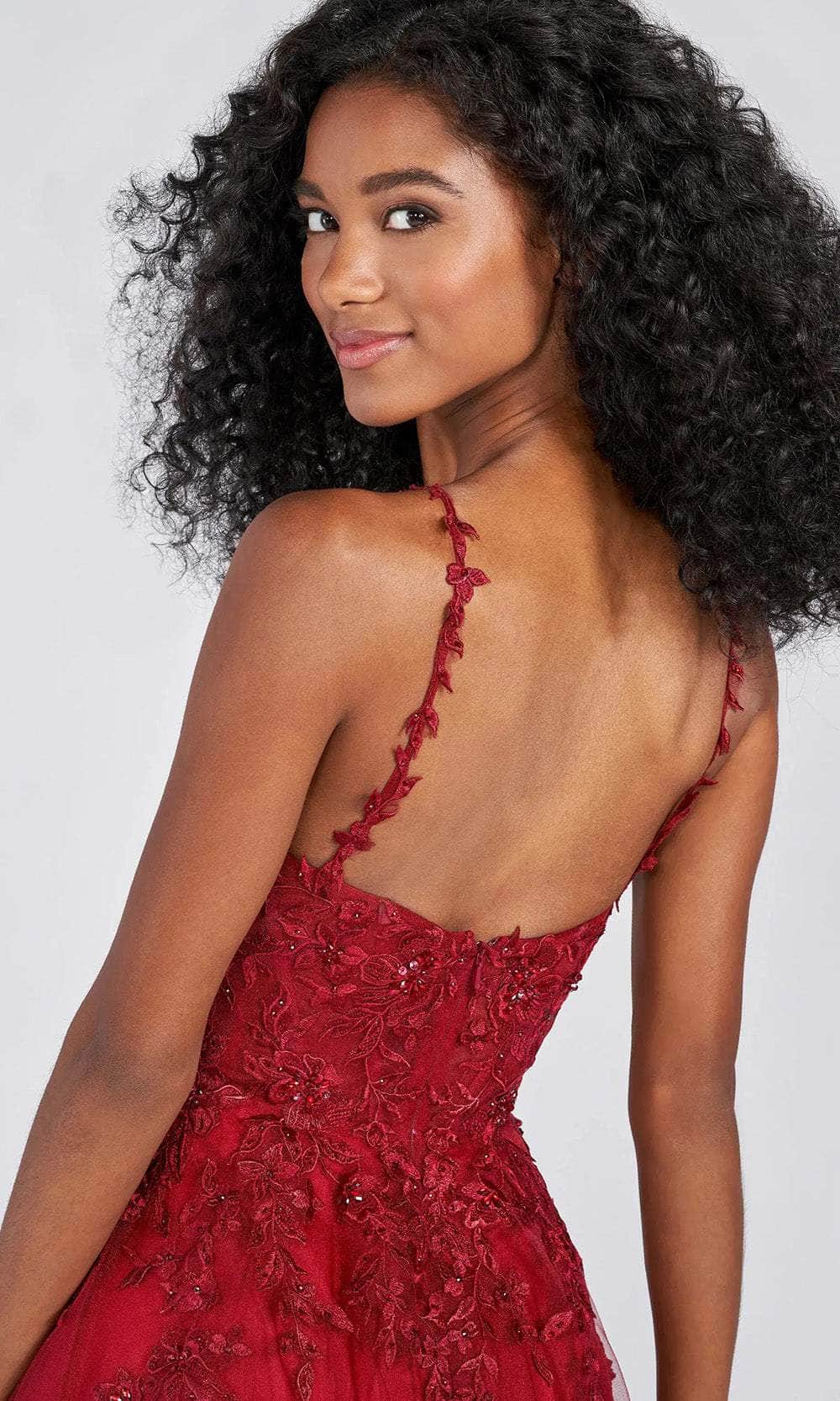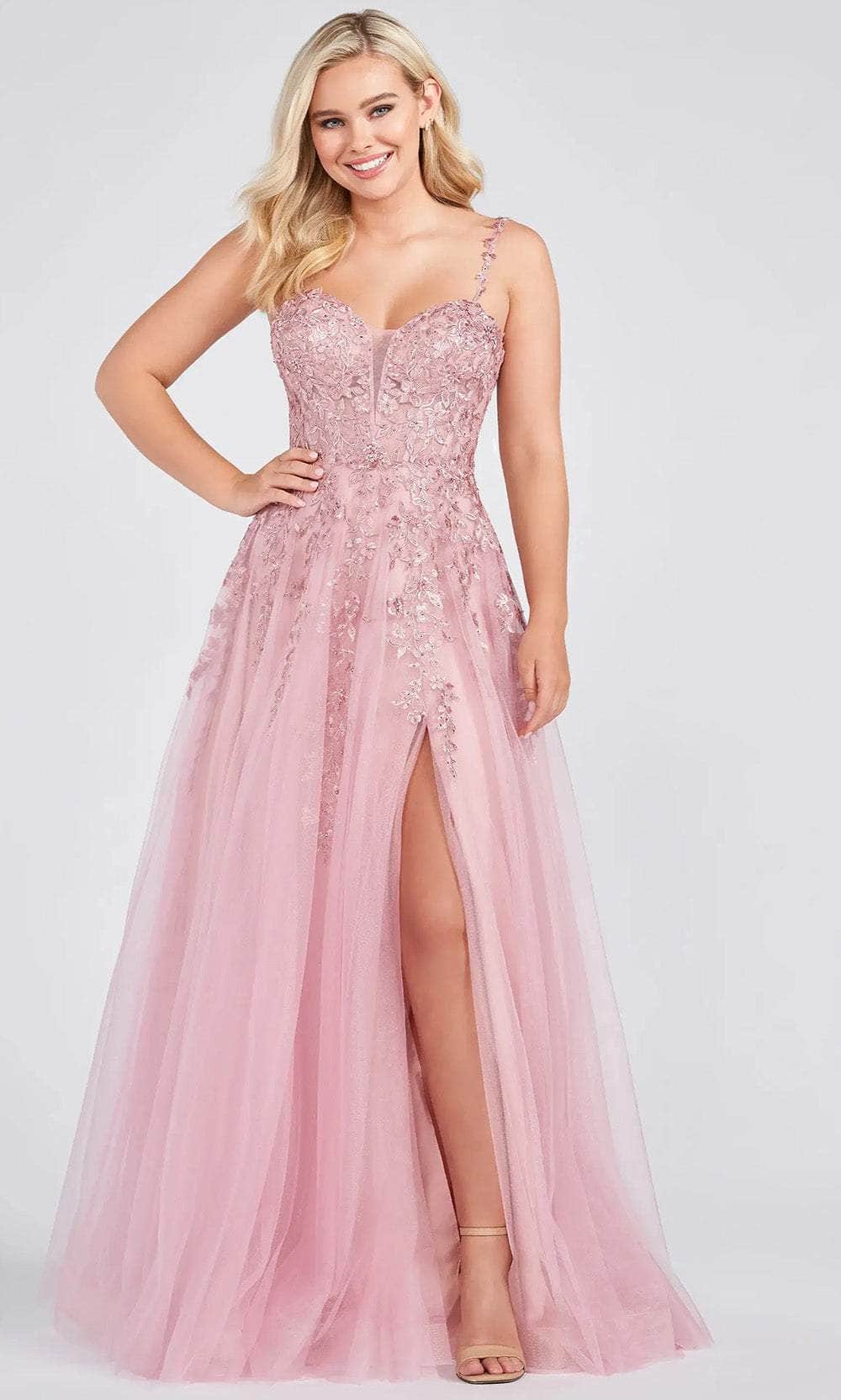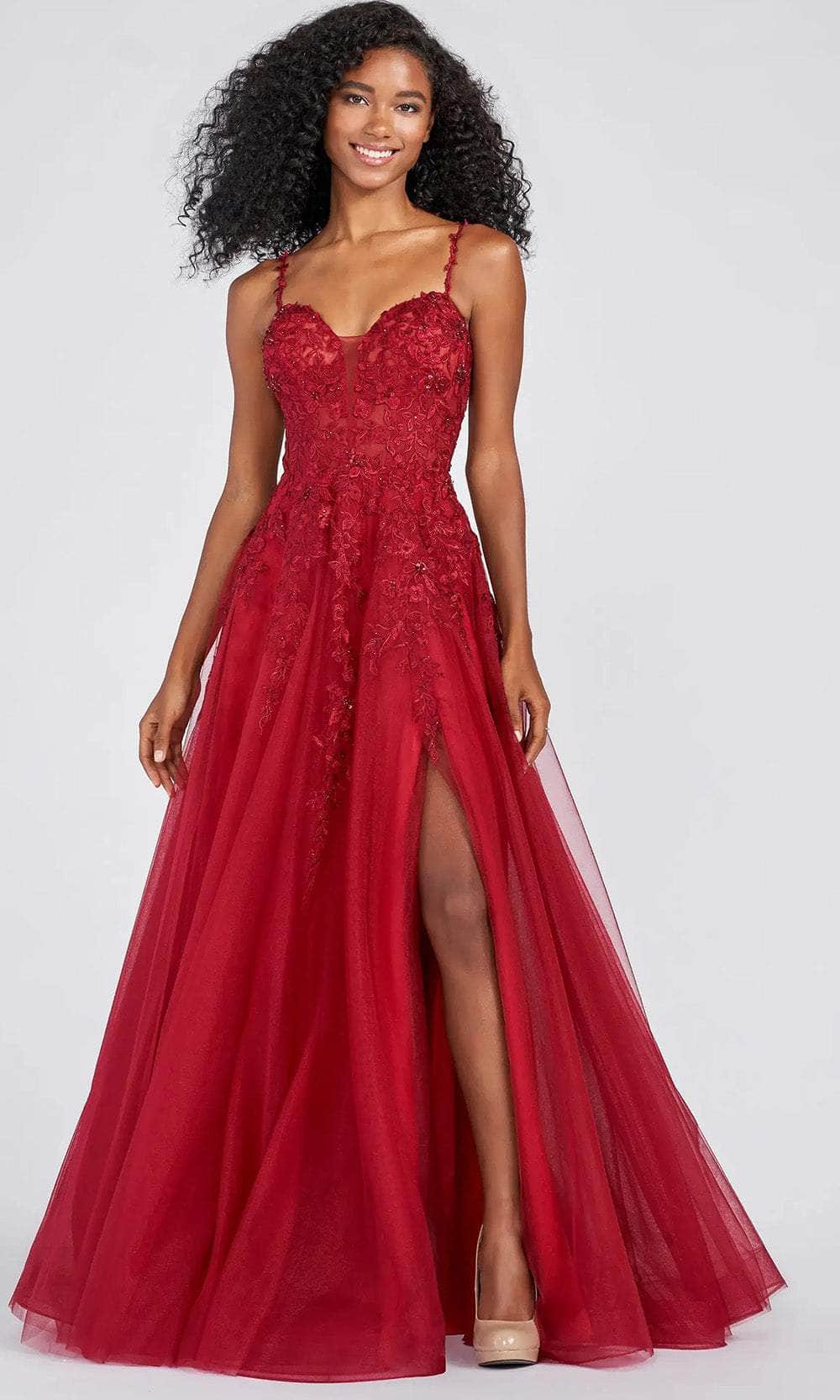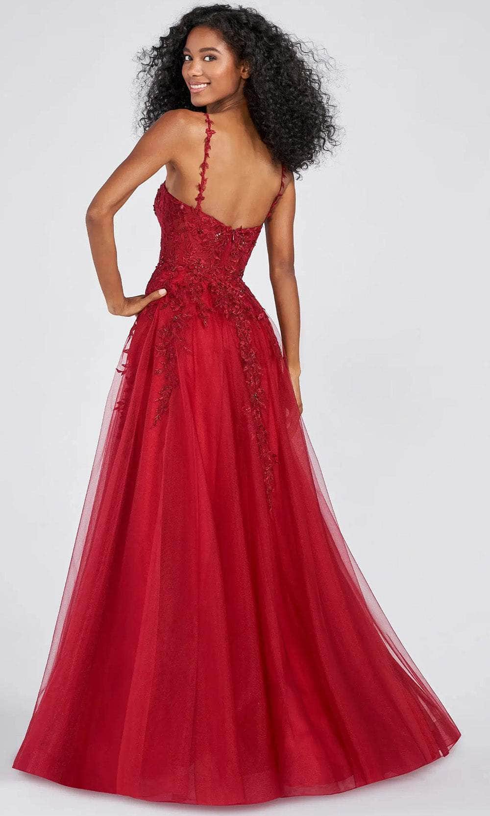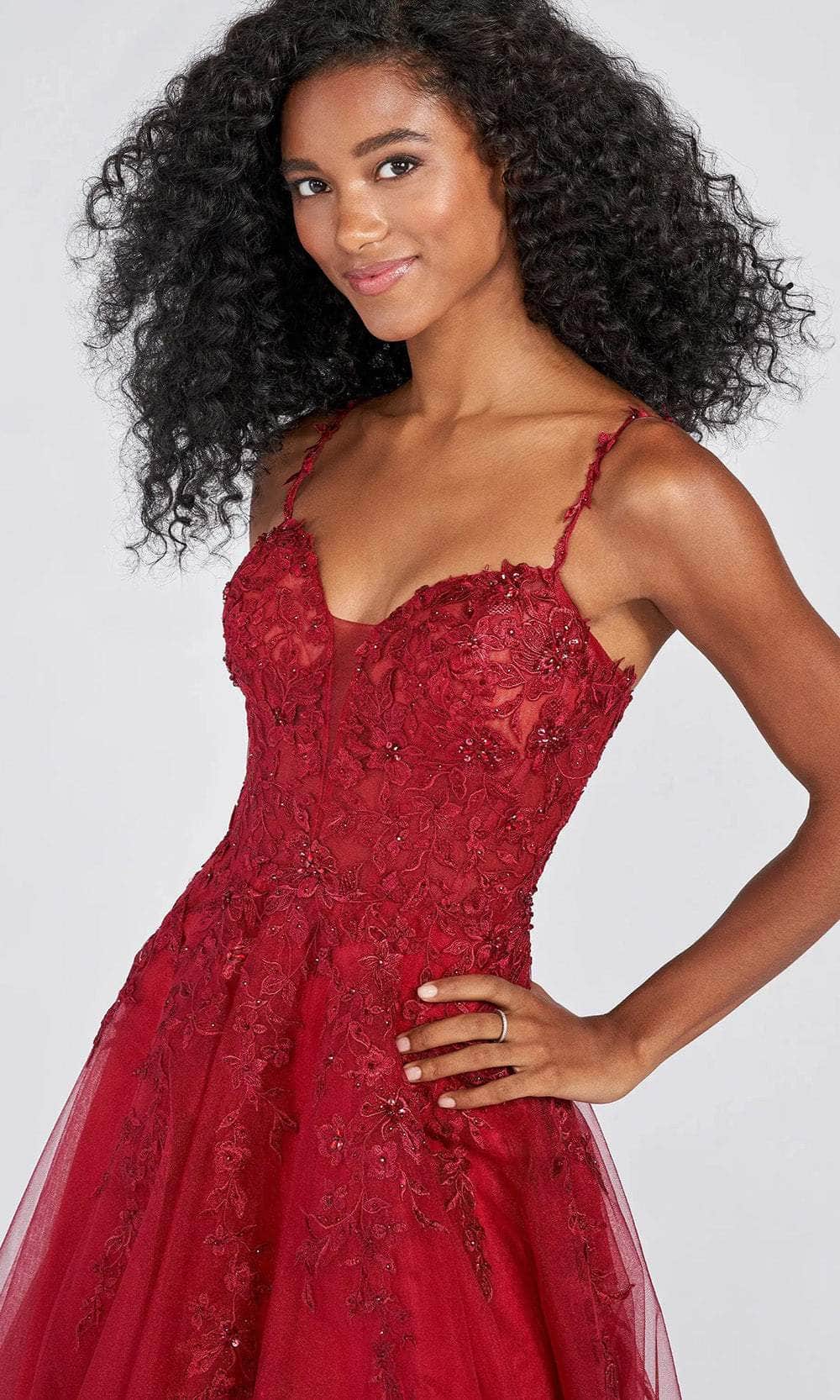 Display your creative side in this fabulous dress design by Ellie Wilde EW122093, and you'll become a picture of elegance. Stylishly embellished with dexterous floral appliques in tulle fabric. It has a deep V-neckline with floral applique straps that lead to a stunning back that boasts a zipper closure and a mid-open back. The shimmering tulle skirt parades in an A-line shape with a slit to draw attention to it. In this Ellie Wilde masterpiece, wrap yourself in a tempting beauty that would perfectly depict the fairy tale you are dreaming about. Models are wearing Rose and Wine colors.