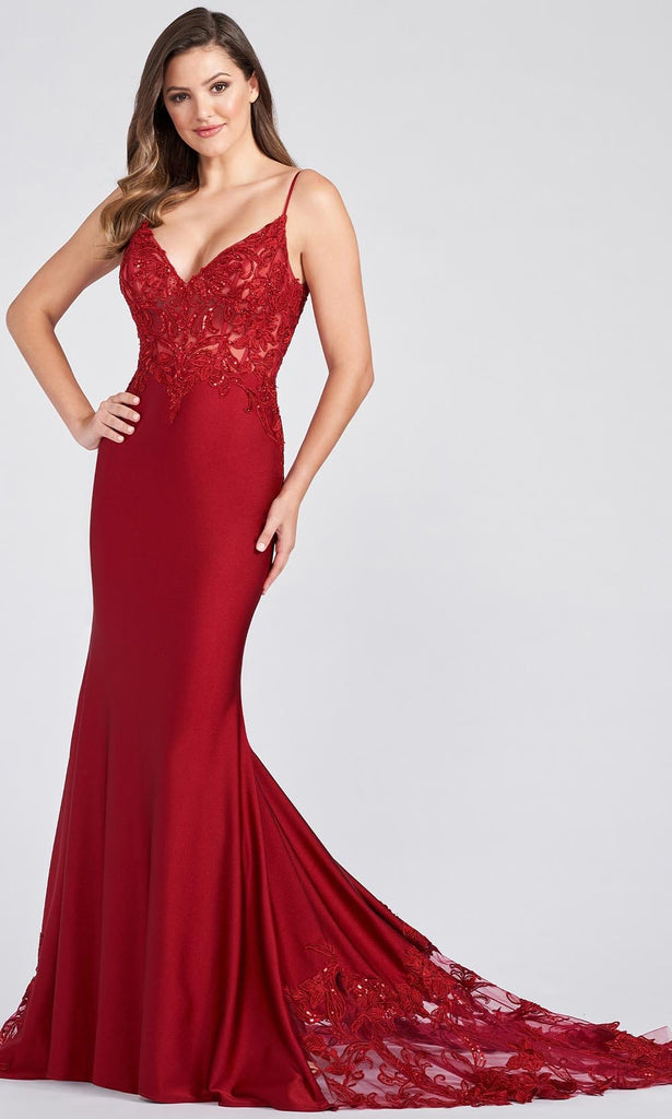 Make your debut in a red carpet gown from Ellie Wilde EW122094. This fitting dress, crafted from stretch fabric, will nicely highlight your shape. The bodice is adorned with delicate lace appliques that fall beautifully down the sides and back of the design. The v-cut neckline is adorned with thin straps that wrap around the open back and are secured by a mesh illusion closure. The spectacular train is crafted from a mesh fabric that is detailed with lace. Be ready to sparkle in style in this Ellie Wilde gown. Whether your style is modern trendy or timeless classic, Mon Cheri will clothe with poise, elegance and grace for your momentous occasion.