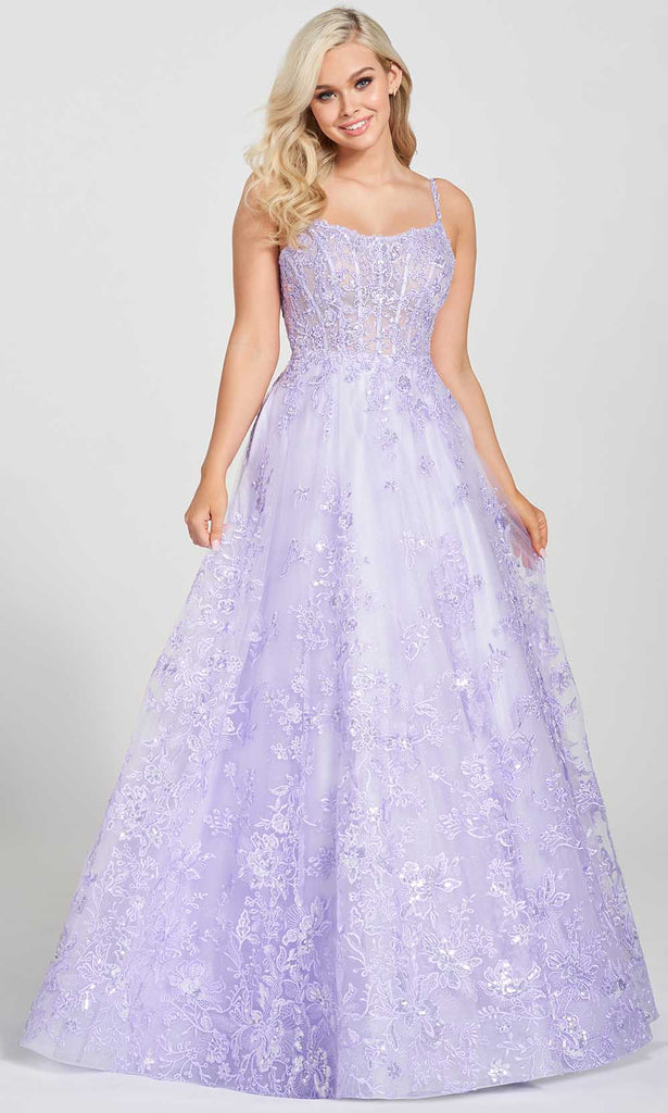 Make yourself into a vision of loveliness in this spectacular full length dress by Ellie Wilde EW122109. Featuring a corset boning bodice and a scoop neckline supported with spaghetti straps that lead to an open back. This ensemble is ornamented with floral lace embroidery and beads while the back shows a lace up closure for an adjustable fit. The full length A-line skirt finishes with a sweep train. Embrace a style that is immaculately sultry as you glam up for your event in this Ellie Wilde creation. Whether your style is modern trendy or timeless classic, Mon Cheri will clothe with poise, elegance and grace for your momentous occasion.