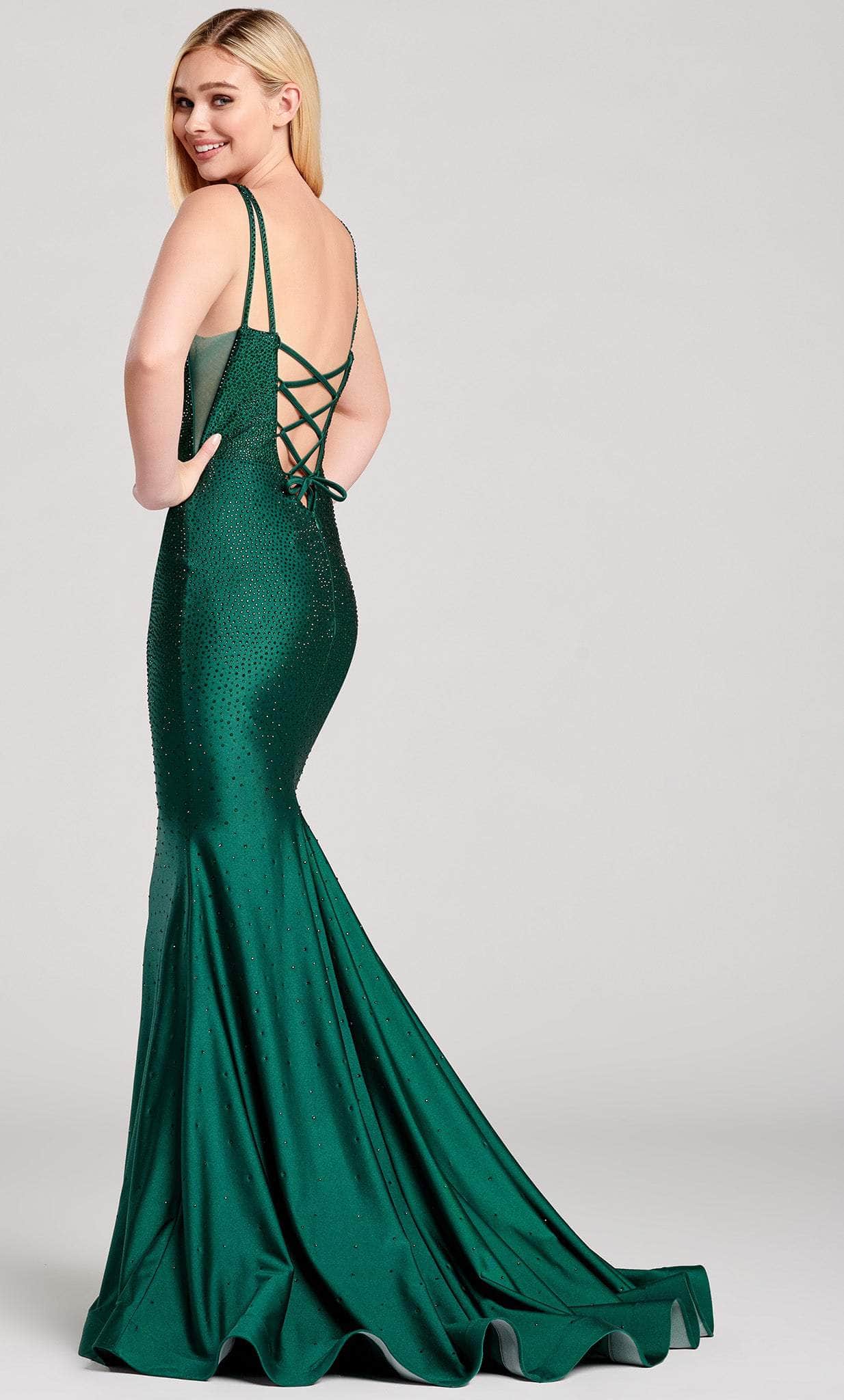 Surround yourself with decadence in a dazzling dress from Ellie Wilde EW22019 dress. This stunning sleeveless fitted bodice with a V-neckline supported by twin spaghetti straps and a lace-up back is beautifully fashioned in sumptuous stretch satin fabric. The skirt is in a full-length hemline flare in a mermaid silhouette and finishes with a sweep train. This style is finished with a center zipper closure in the low back. Mesmerize the crowd with your sophisticated flair in this Ellie Wilde EW22019. Models are wearing Navy Blue and Emerald colors.