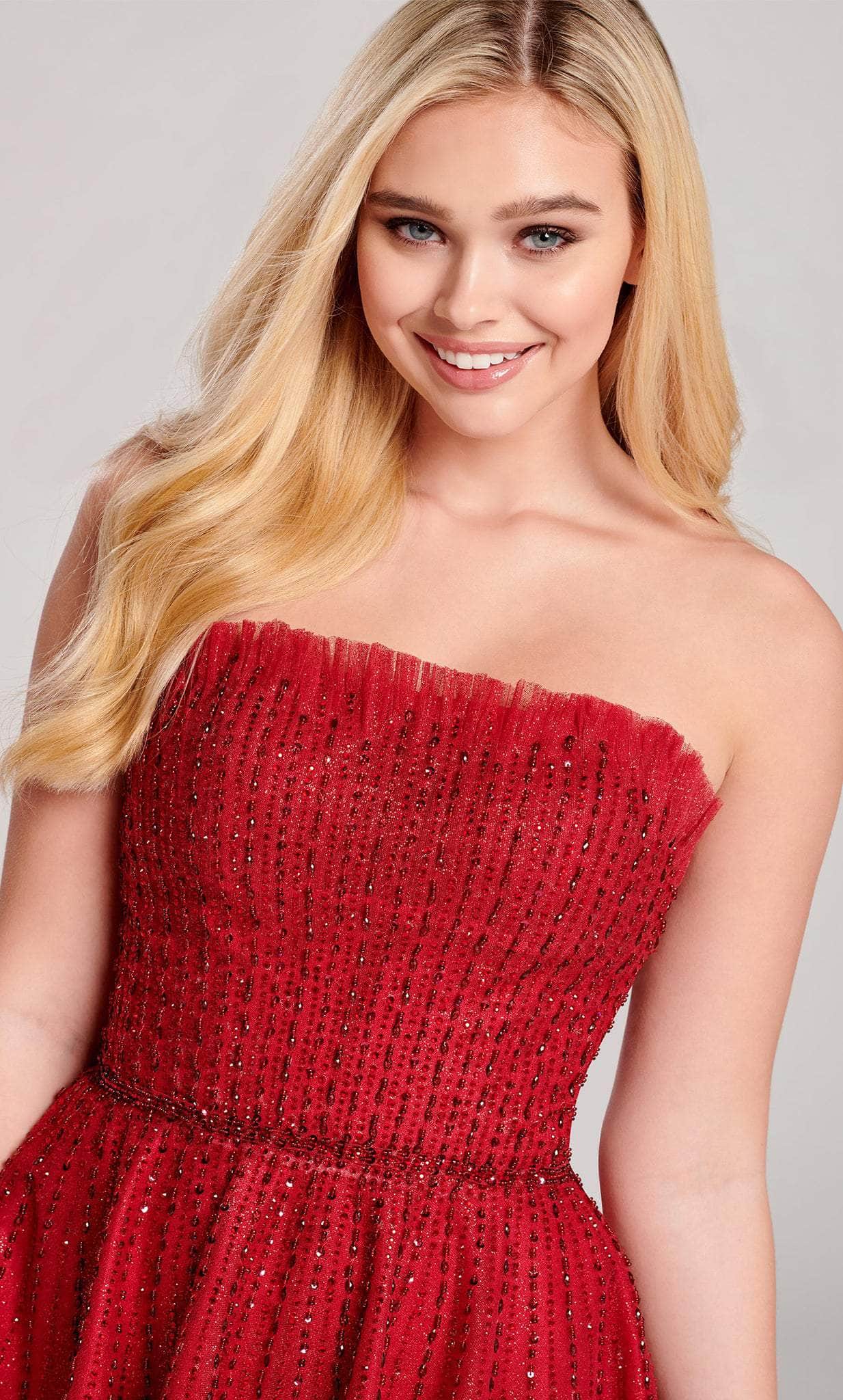 Wear this sultry ensemble by Ellie Wilde EW22049S to look and feel glamorous. Beautifully made in glitter tulle fabric, this piece showcases a strapless bodice with a straight-across trimmed style neckline and a mid-open back secured with a center zipper closure. The A-line skirt is designed with fabulous pleats and a bejeweled waistline as it falls to the mid-thigh length hemline. Charm them all in this adorable Ellie Wilde EW22049S masterpiece. Models are wearing Gunmetal and Wine colors.