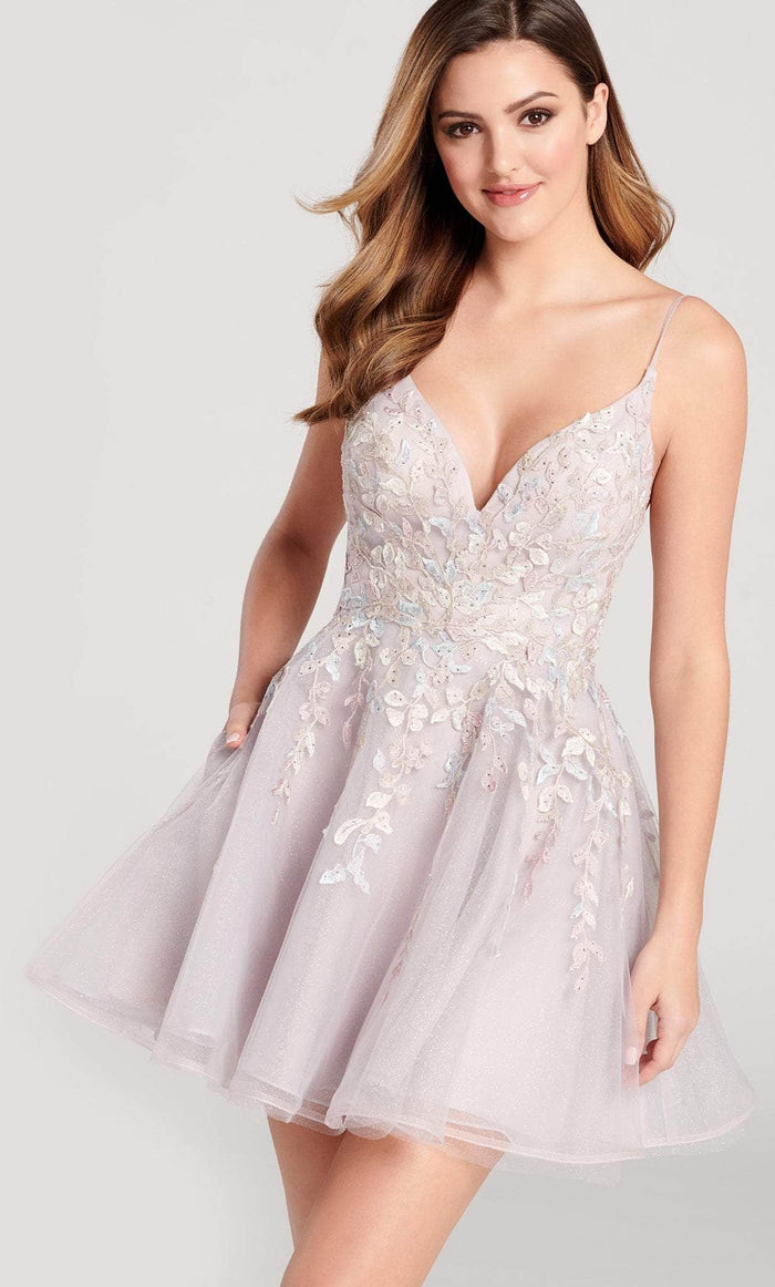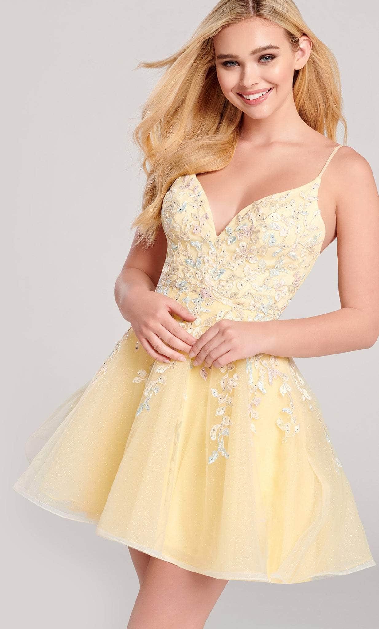 Setting the mood for the evening will be a sexy and elegant Ellie Wilde EW22057S cocktail dress. This dress has thin straps used to support the sleeveless fitted bodice of this winning piece that features a V-neckline and a mid-open back secured with a center zipper. Lace applique is glamorously embellished in this ensemble. The dress has an open back and the skirt flares in an A-line silhouette. This Ellie Wilde EW22057S creation is cutting edge literally! Models are wearing Light Yellow/Multi, Dusty Lilac/ Multi
