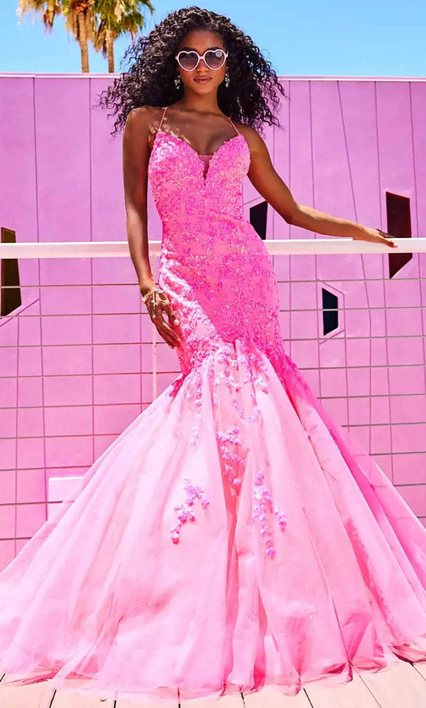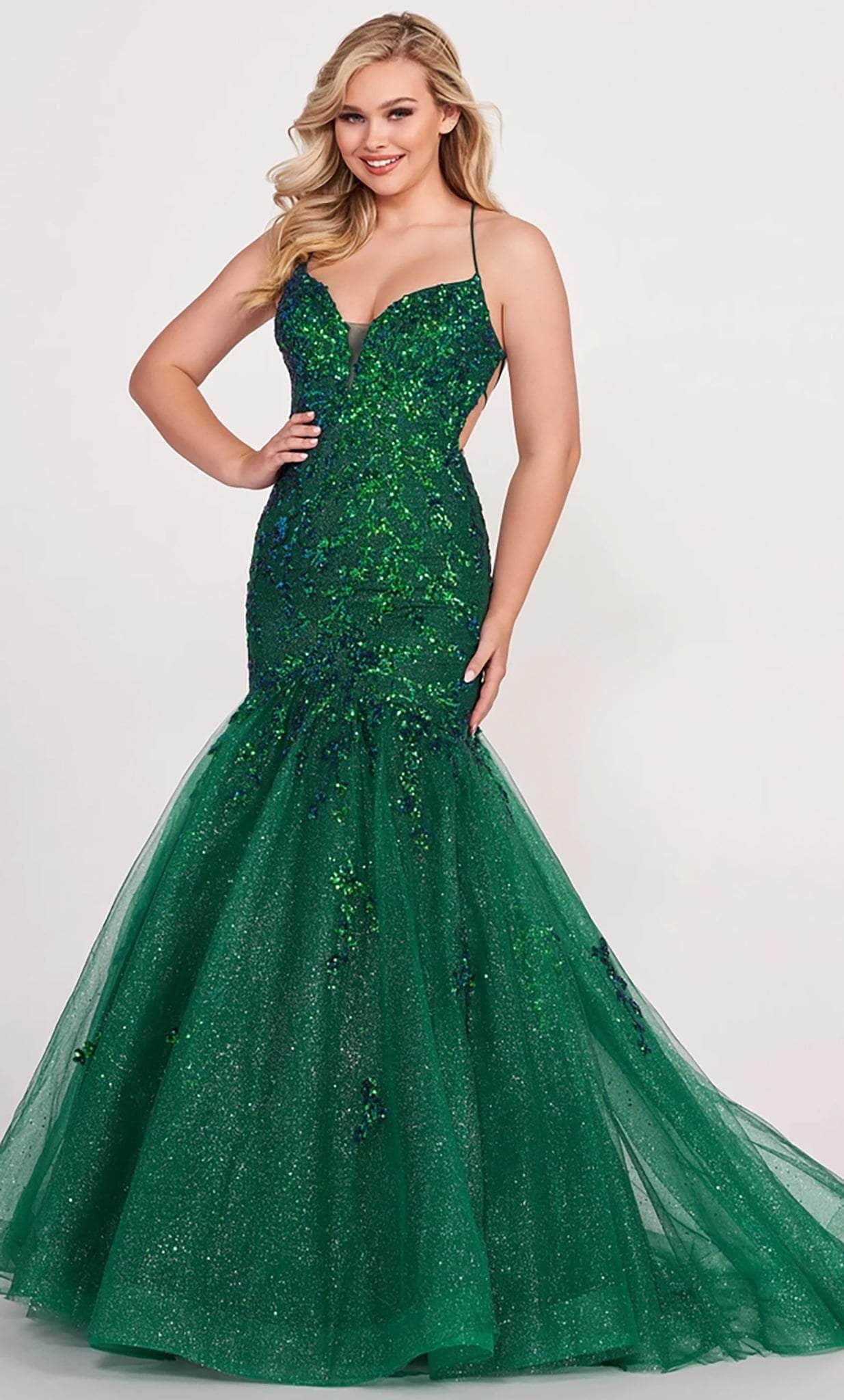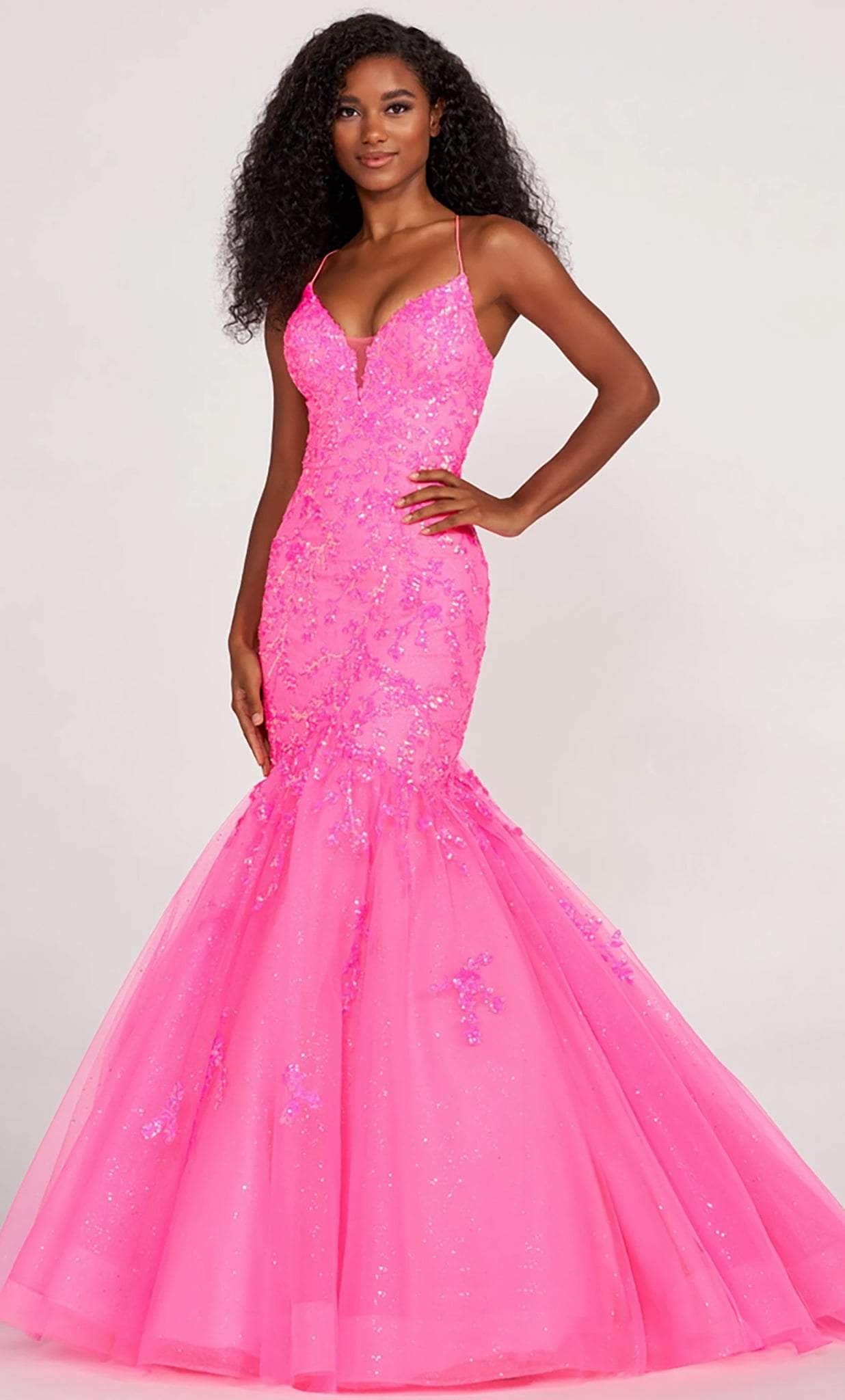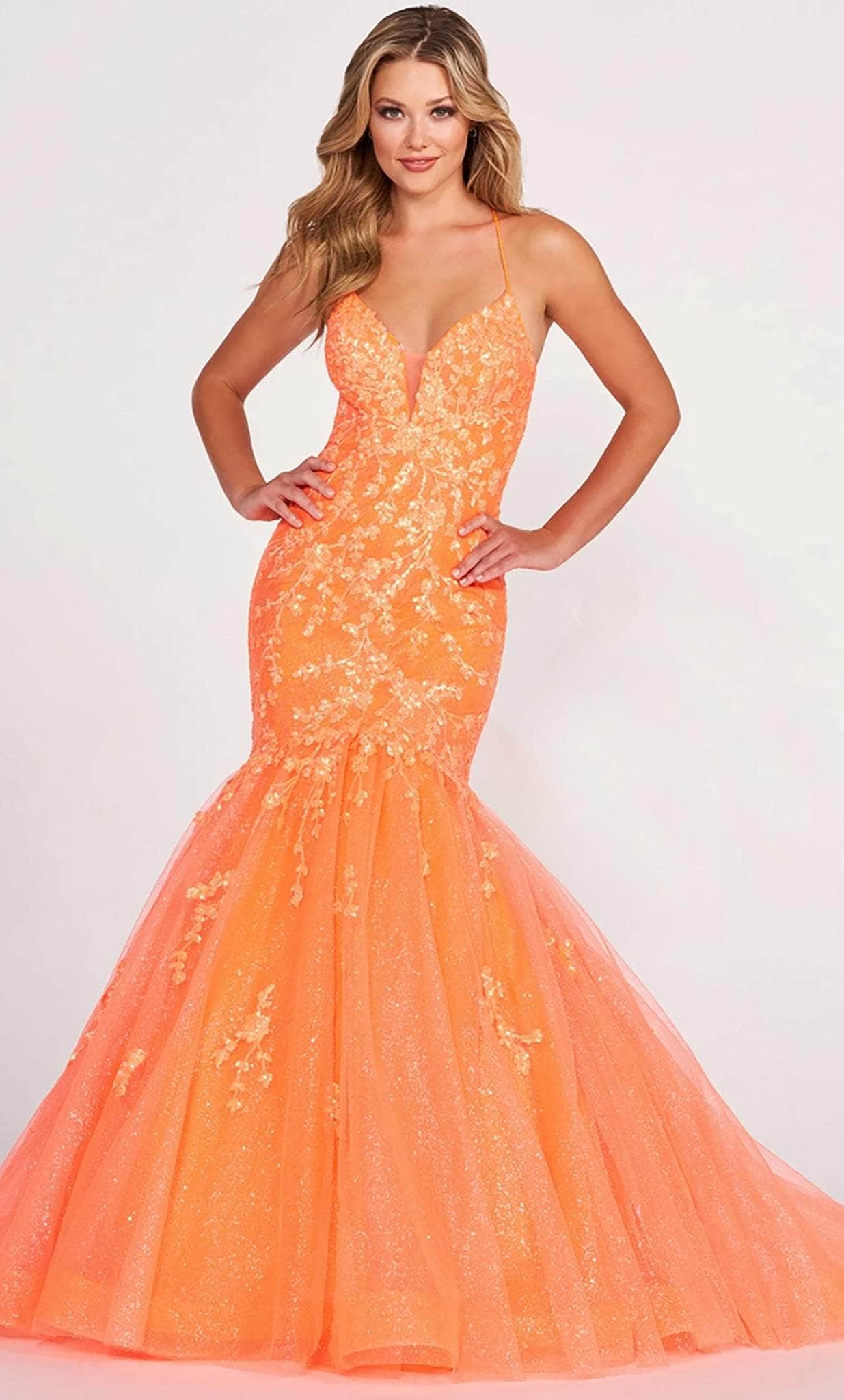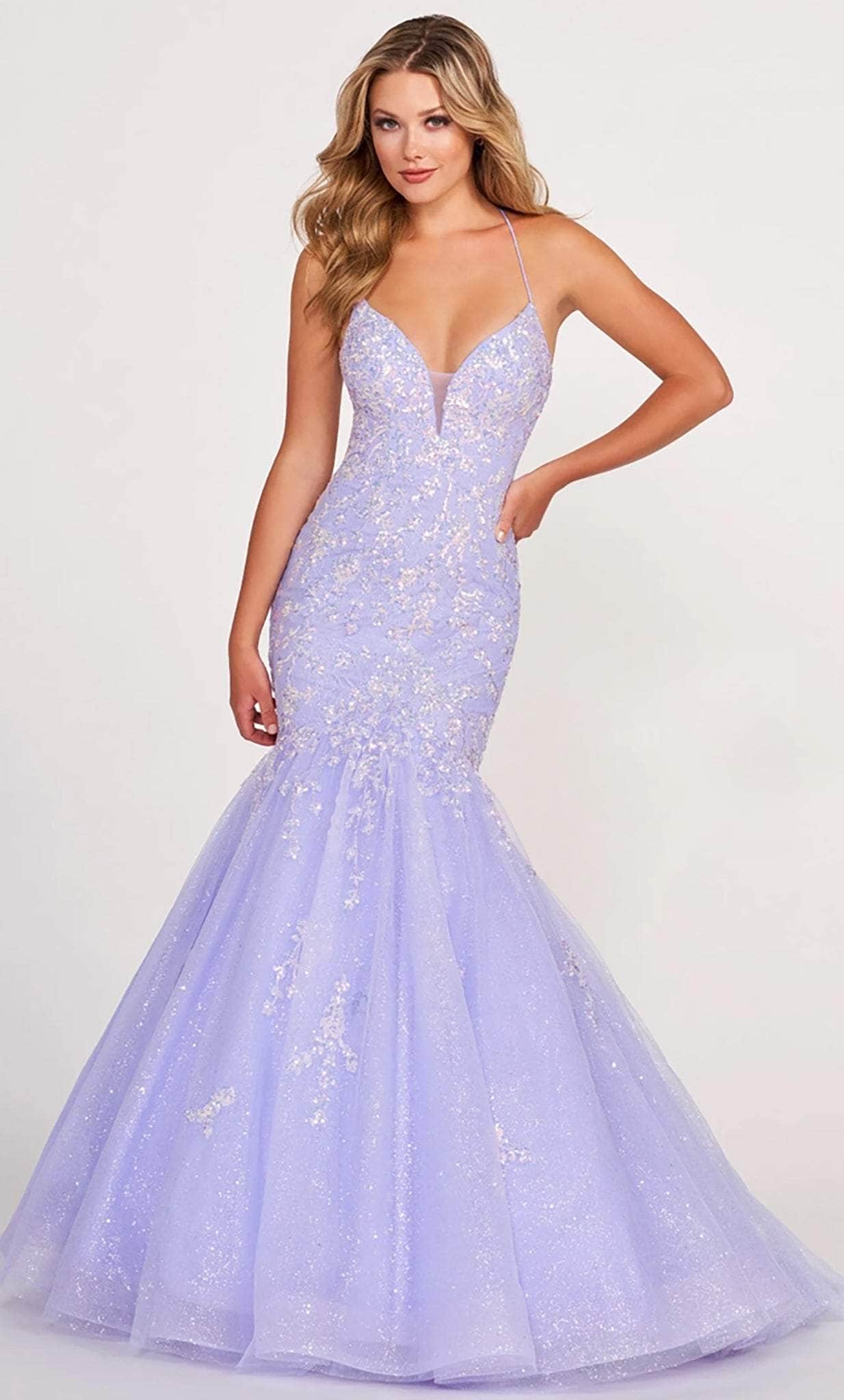 Get ready to fascinate the crowd this elegant Ellie Wilde EW34011 evening dress. This dress is tailored in jersey fabric with glitter tulle and is adorned with sequins. Features a sleeveless design with a plunging V neckline and is supported by spaghetti straps. The skirt has a floor length mermaid silhouette and a natural waistline. The dress is finished off with a corset back. Wear this Ellie Wilde creation to make that entrance that everyone will remember. The models are wearing Orange, Periwinkle, Emerald, and Hot Pink colors.