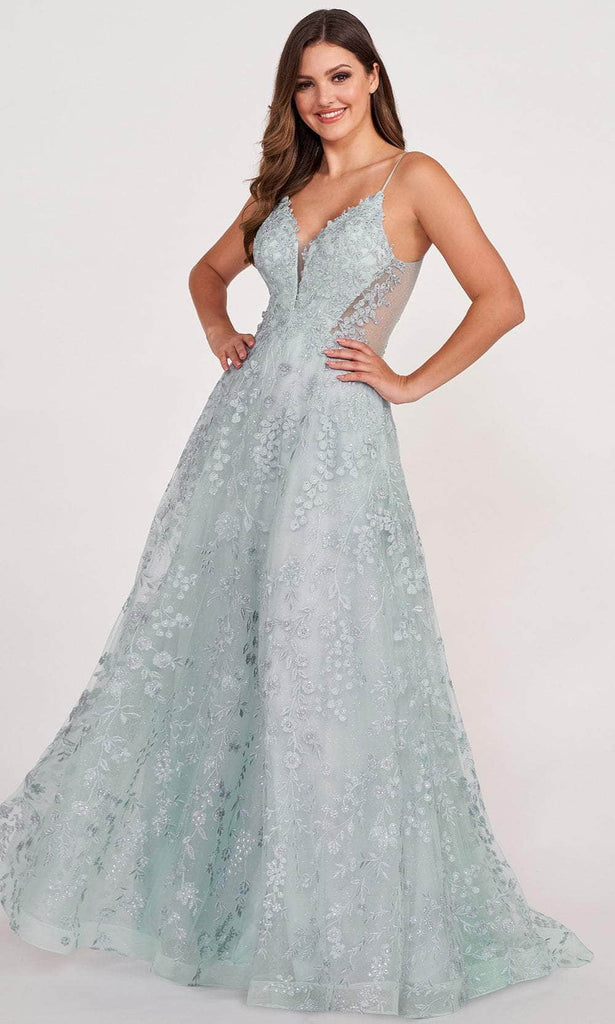 Prepare to dazzle everyone in the Ellie Wilde EW34048 masterpiece. Glamorized with lace embroidery and beadwork, this gown shows off your classy and blossoming look. The sleeveless bodice has a plunging v-neckline, spaghetti straps and sheer sides that navigate to the v-open back. Capturing a diamond cutout at the lower back, the skirt flourishes an A-line silhouette that cascades to a full length hem and sweep train. This Ellie Wilde EW34048 long gown will highlight your natural beauty and grace. Models are wearing the Yellow, Strawberry, Mist and Ivory/Nude colors.