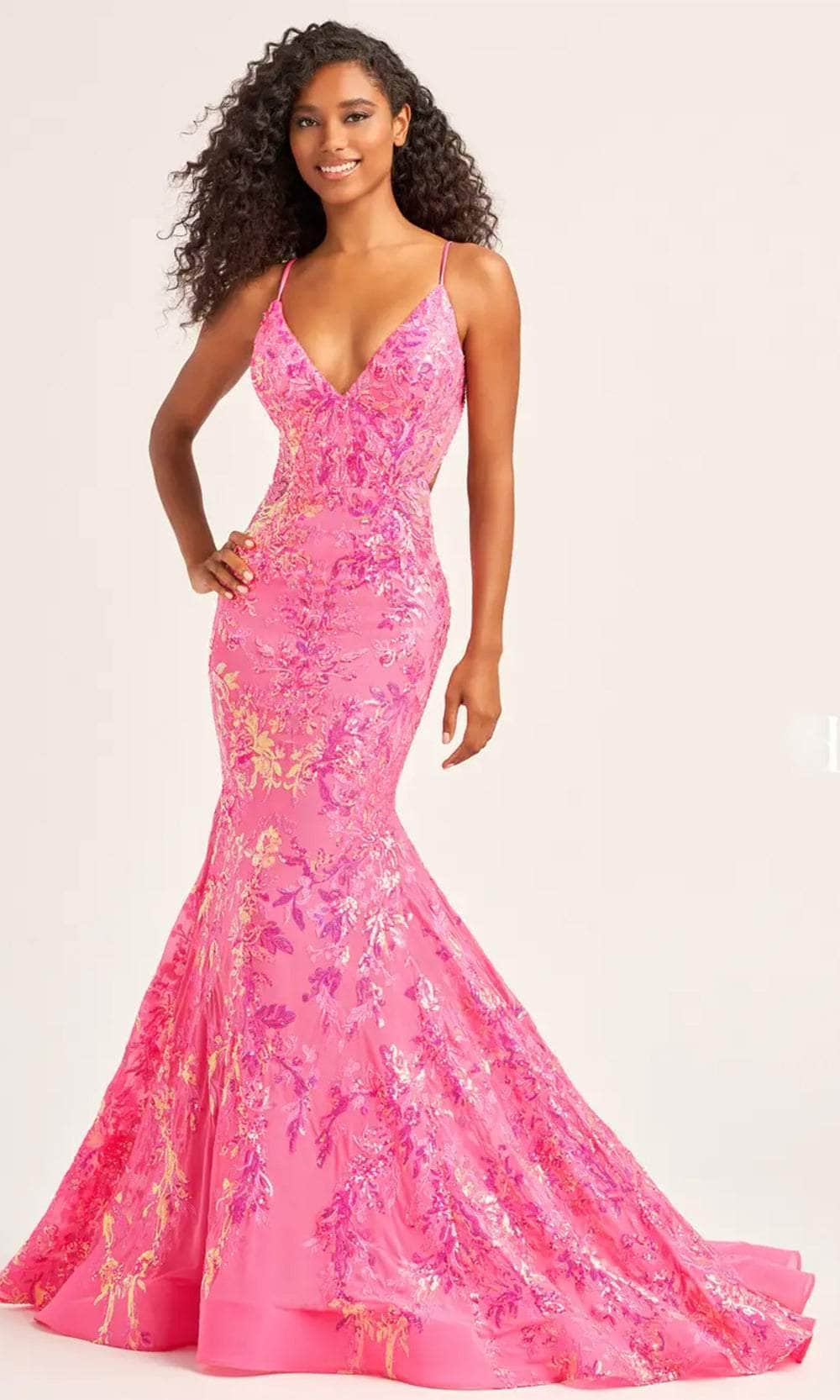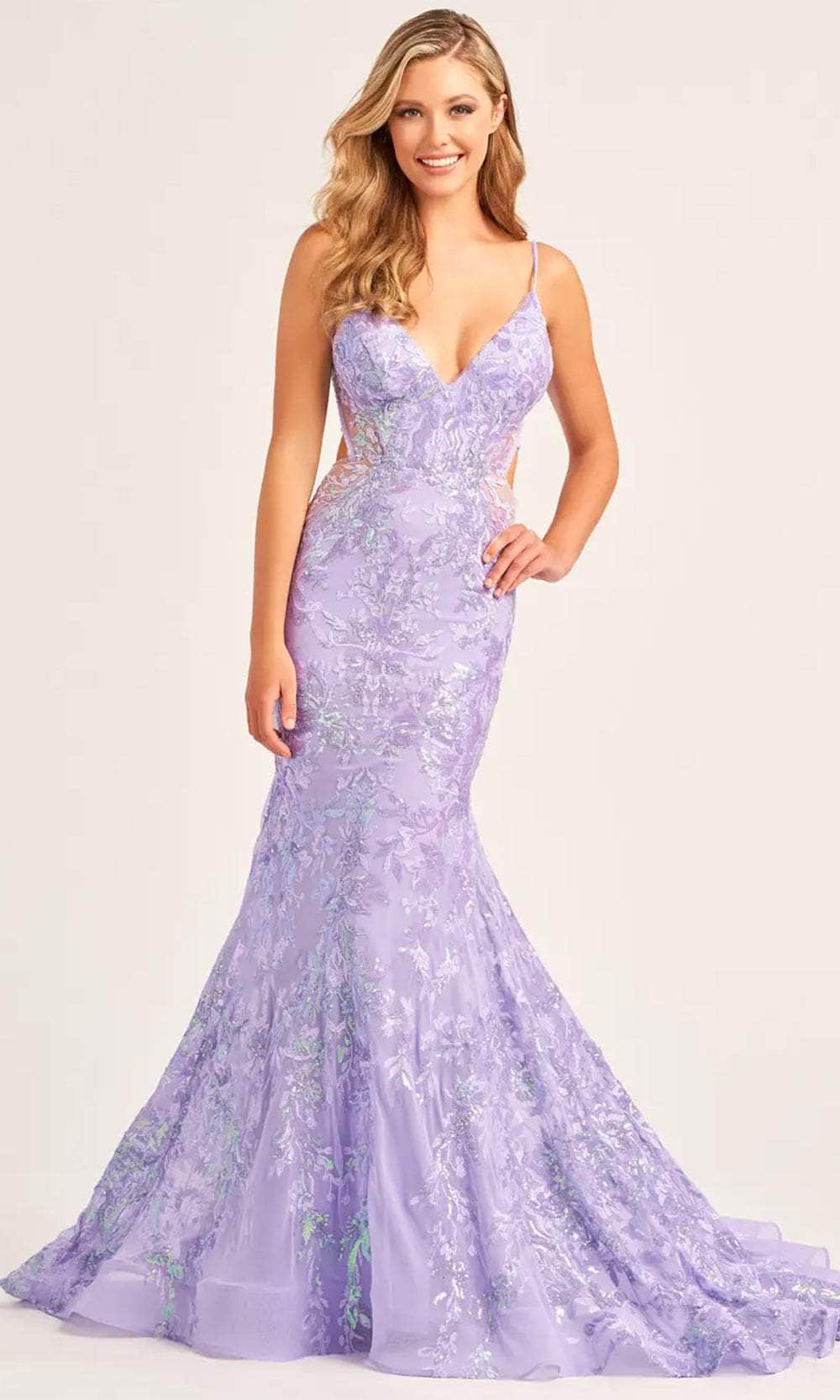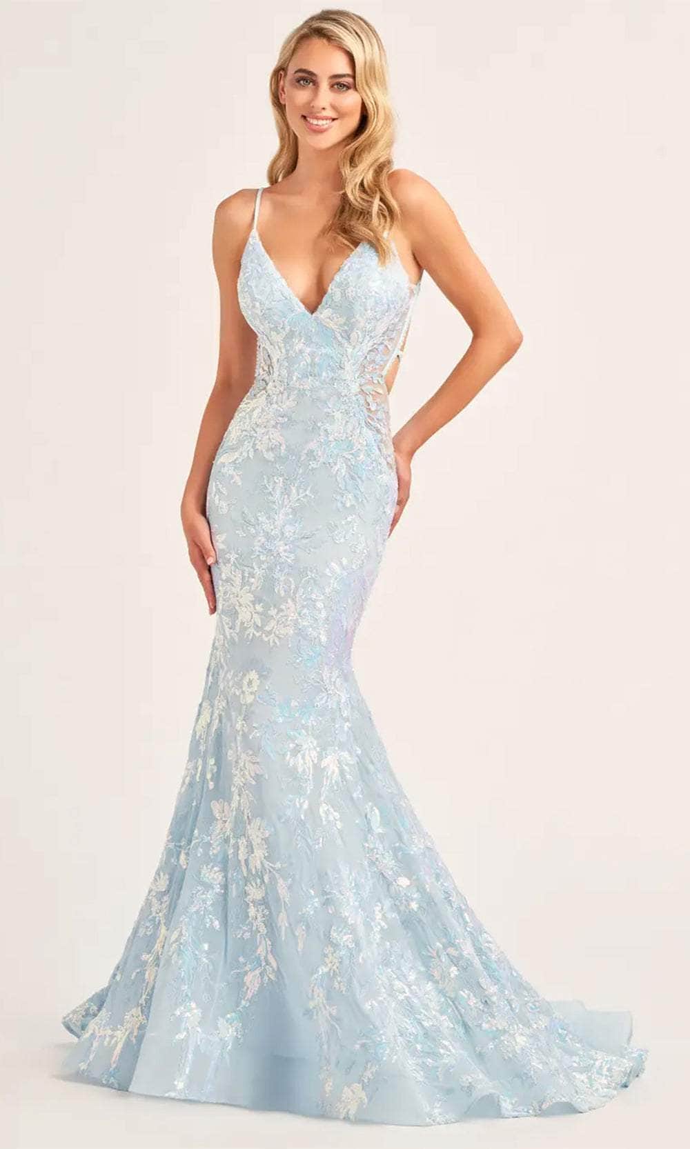 Prepare to captivate all eyes and exude fabulousness in the stunning Ellie Wilde EW35011 evening gown. This dress showcases a sophisticated V-neckline atop a figure-flattering bodice, accentuated by charming spaghetti straps for added support. Its sleeveless design reveals an alluring open back adorned with elegant lace detailing, adding an exquisite finish. Bedecked entirely with sequin embellishments, this dress ensures you shine and dazzle throughout the night. A fabulous sweep train gracefully cascades along the floor-length mermaid skirt, enhancing its allure. Command the luxurious event with confidence and allure as you make your entrance into the ballroom wearing this chic Ellie Wilde EW35011 masterpiece. Models are wearing Cerulean Blue, Light Blue, Hot Pink, Lavender, Gold, and Royal Blue colors.
