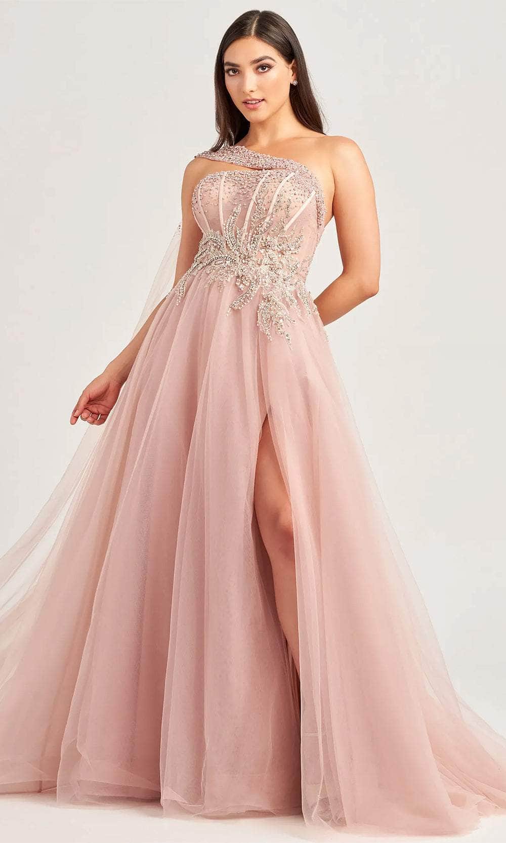 Dazzle in Ellie Wilde EW35090, a captivating prom gown featuring a one-sleeve fitted bodice adorned with sparkling beads for a radiant effect. The asymmetrical neckline adds modern flair, complemented by a back zipper closure with a modesty panel for a secure fit. The floor-length skirt gracefully parades in an A-line silhouette, accentuated by a tasteful slit and a train. Ellie Wilde EW35090 promises a stunning and memorable presence on any special occasion, seamlessly blending opulence with contemporary design. Models are wearing Periwinkle and Dusty Rose colors.
