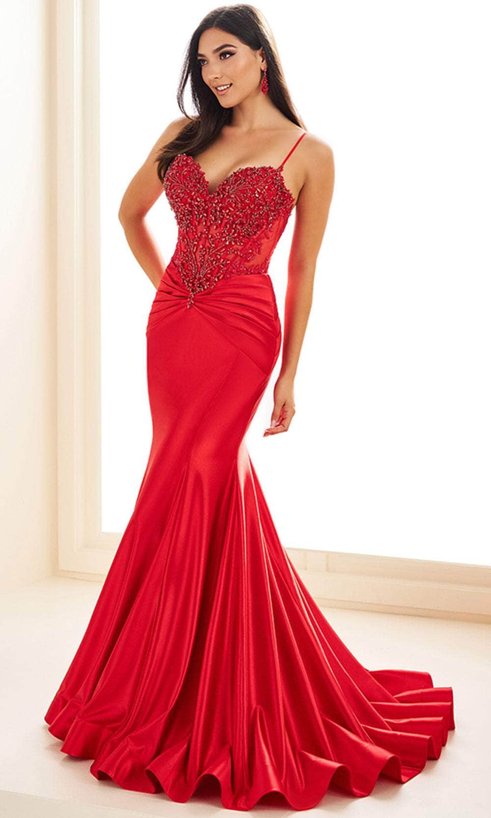 Step out in elegance and make waves in this statement-making Ellie Wilde EW36004 masterpiece. Every detail of this sleeveless dress is carefully crafted to enhance your beauty. Its illusion corset bodice highlights the exposed boning for support, a floral lace appliques and beads decorations. The pleated detail in the waist adds just the perfect amount of glam. Other attractive features are sweetheart neckline held up by spaghetti straps and a low open back. With sweep train that creates a dramatic finish to your entrance, the mermaid skirt hugs and elevate your natural curves. Strike a pose and radiate beauty in this Ellie Wilde EW36004 dress. Models are wearing Royal Blue, Red, Black, Gold, Rose Gold, Misty Blue/Silver, and Sea Glass/Silver colors.