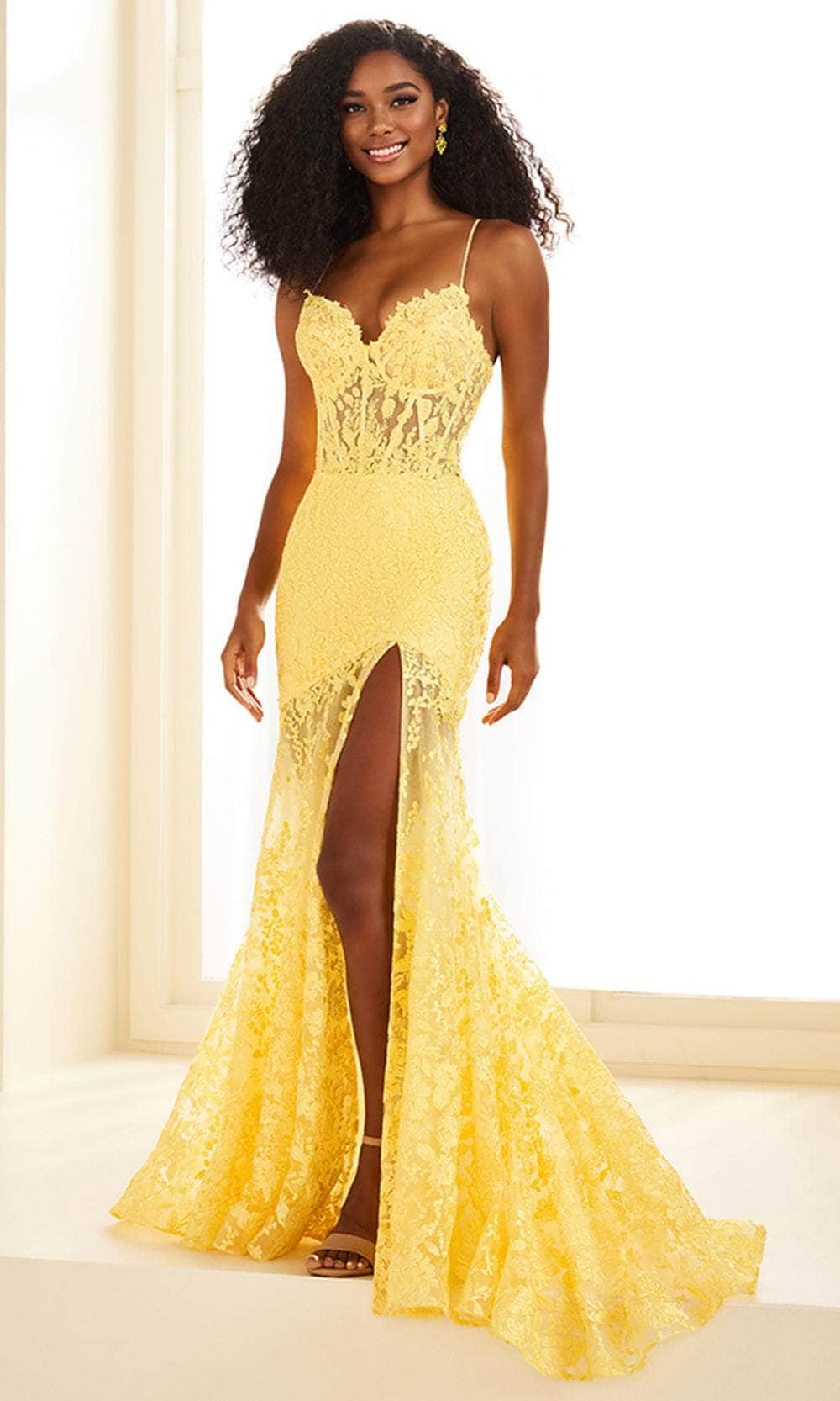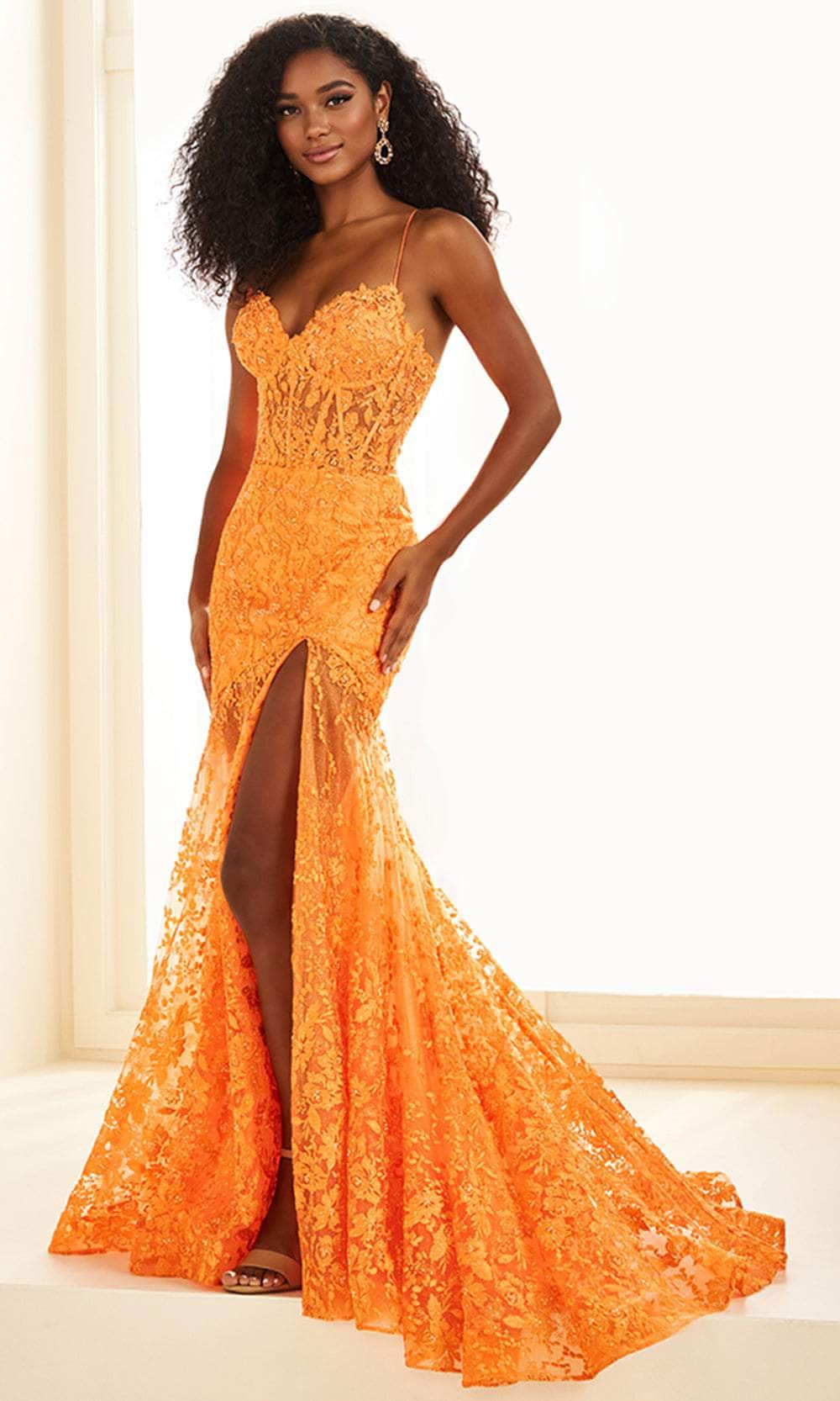 Reign supreme with grace and style in this Ellie Wilde EW36016 masterpiece. Stay ahead in fashion with this long dress from Ellie Wilde EW36016. This ensemble is made from embroidered tulle with floral lace applique and gleaming beads decorations for a show-stopping effect. A deep v-neckline paired with an open back is flawlessly supported by dainty spaghetti straps. Flaunting a see-through detail and a high slit, the sheath skirt offers a seductive and striking appeal. The sweeping train and horsehair hem provide a dramatic final touch to the look. Be the envy of everyone in this striking Ellie Wilde EW36016 creation. Models are wearing Royal Blue, Black, Orange, Sage, Yellow, Teal, Lt.Blue, Magenta, and Strawberry colors.