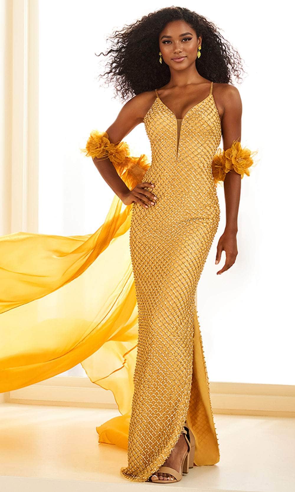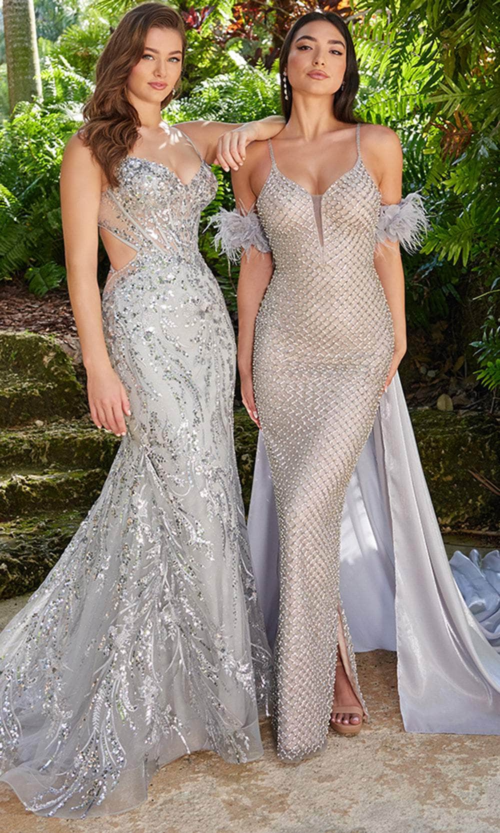 Step into the spotlight and exude glamour in the Ellie Wilde EW36027 gown. This masterpiece is completely adorned with a luxurious lattice pattern of beads, creating an unforgettable look. The gown is elevated by feathery accents and 3D floral appliques on a dramatic detachable off-shoulder long cape. The strappy open back reveals a glimpse of skin, while the plunging V-neckline and dual spaghetti straps bring captivating appeal. The Sheath silhouette of the skirt flows gracefully to the floor, highlighted by a daring thigh-high slit. Embrace your inner royalty in the Ellie Wilde EW36027 gown. Models are wearing Gold, Silver/Nude, and Light Pink colors.