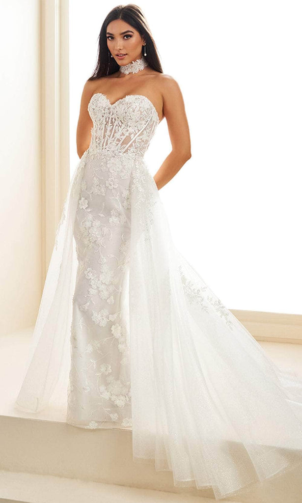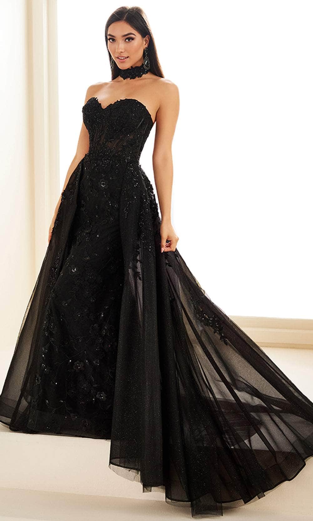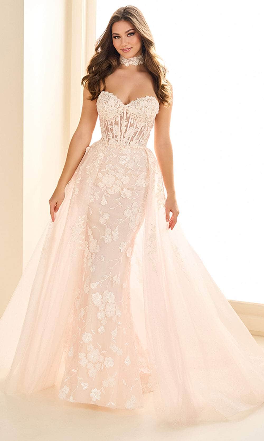 Indulge in the exquisite elegance of this Ellie Wilde EW36028 masterpiece. Flaunting 3D floral appliques, embroidery, glistening beads and sequins, this strapless gown will keep you in the spotlight all night. The sweetheart neckline, illusion corset boning bodice and an enticing open back are attractive features. The skirt exhibits a mermaid silhouette that traces your curves perfectly and flows into sweeping train. Complete your ensemble with the detachable A-line overskirt, detachable spaghetti straps and choker that offer versatile styling options. This Ellie Wilde EW36028 long gown is a perfect option for any noteworthy celebration. Models are wearing Ivory, Black, and Petal colors.