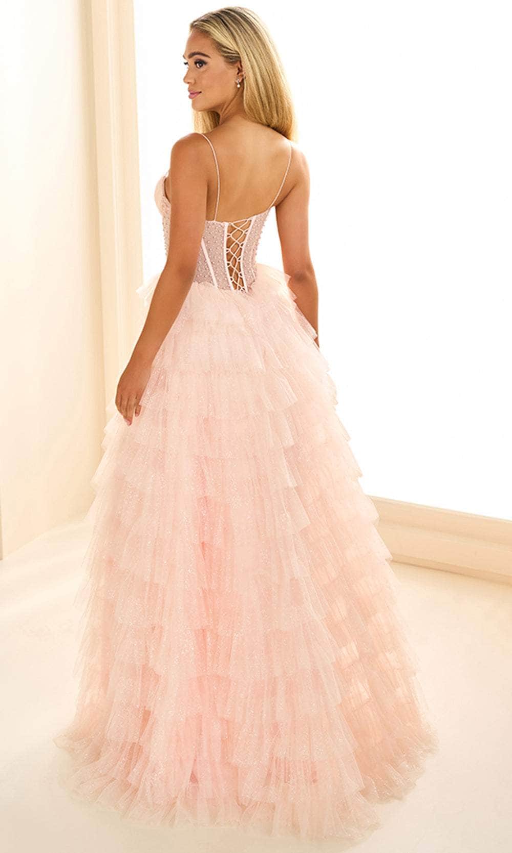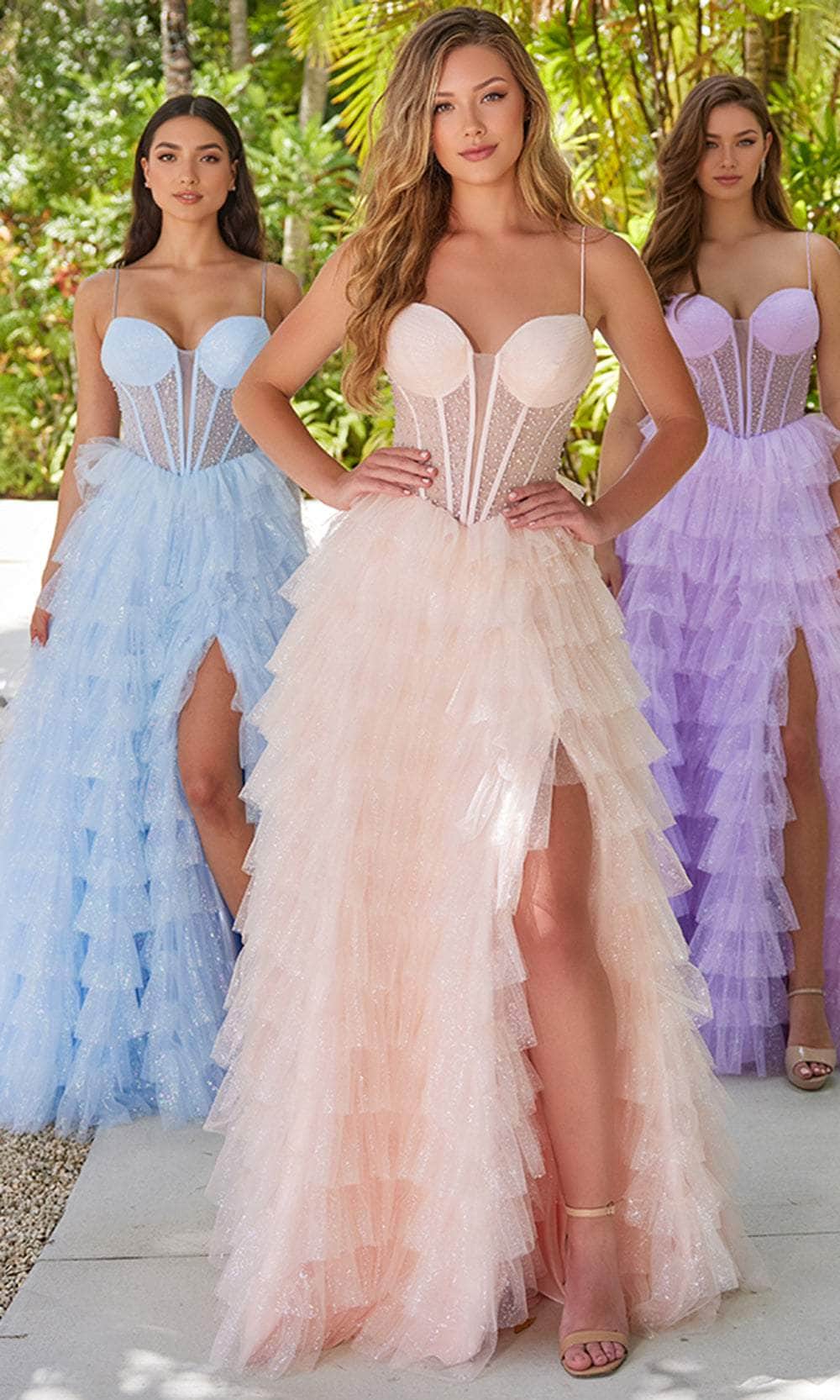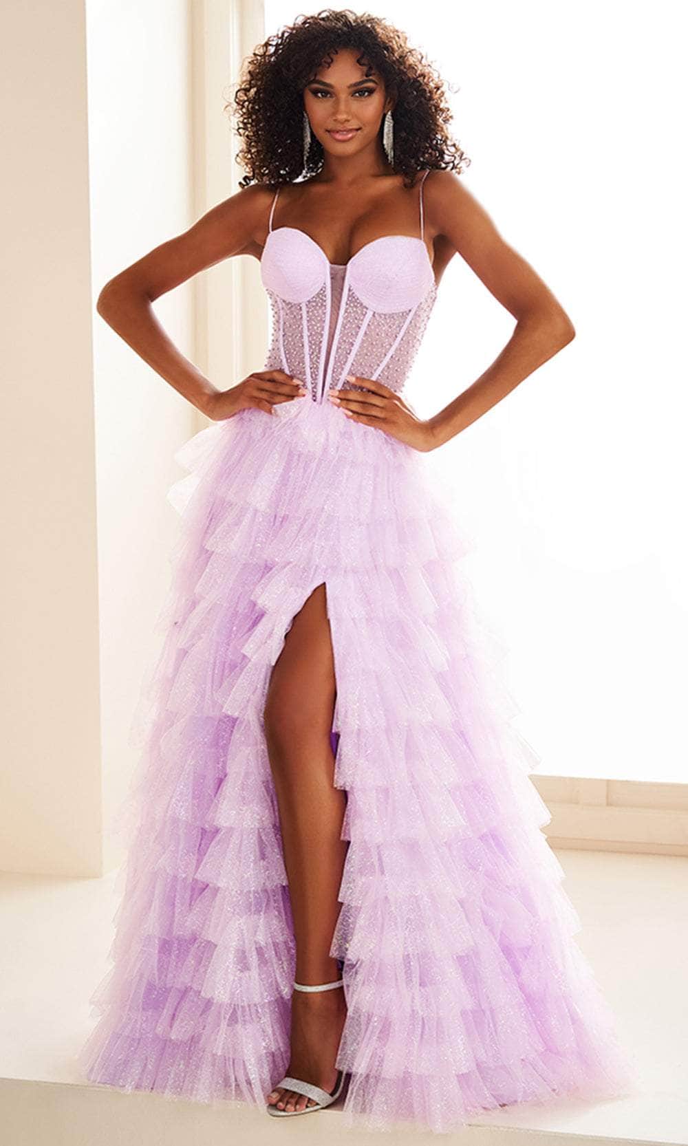 Be ready to leave a lasting impression in this heart-capturing gown from Ellie Wilde EW36029. This design features a see-through boning bodice adorned with dotted beads and shimmering pearls, creating a truly mesmerizing and luxurious look. Its sleeveless style is highlighted by a sweetheart neckline, spaghetti straps, and a Basque waist, while the midrise lace-up back adds a touch of allure. A daring thigh-high slit in the front reveals a glimpse of your legs. Crafted from frosted iridescent tulle fabric, the skirt showcases a dramatic ruffle tiered design and forms an enchanting A-line silhouette that flows to the floor. Embrace your inner princess in this Ellie Wilde EW36029 masterpiece. Models are wearing Ice Blue, Lilac, and Blush colors.