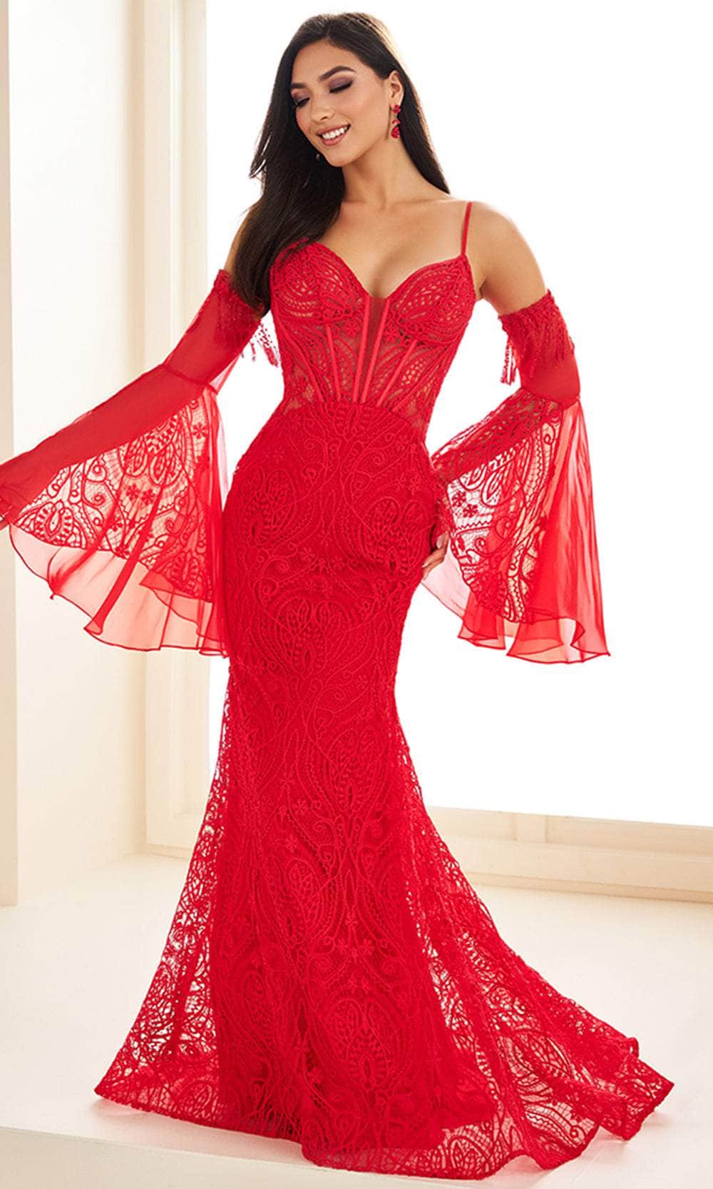 Wow everyone with your trendsetting style in this Ellie Wilde EW36030 gown. With its fitted bodice adorned in Venise lace, this ensemble evokes a sense of timeless romance. Features include are the corset-boned bodice, a sultry plunging v-neckline, and spaghetti straps that wrap around the shoulders. Additionally, the detachable long bell sleeves provide versatility and a V-shaped cut is highlighted in the back. The mermaid skirt with a horsehair hem flows elegantly to a sweep train. Turn heads as you pose confidently in this Ellie Wilde EW36030 masterpiece. Models are wearing Royal Blue, Red, Blk/Nude, and Iv/Nude colors.