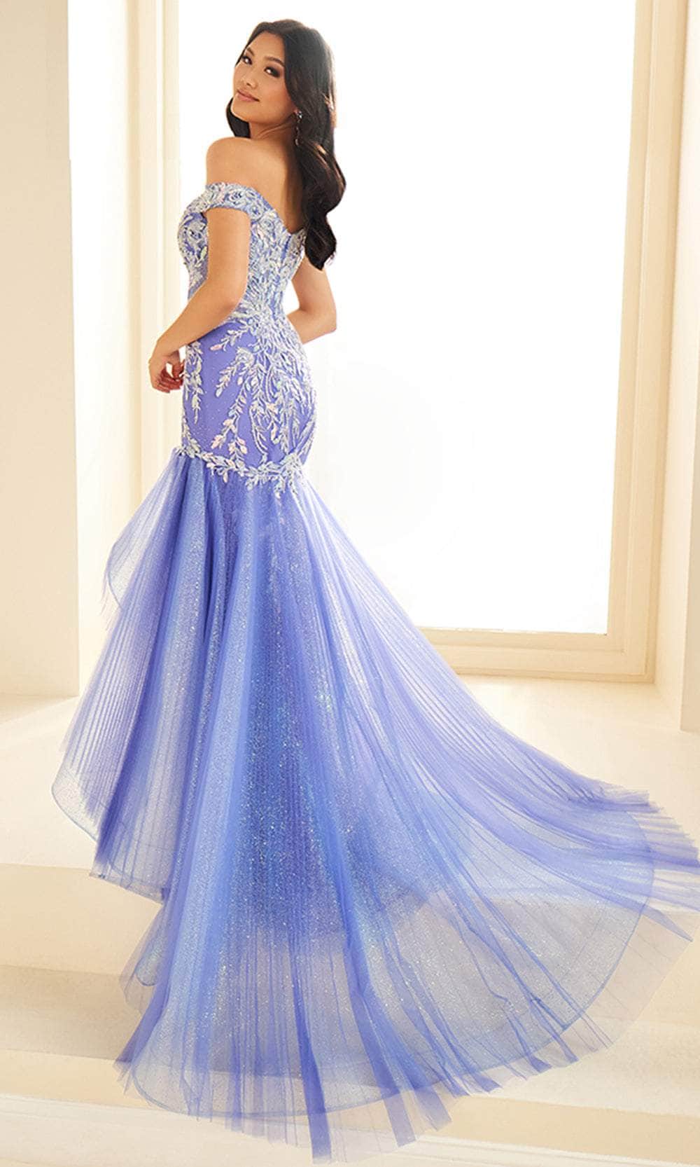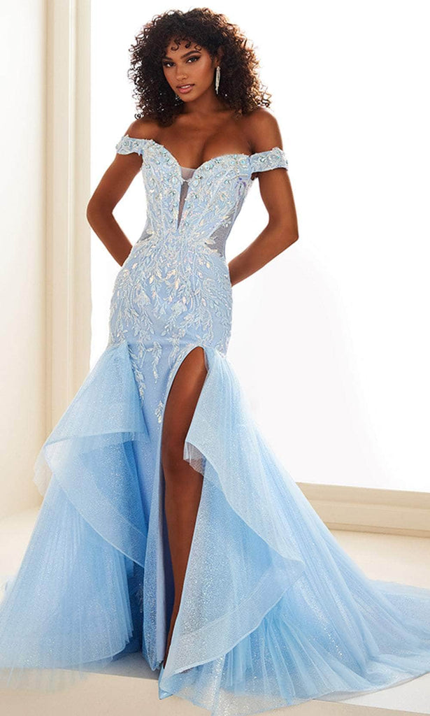 Step into the spotlight with the Ellie Wilde EW36036 gown, a masterpiece of elegance and intricate details. Crafted from tulle, this enchanting dress is embellished with luxurious beading, cracked ice effects, lace appliques, sequins, and stone accents that shimmer beautifully. The off-shoulder corset bodice with a plunging sweetheart neckline and sheer insert exudes romance and sophistication. A concealed zipper at the back provides a perfect fit, while the floor-length ruffle-detailed mermaid skirt, complete with a stylish leg slit, flows effortlessly into a dramatic train, making this Ellie Wilde EW36036 perfect for making a grand entrance. Models are wearing Ice Blue and Lilac colors.