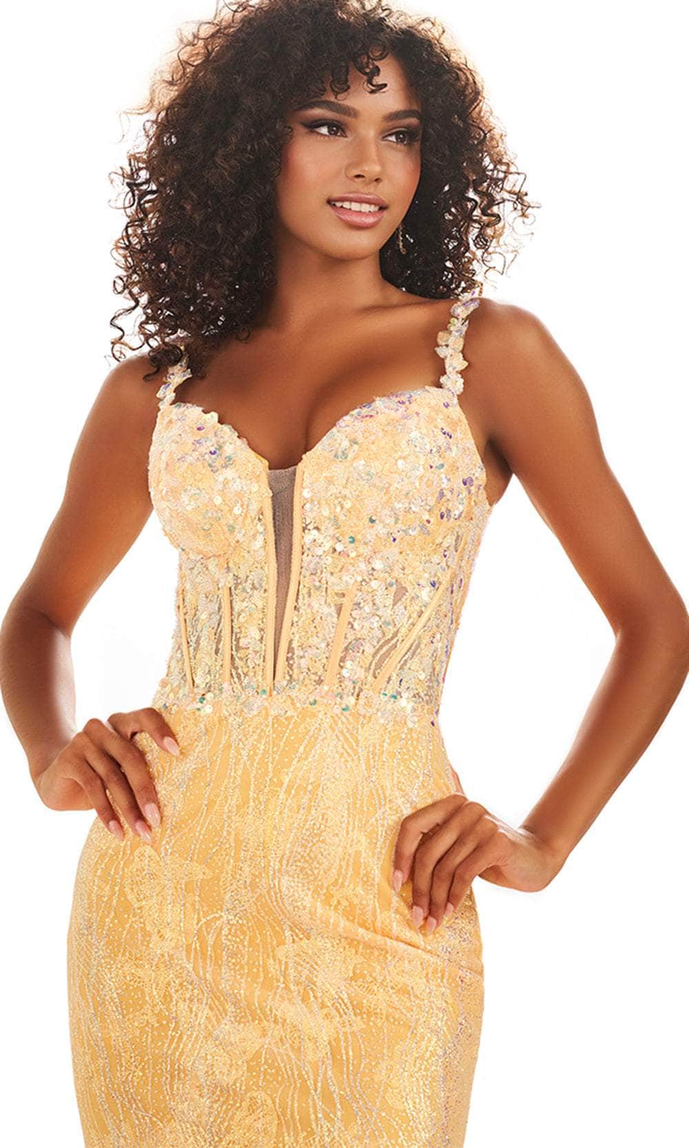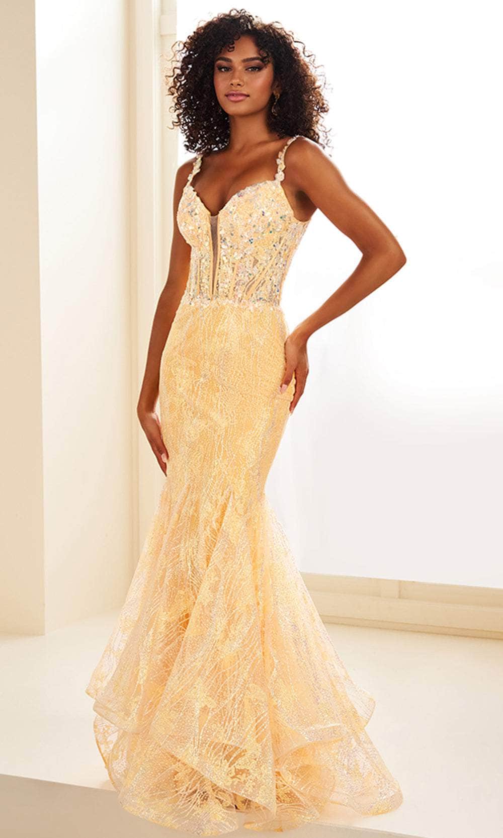 Shine like a true star in the glamorous Ellie Wilde EW36038 gown. This sleeveless style features a corset-boned bodice decorated with lace appliques and sparkling sequins, ensuring you dazzle with every step. The plunging sweetheart neckline, embellished thin straps, and midrise lace-up back add a touch of allure to your look. The godets accent on the skirt creates a beautiful flow, while the horsehair hem adds the perfect amount of volume. The stardust finish adds a glowing effect in the dark, making you the envy of the evening in this Ellie Wilde EW36038 creation. Models are wearing Flamingo Pink, and Sunset Glow colors.