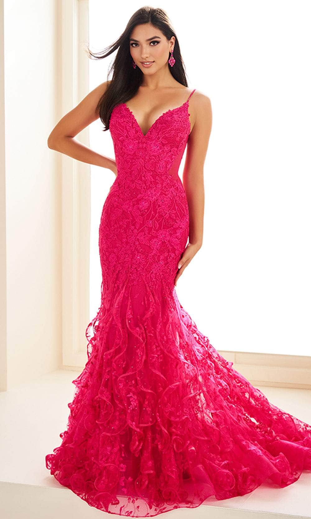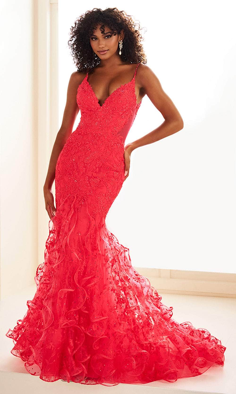 Experience the allure of Hollywood glamour in this Ellie Wilde EW36041 masterpiece. Tailored to perfectly highlights your feminine charm, this sleeveless gown is ornamented with floral motifs of embroidery and sprinkled beads. The top presents an eye-catching deep v-neckline, spaghetti straps and sultry illusion cutout in the side waist. Secured by a concealed zipper closure, the back is highlighted with a V-shaped cut and diamond cutout for an added spice. The mermaid skirt is beautifully designed with ruffles, creating a playful and graceful flow. You will undoubtedly command attention in this Ellie Wilde EW36041 gown. Models are wearing Sage, Lt Yellow, Fuchsia, Navy Blue, and Strawberry colors.