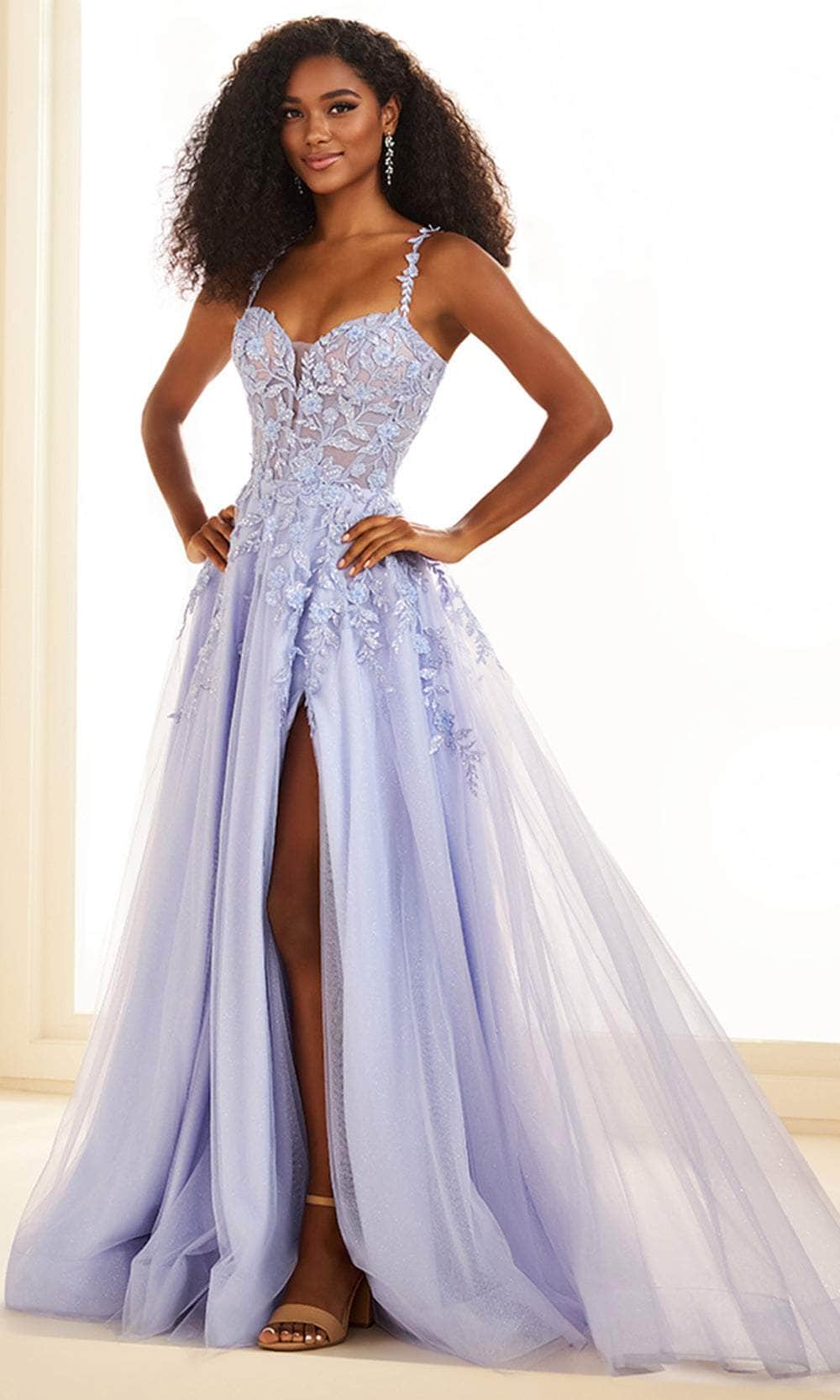 Leave everyone in awe with this Ellie Wilde EW36046 creation. This sleeveless dress is decorated with an exquisite lace applique in floral and foliage motifs, perfectly accentuated by shimmering sequins. It adds even more charmed with the glitter tulle fabric. The plunging v-neckline, thin shoulder straps and straight mid-open back are fascinating features. A thigh-high slit on the side enticingly showcases your elongates legs while allowing for effortless movement. The look is completed in a horsehair hem and an A-line skirt that pools to the sweeping train. With the Ellie Wilde EW36046 masterpiece, you will feel like a celebrity walking the red carpet. Models are wearing Royal Blue, Plum, Papaya, Wine, Dark Teal, and Blue Hydrangea colors.