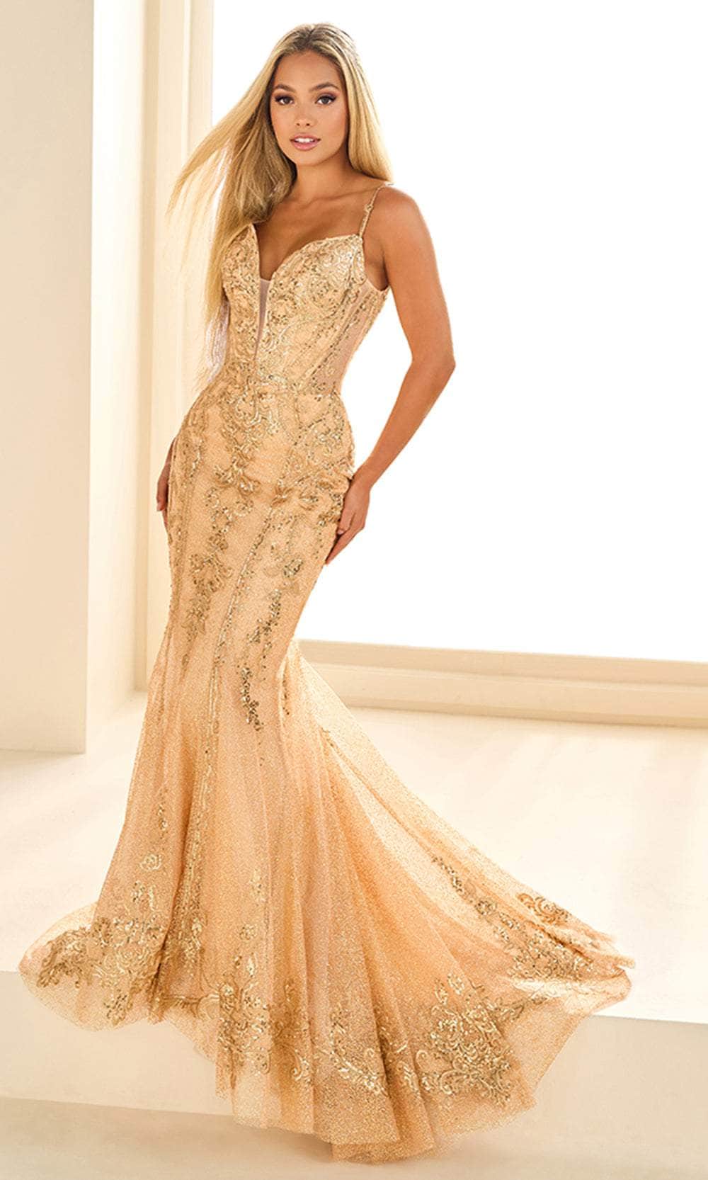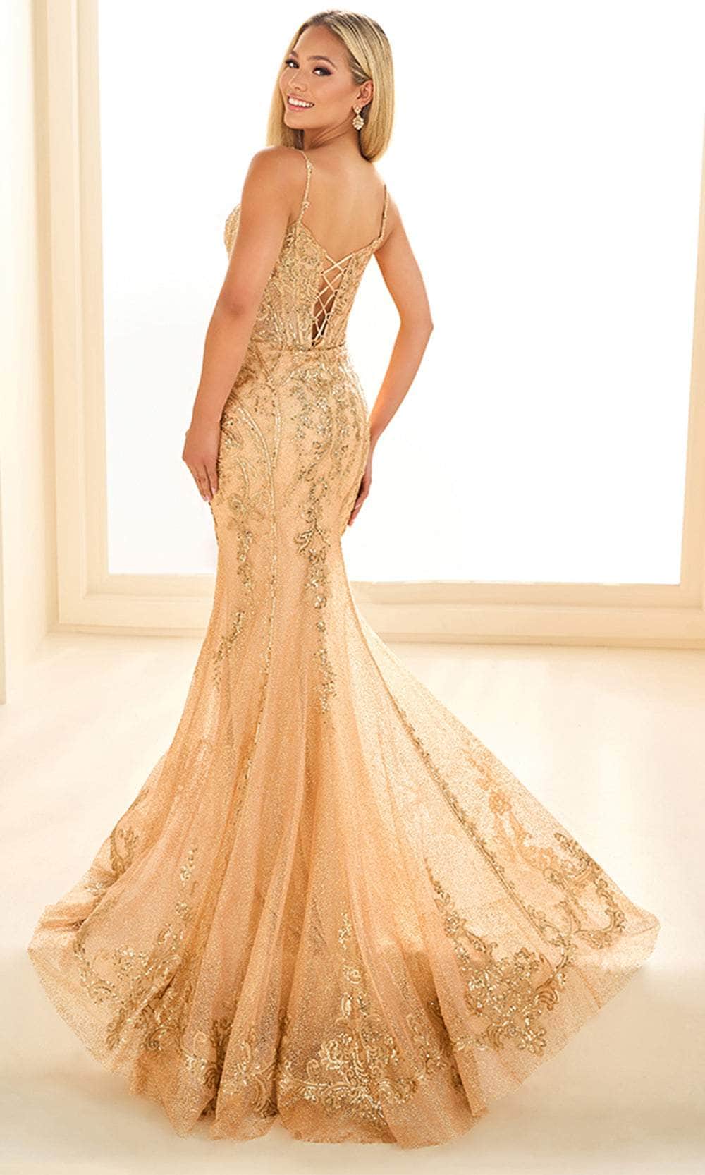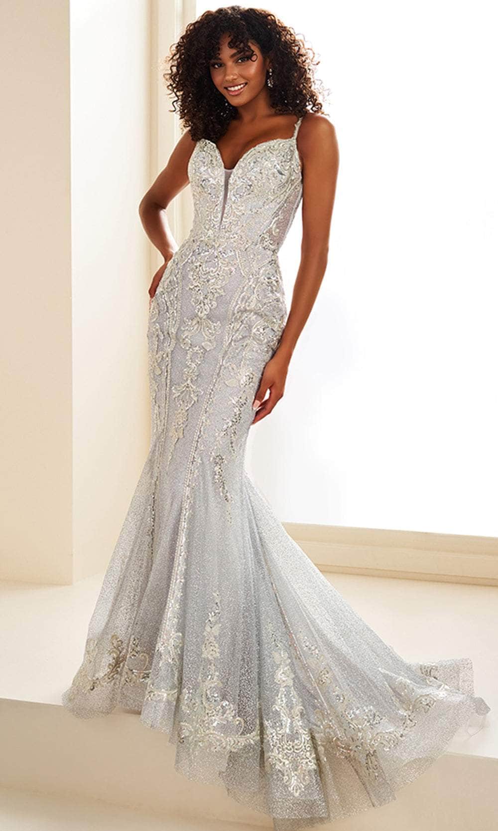 Sparkle with elegance in the Ellie Wilde EW36056 gown, a breathtaking piece tailored from shimmering glitter tulle fabric. This stunning dress features a sleeveless corset bodice with delicate spaghetti straps, adding a touch of femininity to the design. The lace-up tie and concealed zipper closure at the back ensure a perfect, secure fit, while the floor-length mermaid skirt gracefully hugs the curves. Ending with a sweeping train, this Ellie Wilde EW36056 offers a captivating look that is ideal for making a dramatic entrance at any special event. Models are wearing Gold and Silver colors.
