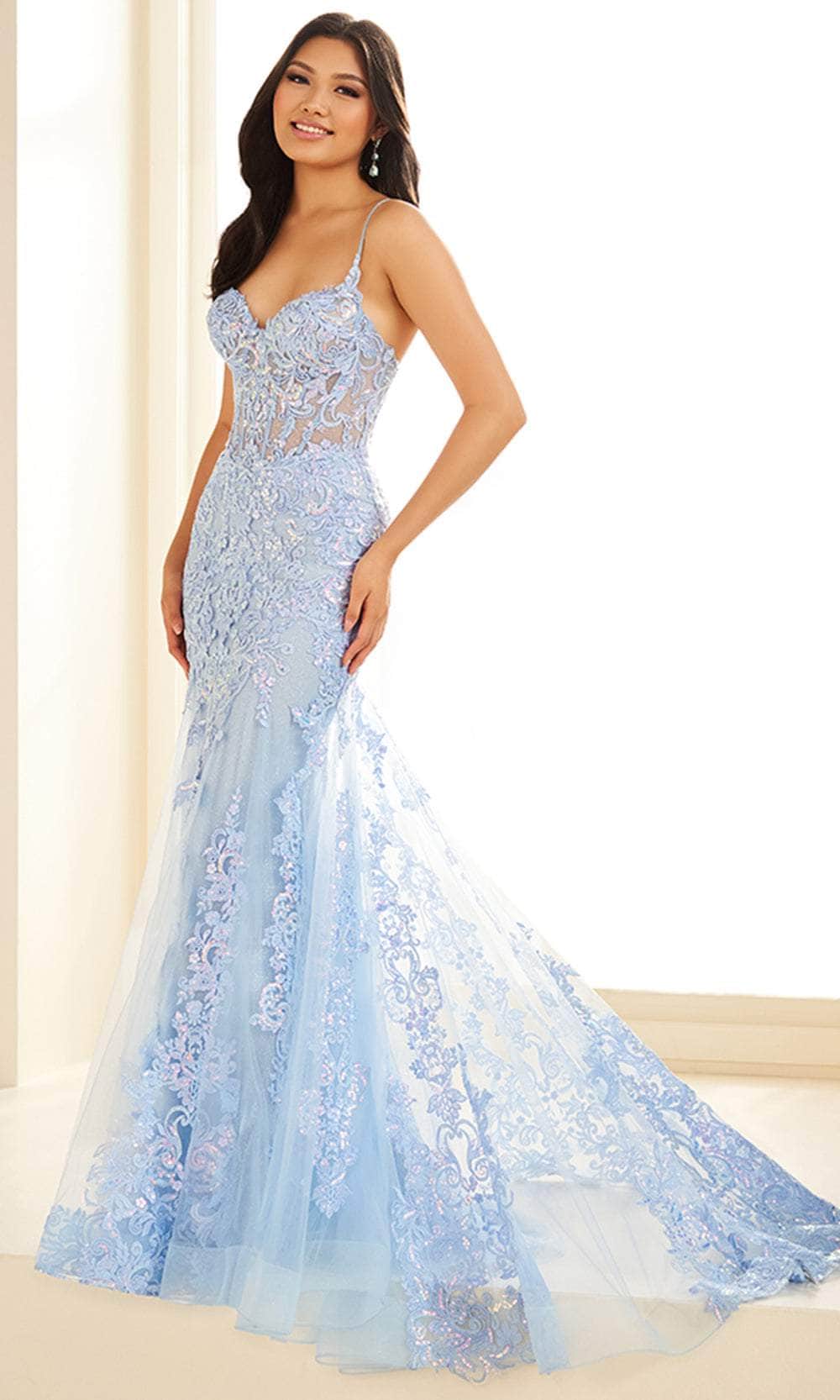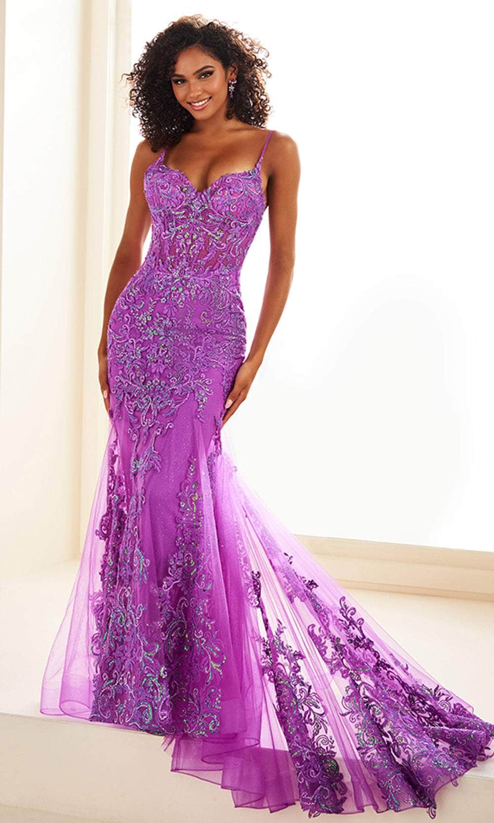 Let your inner diva shine in the fascinating gown from Ellie Wilde EW36069. This sleeveless beauty will surely make you stand out thanks to its luxurious sequins and lace appliques from top to hem. Spaghetti straps gracefully frame the shoulders, and the sweetheart neckline perfectly match with the enticing straight mid-open back. With visible boning, the illusion corset bodice adds structure, guaranteeing a seamless fit. The mermaid skirt will flaunt and enhance your curves, culminating in trendy sweep train and horsehair hem. This Ellie Wilde EW36069 creation instantly revitalizes your eveningwear collection. Models are wearing Emerald, Lt.Blue, Strawberry, and Electric Purple colors.