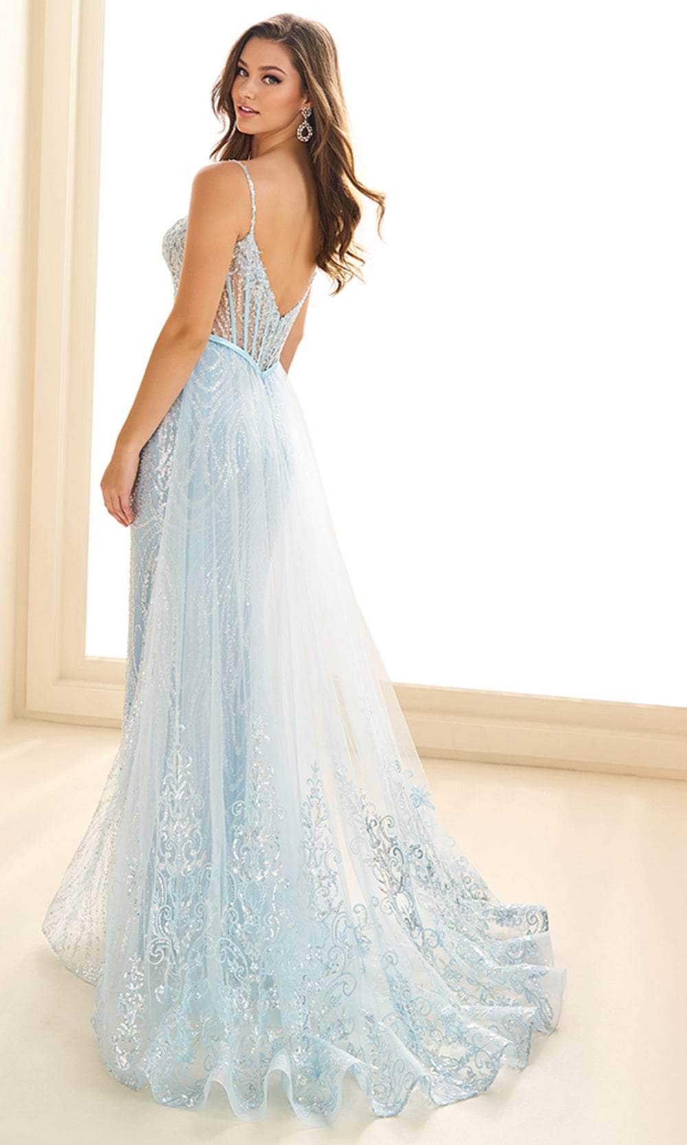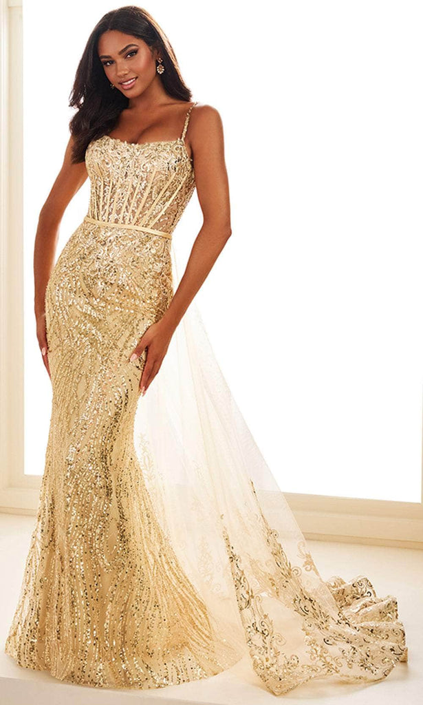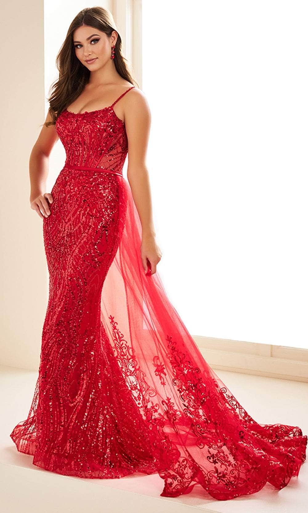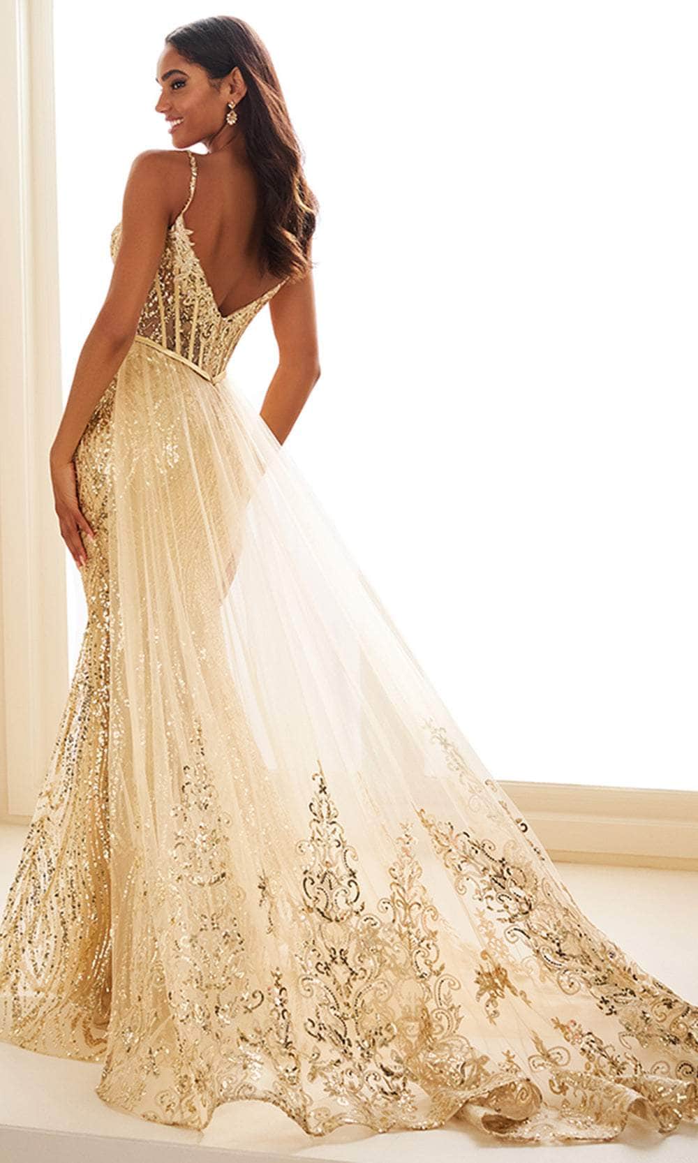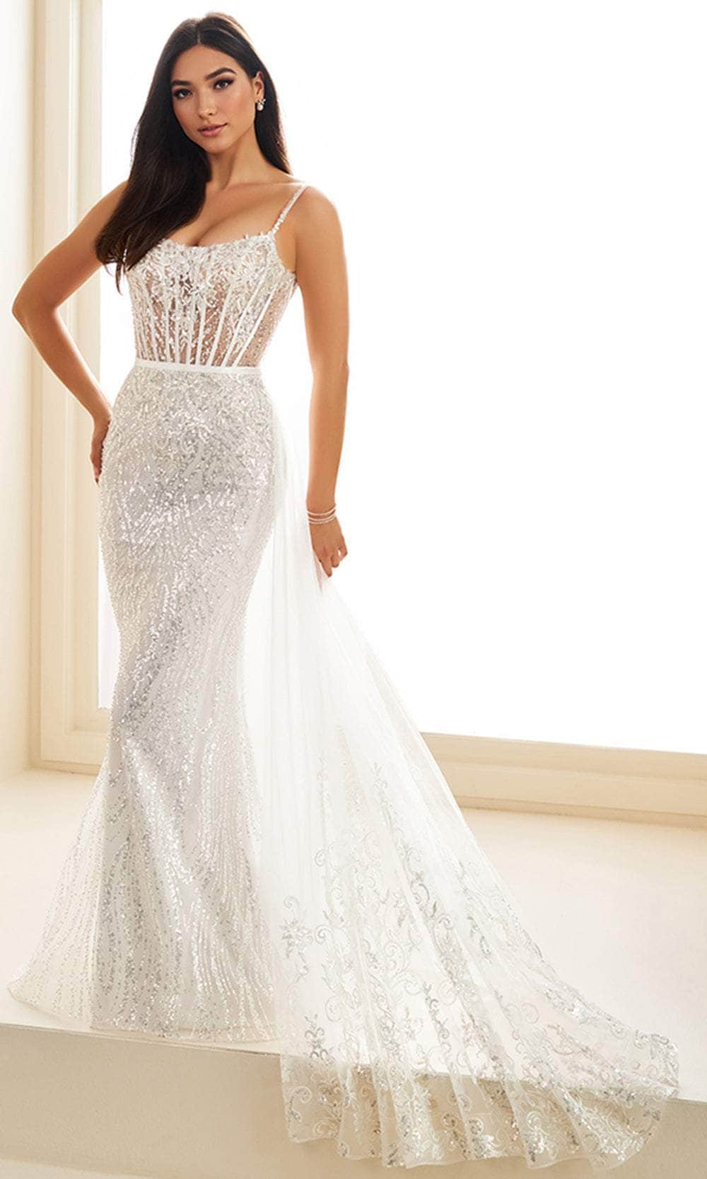 Walk into the hall with elegance and poise in this Ellie Wilde EW36075 gown. Command attention in this sleeveless outfit lavishly adorned with shimmering sequins and detailed embroidery. With spaghetti straps holding it in place, the top bodice presents an appealing scoop neckline, sheer corset boning, and a flattering V-shaped back. The attached A-line overskirt flowing wonderfully into sweeping train and a horsehair hem adds a touch of drama. The sheath skirt finishes off the look by accentuating your natural curves. Make an unforgettable statement by wearing the Ellie Wilde EW36075 masterpiece. Models are wearing Ivory, Black, Gold, Ruby, and Ice Blue colors.