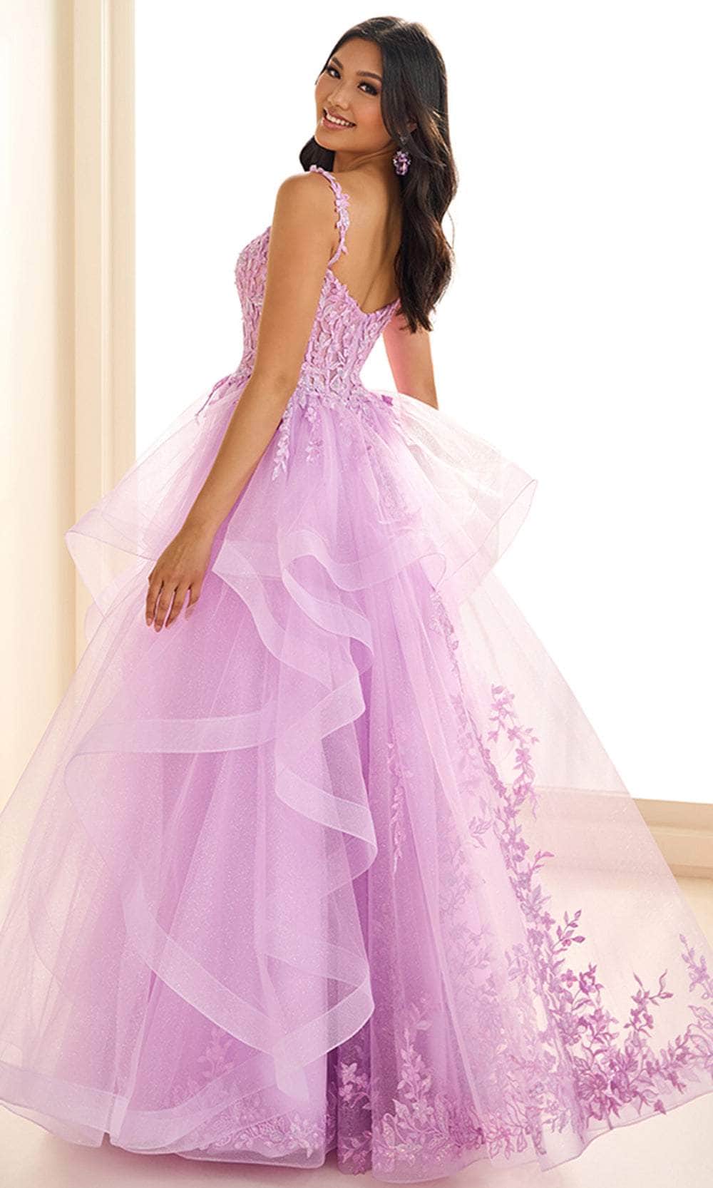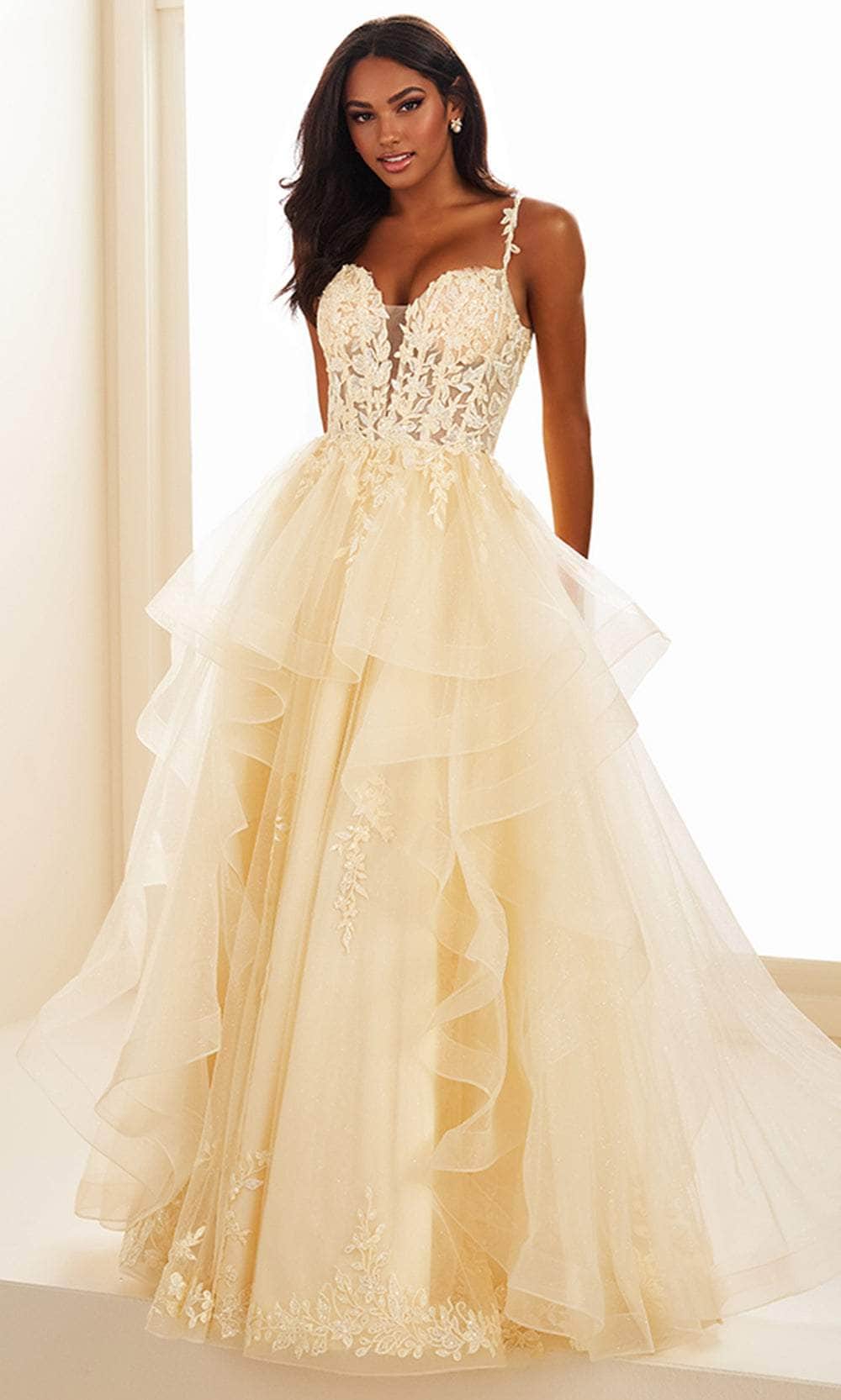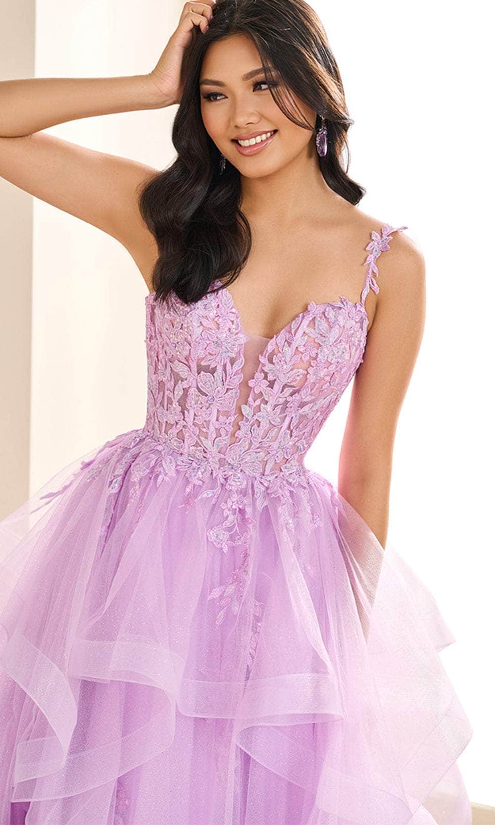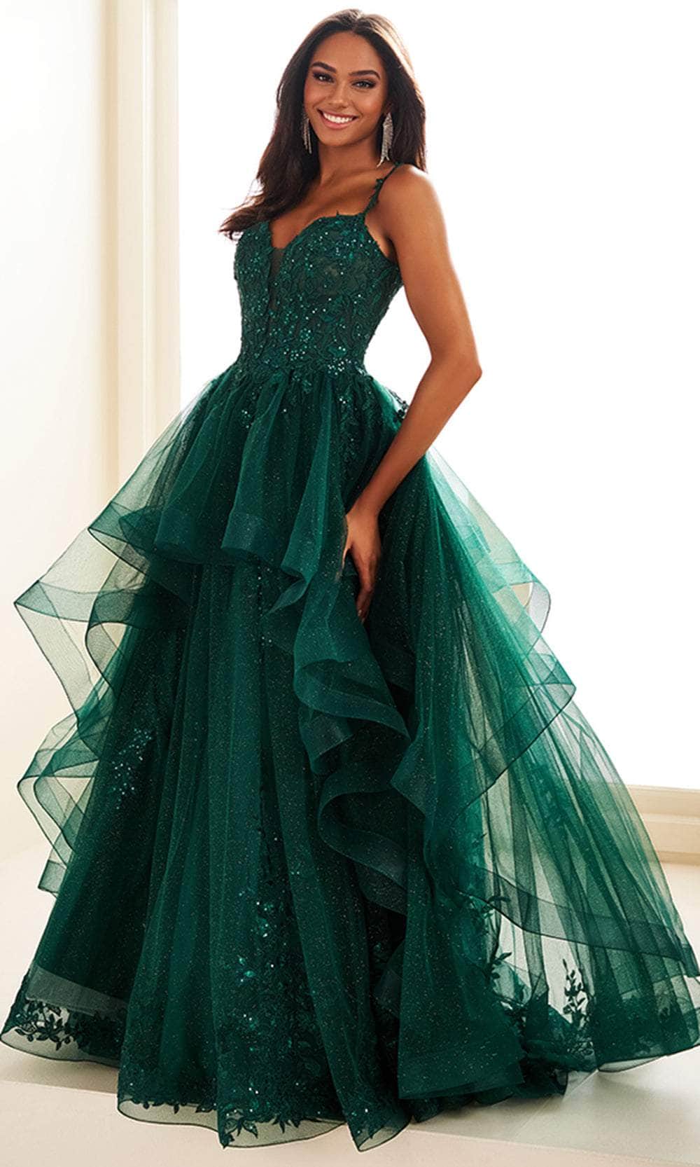 Amplify your beauty in this luxurious gown from Ellie Wilde EW36081. With its glitter tulle fabric and see-through corset boning embellished with sequins and lace appliques, this gown is an undeniable showstopper. The embroidered lace thin straps highlight the shoulders, while the plunging sweetheart neckline perfectly pairs with sexy scoop open back. The A-line skirt stunningly descends to a floor-length hemline, highlighted by playful ruffles and horsehair detailing. Let this extraordinary Ellie Wilde EW36081 creation make you feel like a brilliant star. Models are wearing Emerald, Lilac, and Honeysuckle colors.