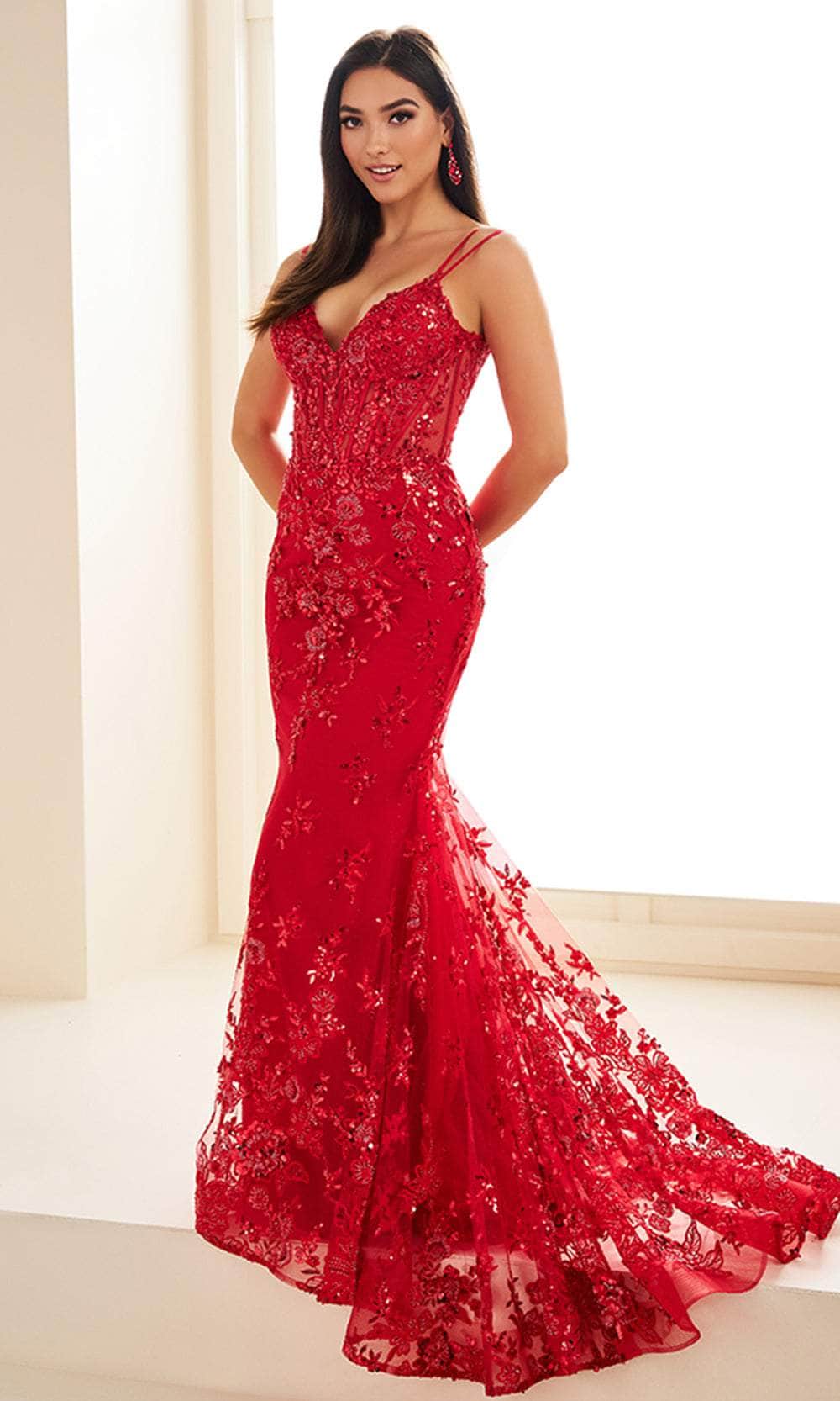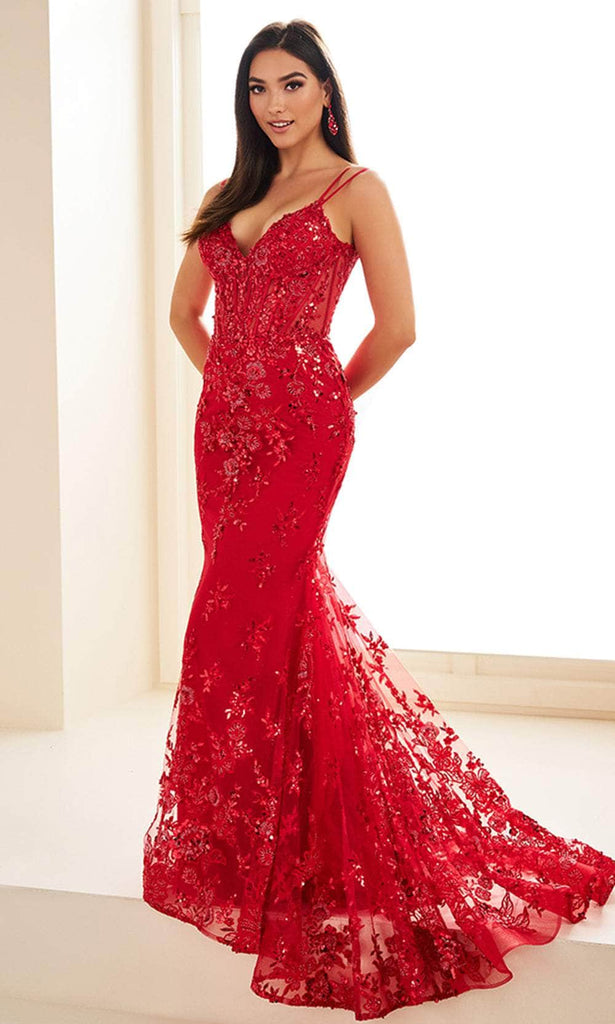 Step out with poise and allure in the Ellie Wilde EW36082 gown, designed for those who wish to steal the spotlight. This sleeveless gown is adorned with floral embroidery, sparkling beads, and sequins that shimmer beautifully with every movement. The dual spaghetti straps add a modern touch, framing the shoulders and leading to a striking low V-shaped back. The sheer corset bodice and deep Sweetheart neckline lend a romantic charm, while the daring diamond-shaped cutout at the back adds an eye-catching twist. The mermaid silhouette flows gracefully to a sweeping train finished with horsehair trim, making this Ellie Wilde EW36082 creation perfect for any unforgettable occasion. Models are wearing Red, Lilac, and Navy Blue colors.