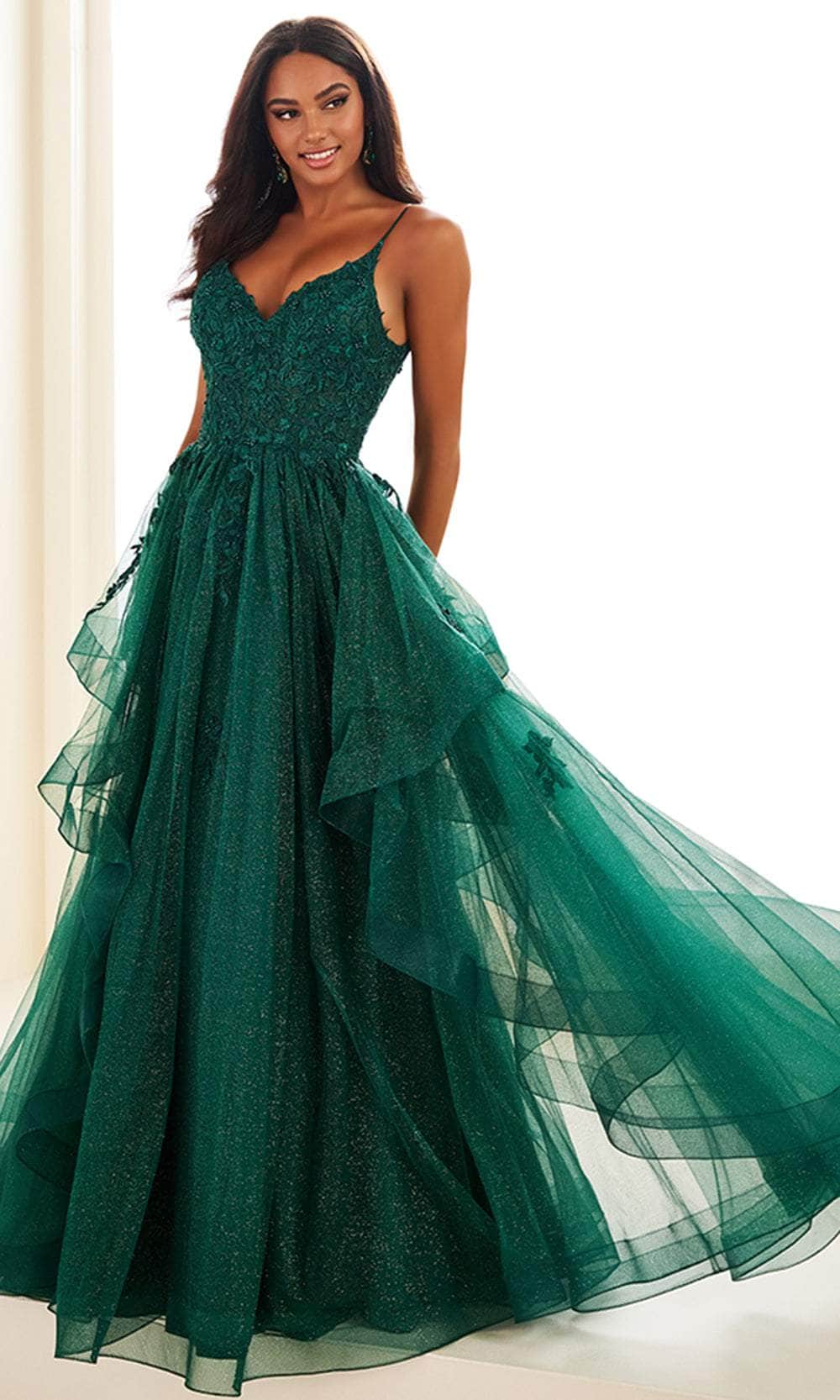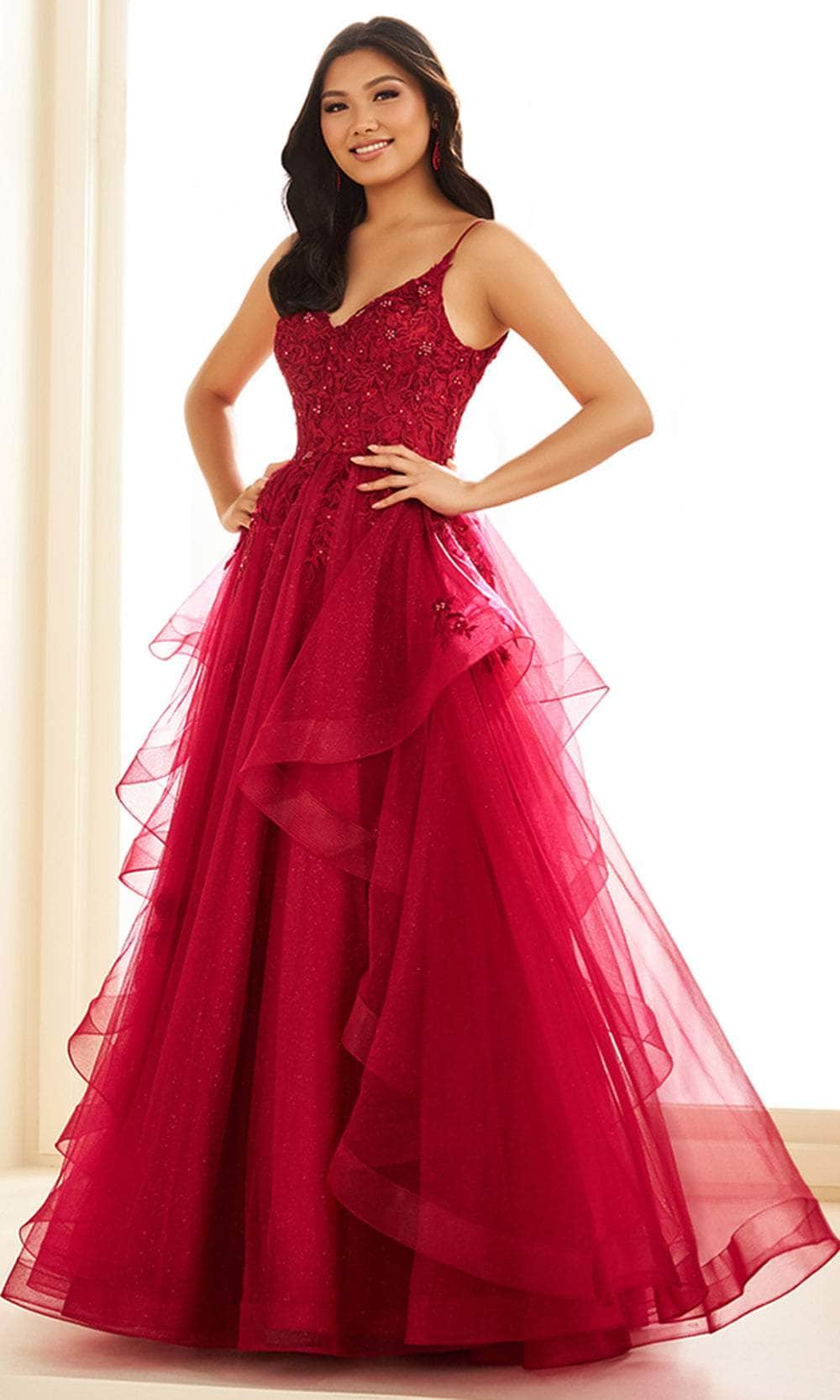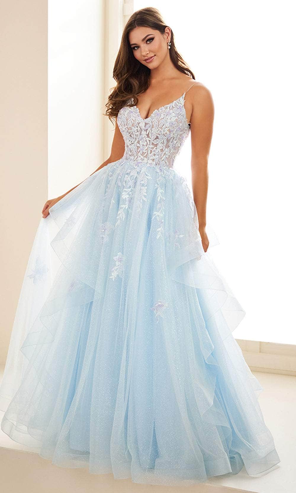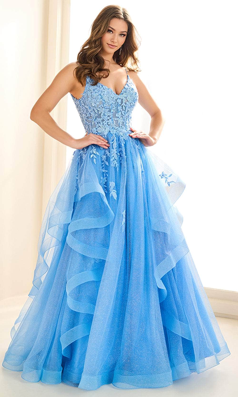 Transform into an enchanted princess when you slip into this Ellie Wilde EW36085 creation. This outfit boasts a sheer corset boning bodice, lace appliques in a floral and leaf pattern, and eye-catching beading detail. Eye-catching details consist of a deep V-neckline and a V-open back, secured by delicate spaghetti straps. The full-length skirt reveals ruffles design on the side and horsehair hem that sets this style apart from the rest. An A-line silhouette completes the ensemble, making it flattering for women of all body types. This Ellie Wilde EW36085 gown is sure to make your event truly remarkable. Models are wearing Emerald, Ice Blue, Indigo, Wine, and Bluebell colors.