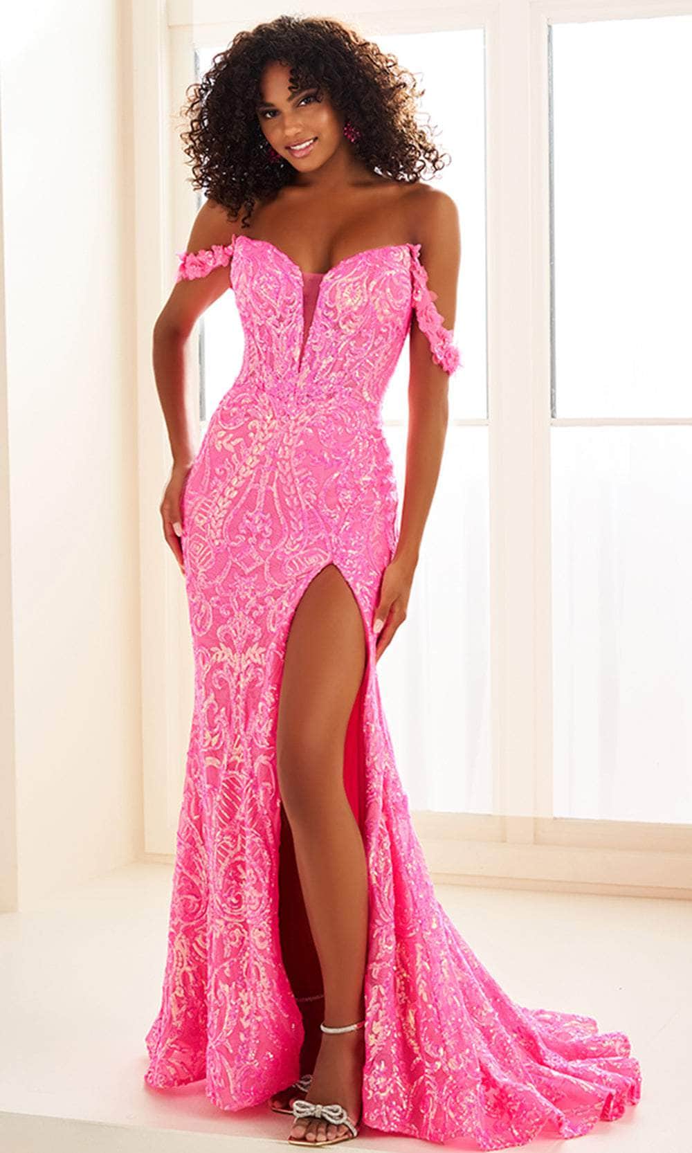 Create unforgettable moments in this beautiful gown from Ellie Wilde EW36087. The intricate sequin embroidery in this gown shimmers and takes center stage, while the draped off-shoulder sleeves are adorned with 3D floral appliques for romantic vibe. The plunging v-neckline with sheer inset detail in the bust accentuate your decolletage. The lace-up design in the open back allows for an adjustable and comfortable fit. As you make your grand entrance, the sheath skirt dramatically flows to the sweeping train and splits on the side to exposed your seductive legs. This Ellie Wilde EW36087 masterpiece is a brilliant pick for any special event. Models are wearing Ocean Blue, Hot Pink, and Lilac colors.