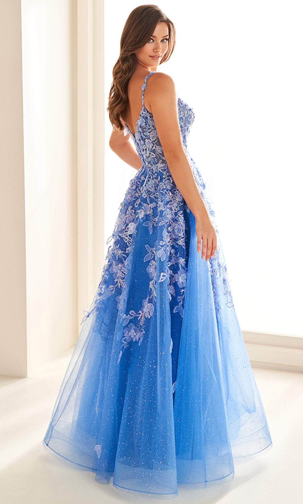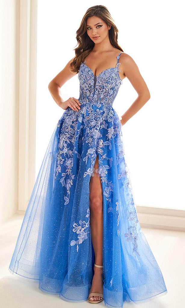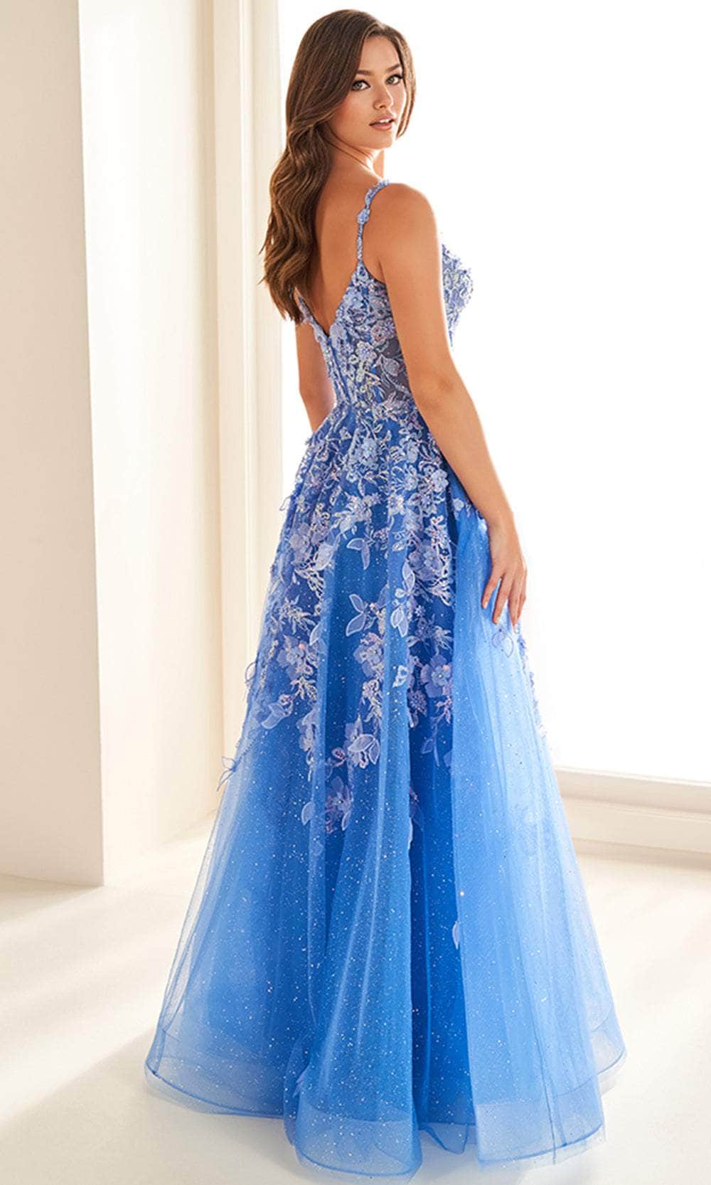 Stand out and be unforgettable in this Ellie Wilde EW36208 masterpiece. This sleeveless gown is crafted from glitter tulle fabric that radiates elegance and glamour. Features are plunging v-neckline paired with matching V-shaped back and thin shoulder straps. For a breathtaking and textured effect, it has array of embellishments including shimmering sequins, beading, embroidery and 3D floral appliques. The skirt flows effortlessly to the floor in a graceful A-line silhouette, ending in structured horsehair hem and a thigh-high leg slit that let you move with ease. Celebrate your special occasion with the unmatched elegance of this Ellie Wilde EW36208 gown. Models are wearing Navy, Barbie Pink, and Blue Moon colors.