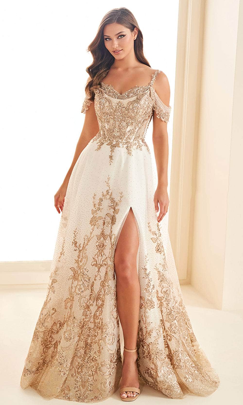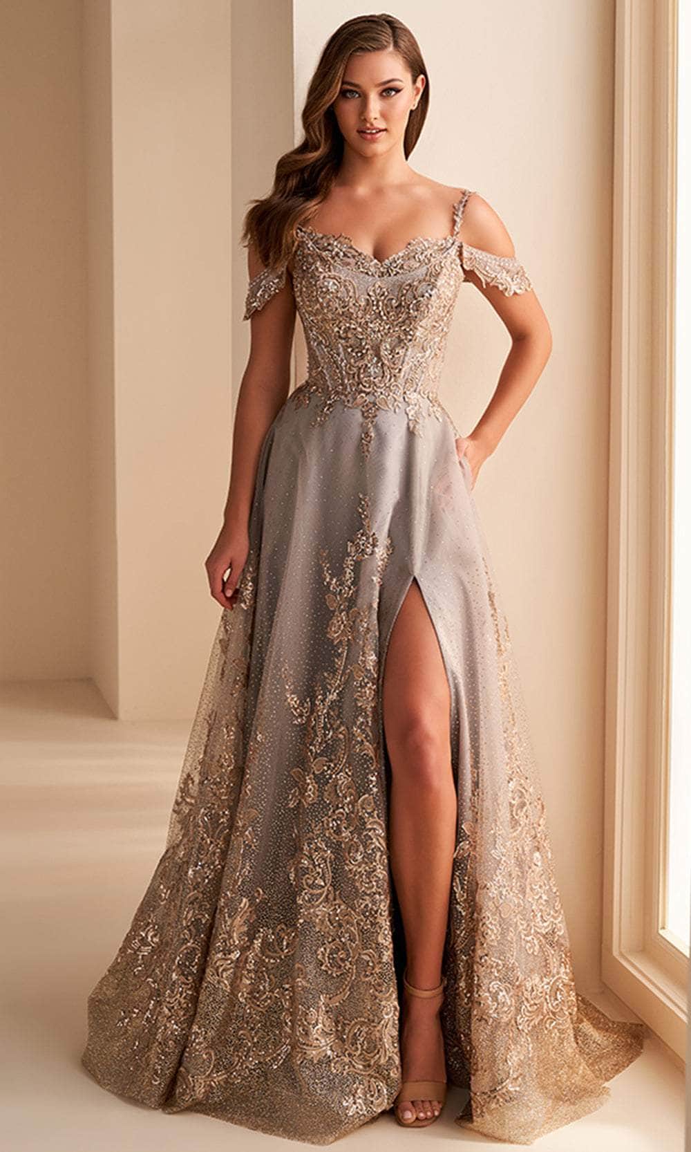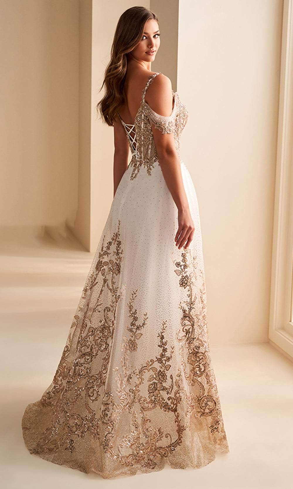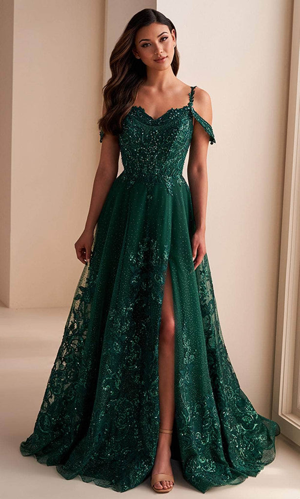 Embrace the unparalleled beauty of this Ellie Wilde EW36220 masterpiece. Adorned with floral embroidery and shimmering beadwork, this sleeveless gown will transform you into a princess. It boasts thin straps, removable off-shoulder straps, and a sweetheart neckline for an enchanting romantic touch. The lace-up tie feature in the open back enables you to adjust the fit to your preference. This skirt streams down in a sweeping train, sculpting an attractive A-line silhouette that suits all women shapes. The look is enhanced by a daring thigh-high leg slit, along with side pockets for extra convenience. Create magical moments as you delight in this Ellie Wilde EW36220 gown. Models are wearing Emerald, Ivory/Gold, and Slate/Gold colors.