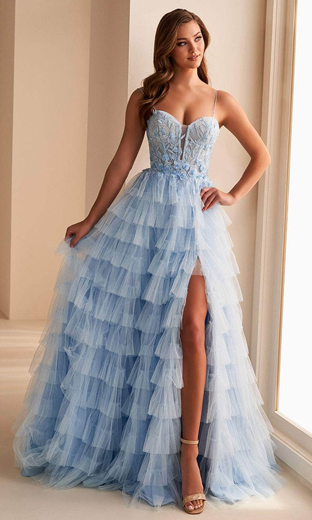 Step into the spotlight with the Ellie Wilde EW36223 gown, a mesmerizing display of artistry and elegance. Lavishly adorned with intricate beading, shimmering sequins, and sparkling stone accents, this dress radiates glamour from every angle. The sleeveless sheer corset bodice, highlighted by a sweetheart neckline and thin straps, adds a touch of romance, while the mid-open back creates a captivating silhouette. The concealed zipper ensures a perfect fit, and the floor-length tiered A-line skirt, complete with a chic leg slit, flows into a graceful train for a truly show-stopping look. Give yourself the appearance and confidence you deserve with this Ellie Wilde EW36223 Models are wearing Dusty Rose and Light Blue colors.