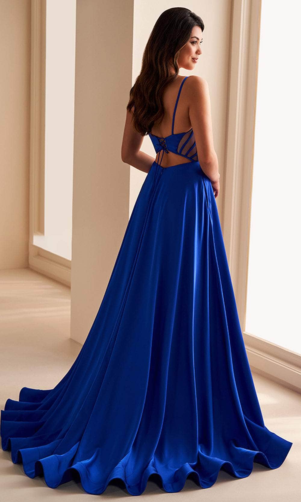 Be the envy of everyone in this classy Ellie Wilde EW36227 creation. Designed to captivate, this sleeveless dress showcases an alluring plunging v-neckline and a corset boning in the bodice for a flattering fit. The sultry open back is highlighted by spaghetti straps and a lace-up tie closure, with a striking diamond cutout detail. Heightened with Basque waist, the wrap skirt unveils a thigh-high slit for seductive leg exposure and finishes in dramatic sweeping train. This Ellie Wilde EW36227 masterpiece is perfect for those who want to make a stylish statement at any event. Models are wearing Royal Blue, Black, Ruby, Spruce, and Lt Periwinkle colors.