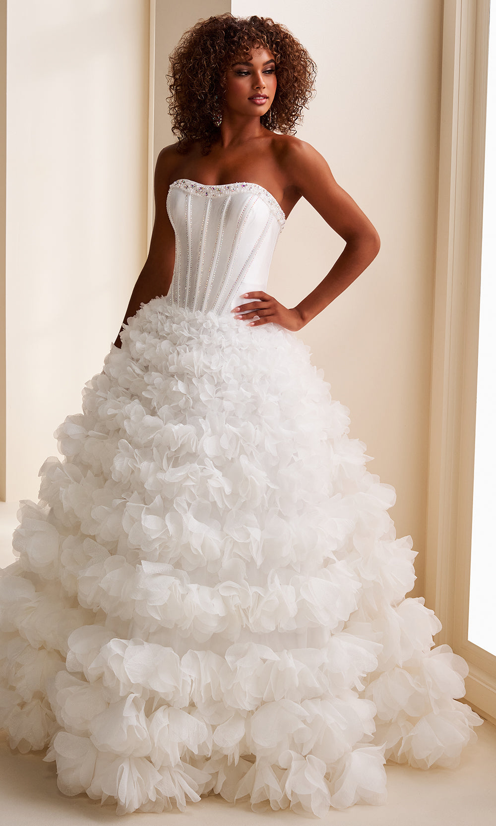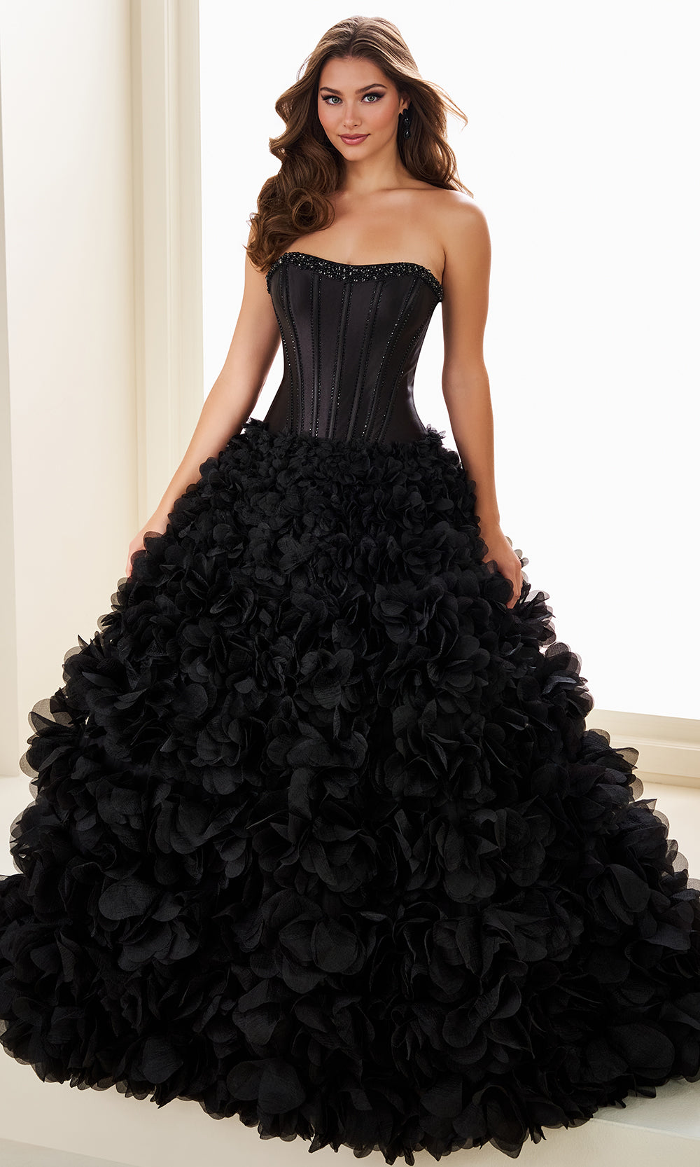A dramatic masterpiece of texture and form, this Ellie Wilde EW37006 ballgown redefines modern glamour. The strapless style showcases a beaded trim corset bodice and semi-sweetheart neckline, paired with a voluminous skirt adorned in three-dimensional floral appliques. The sculpted silhouette enhances natural curves while maintaining an air of sophistication. Each petal detail creates depth and artistry, adding dimension to its classic design. This Ellie Wilde EW37006 gown exudes bold elegance and is ideal for pageants or evening occasions. Models are wearing Ivory, Black, and Petal Pink colors.