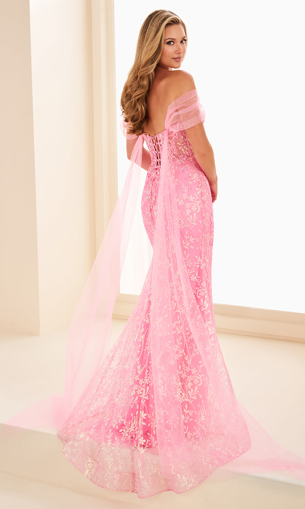 Channel sophistication and charm in the radiant Ellie Wilde EW37030. The fitted ensemble showcases a structured bodice with ornate lace patterns and sparkling sequins, framed by a sweetheart and detachable off-shoulder cape straps. The sheath design complements natural curves, while the sheer tulle overlay flows gracefully into a soft sweep train. A high slit offers movement and allure, making this gown a striking choice for any formal event. This Ellie Wilde EW37030 gown brings a romantic touch to modern elegance. Models are wearing Emerald, Hot Pink, and Lt.Blue colors.