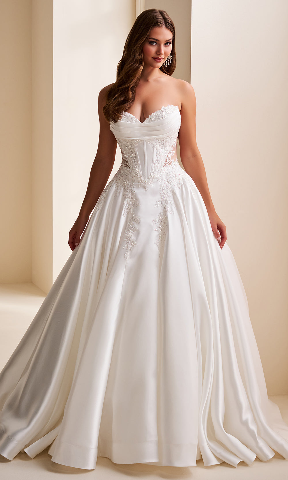 | Details: | Beaded, Lace Applique, Sequin, Strapless, Pockets, Boned Bodice, Detachable Side Modesty Panels |