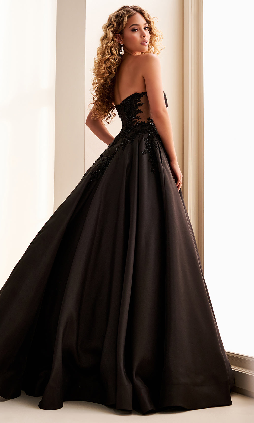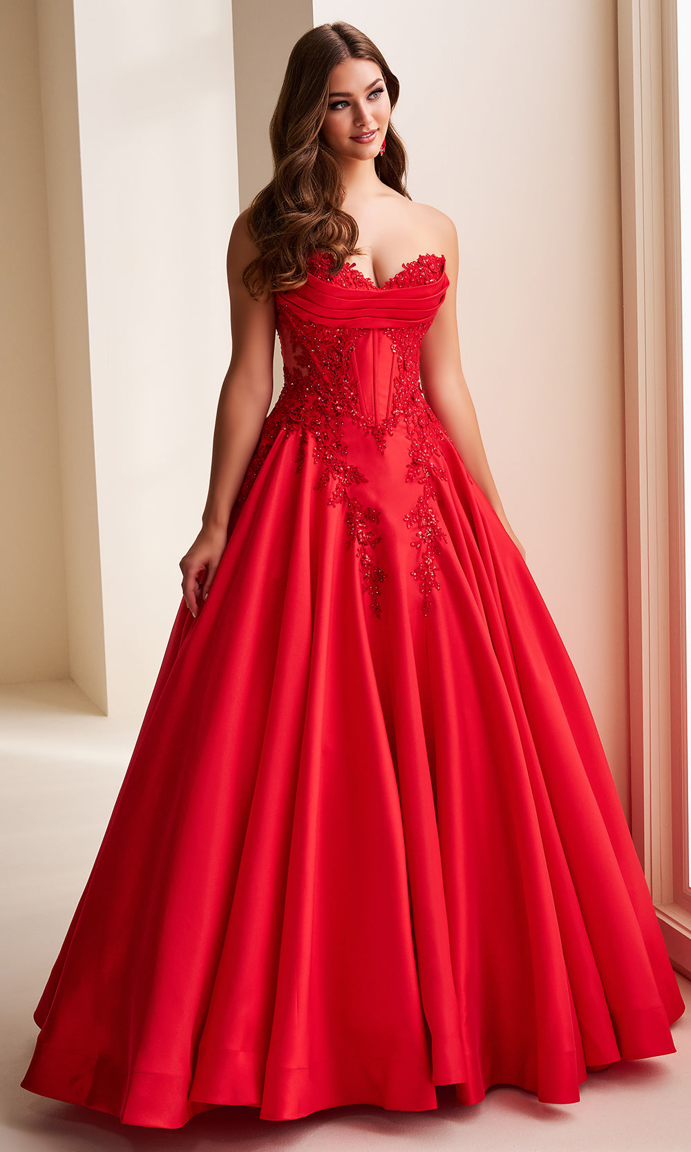 A modern fairytale look unfolds in this Ellie Wilde EW37082 ballgown designed with effortless grace. Crafted in luxurious Mikado, the strapless sweetheart neckline frames a structured corset bodice accented with lace applique and shimmer accents. The fitted top transitions into a voluminous skirt that glides beautifully with every step, creating a timeless and regal impression. Perfect for formal occasions or prom nights, this design embodies feminine sophistication and romantic charm. Experience classic elegance redefined with Ellie Wilde EW37082. Models are wearing Red, Black, Diamond White, and Lt.Blue colors.