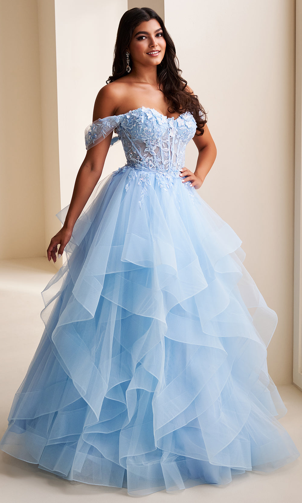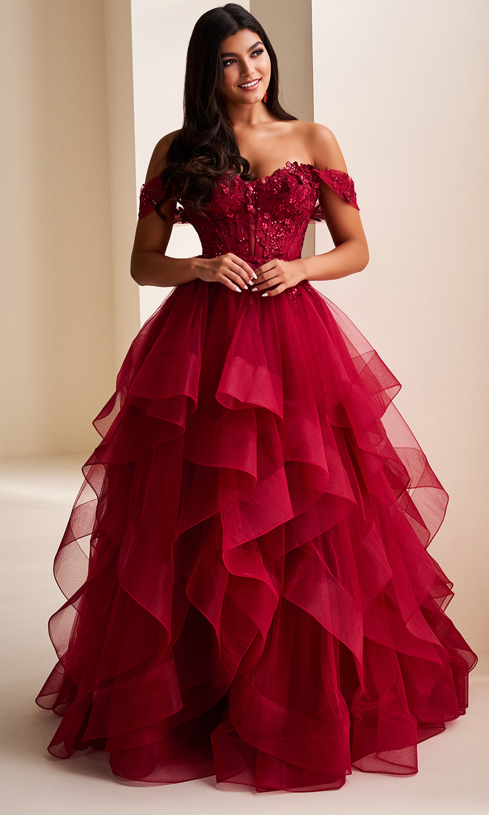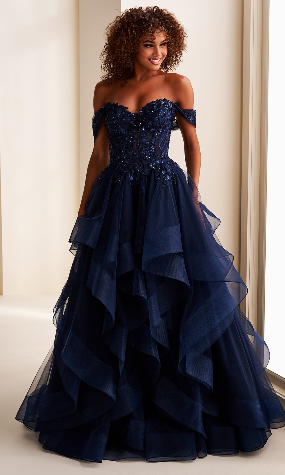 Feel the spotlight embrace you in Ellie Wilde EW37201, a gown crafted to define power, poise, and elegance. With its sweetheart neckline and sheer corset bodice you feel confident and poised, while the short mini length captures playful charm. The detachable long ruffle overskirt and detachable off-shoulder straps bring dramatic flair for a second look. Lace applique, shimmering sequins and 3D floral embellishments dance across soft tulle, complemented by a lace-up back to ensure a perfect fit. Choose Ellie Wilde EW37201 for that unforgettable event where you deserve to shine and celebrate in style. Models are wearing Emerald, Dark Plum, Navy, Wine, Bluebell, Cotton Candy, Lt.Blue, and Honeysuckle colors.